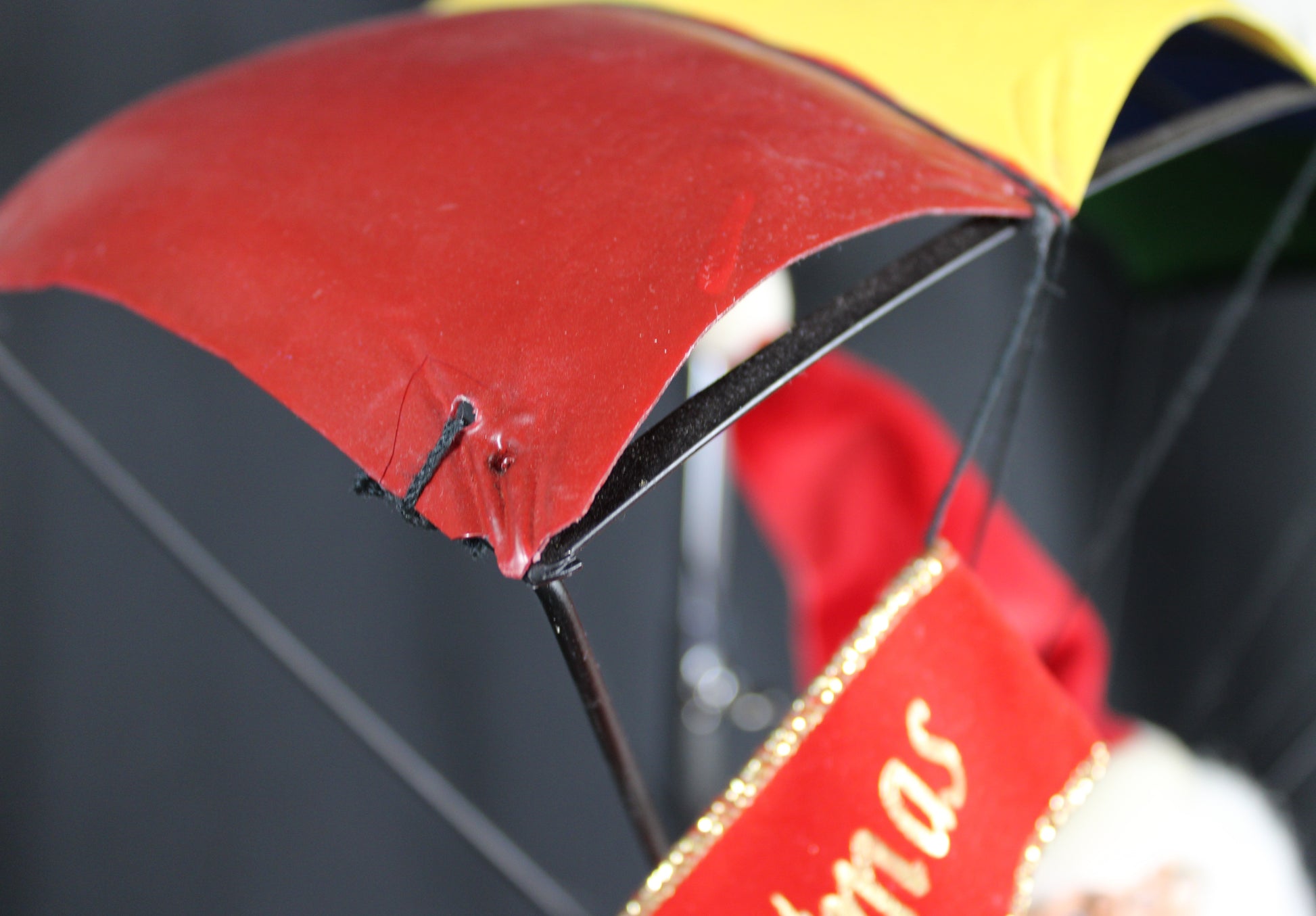 Delight your family and guests with this unique, tested musical Parachute Santa mobile that creates a fun and memorable display. The plush Santa figure is suspended beneath a bright, multi-colored fabric parachute and carries a "Merry Christmas" banner. Ready to hang or display on its included vertical rod, this is a whimsical and attention-grabbing addition to your holiday decor. This item has been tested and is in working condition.