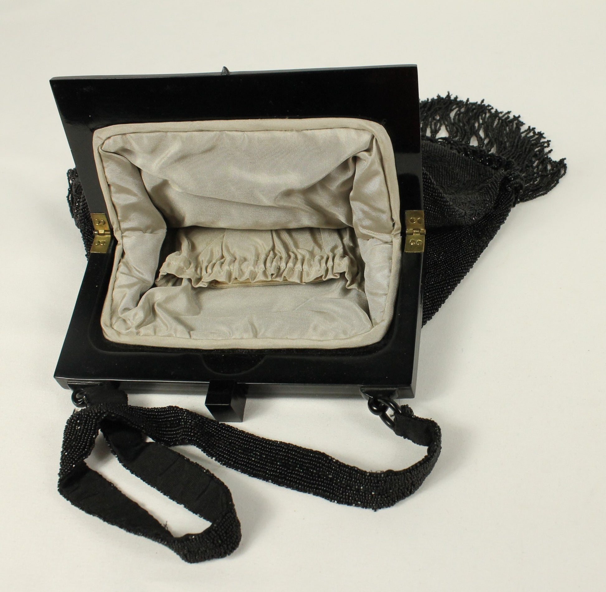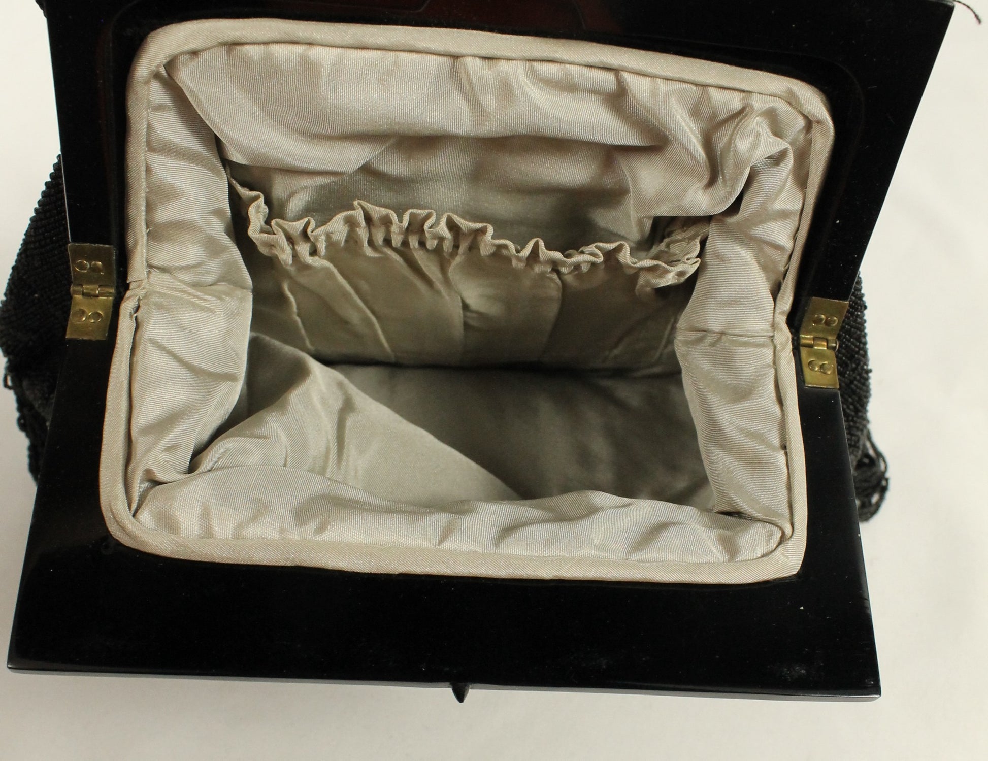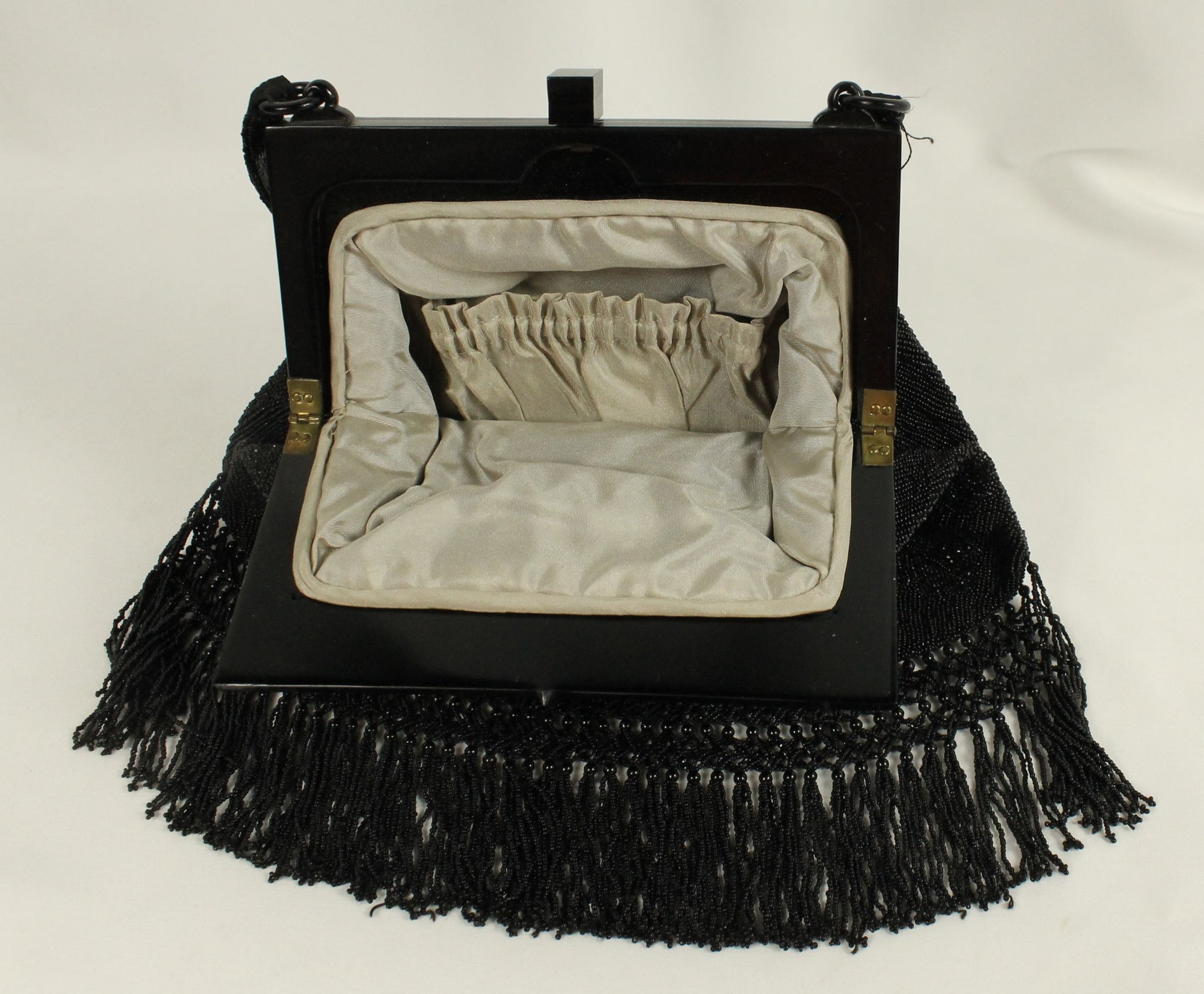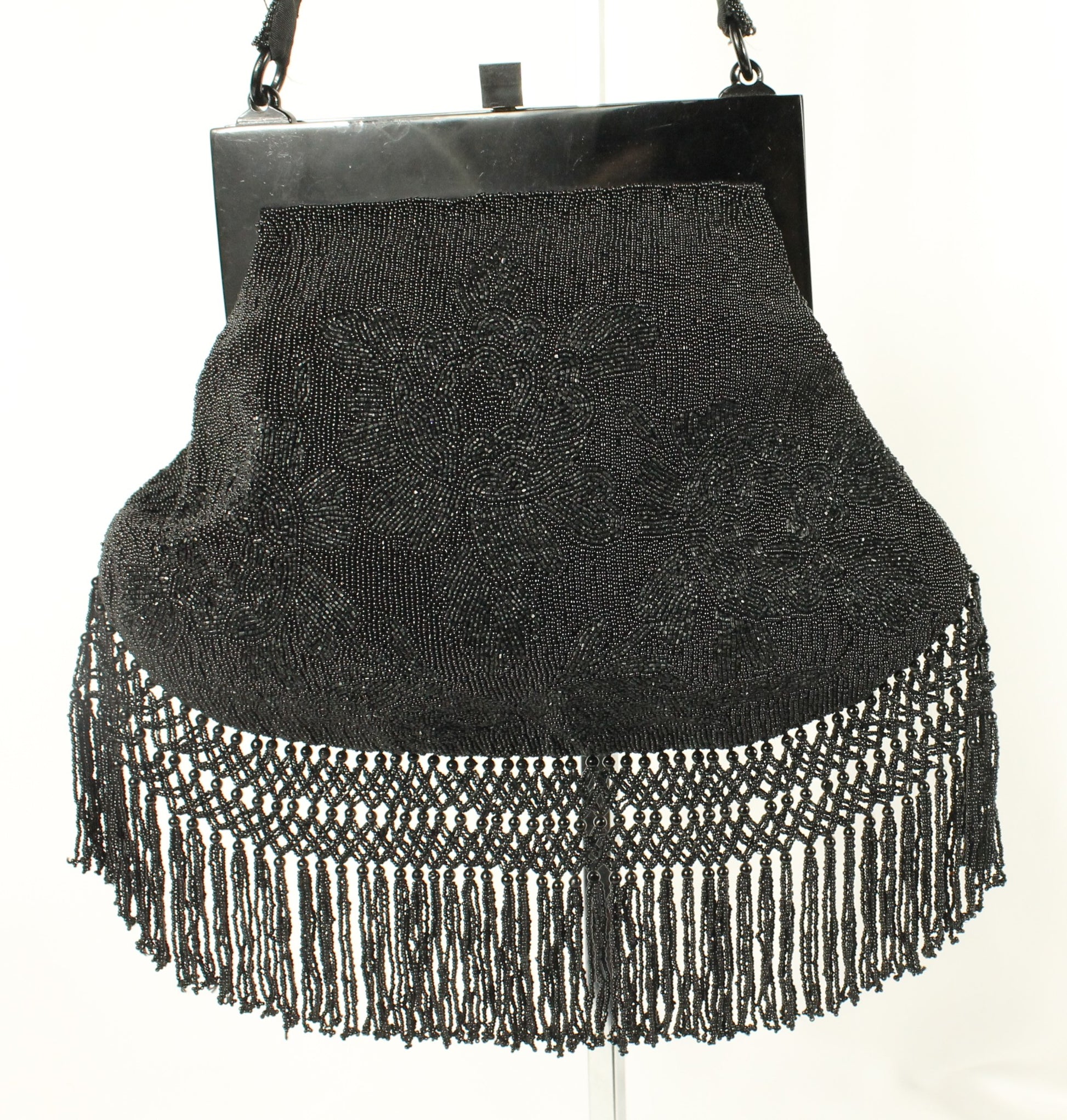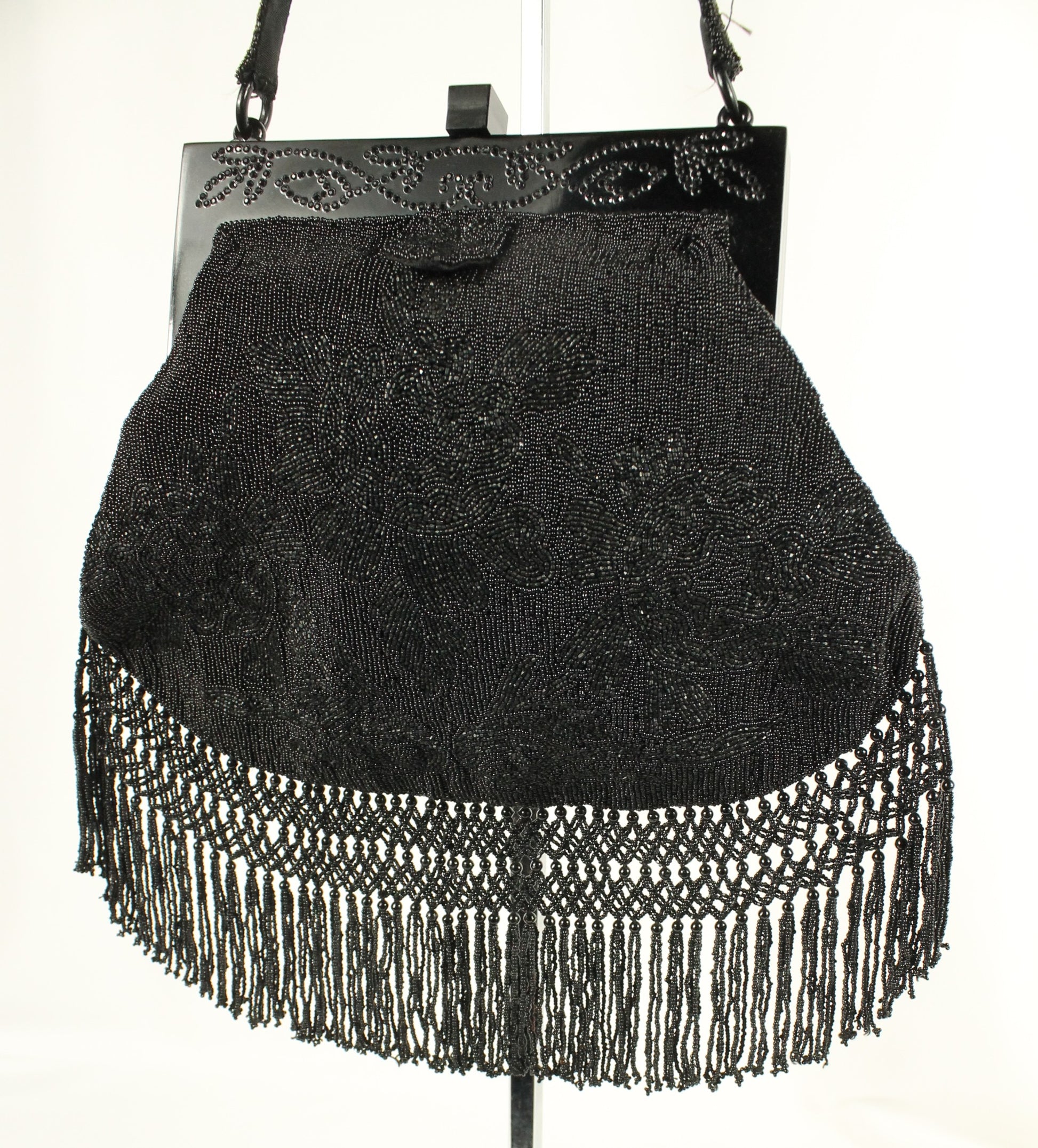 Vintage Black Micro-Beaded Evening Bag with Fringe | Art Deco Style Lucite/Celluloid Frame & Closure