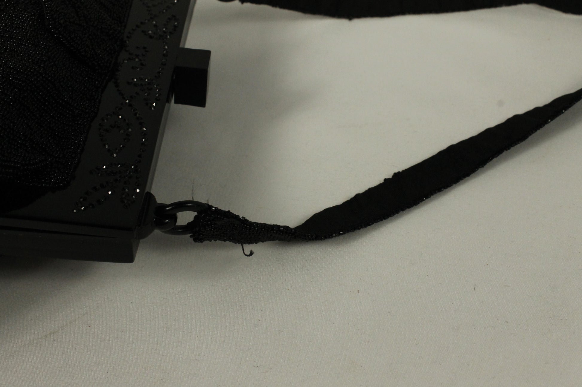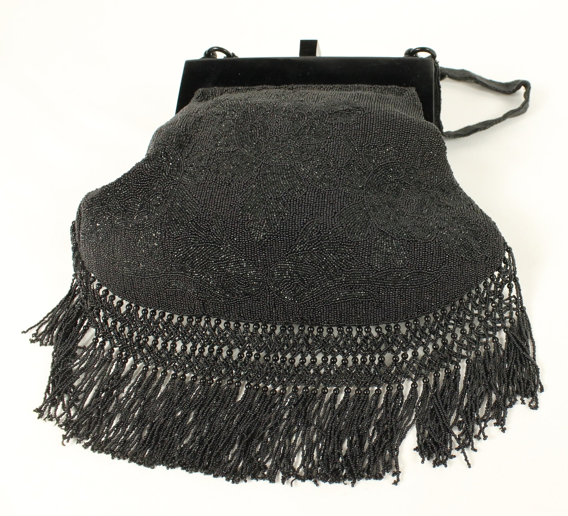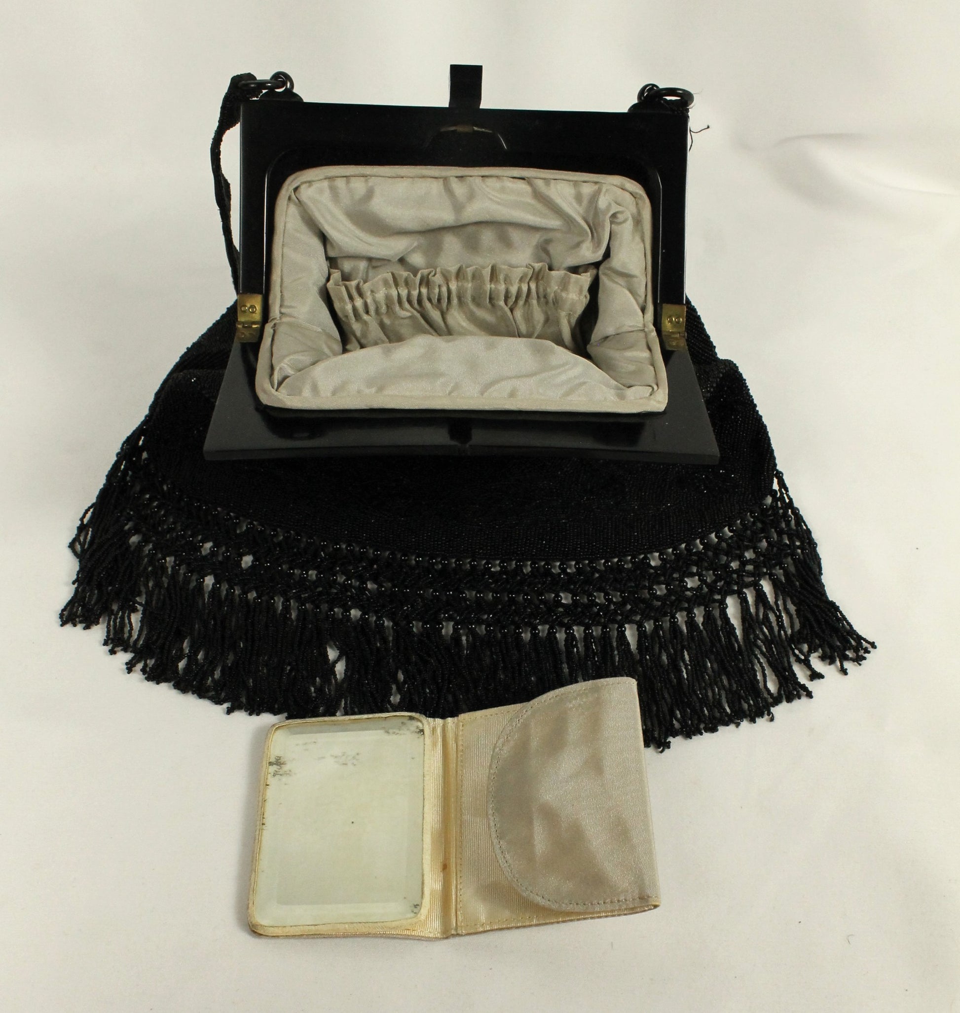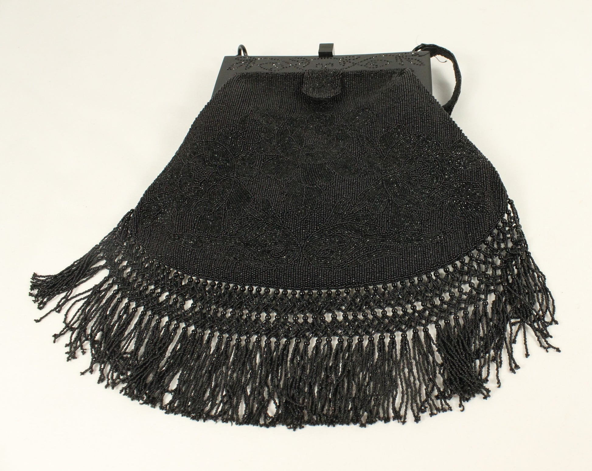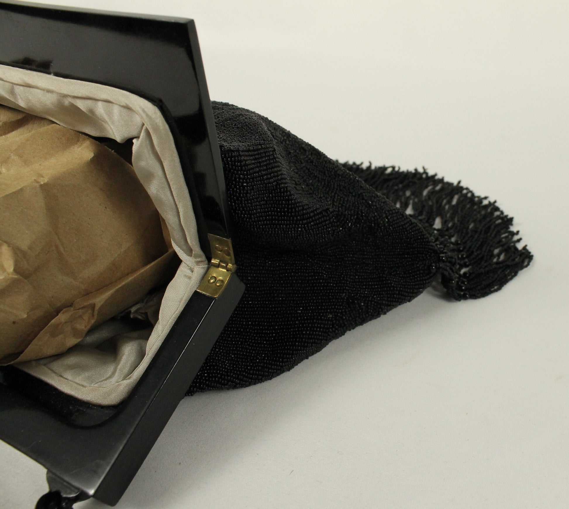 Vintage Black Micro-Beaded Evening Bag with Fringe | Art Deco Style Lucite/Celluloid Frame & Closure
