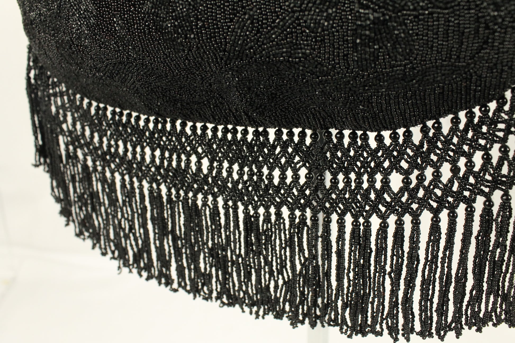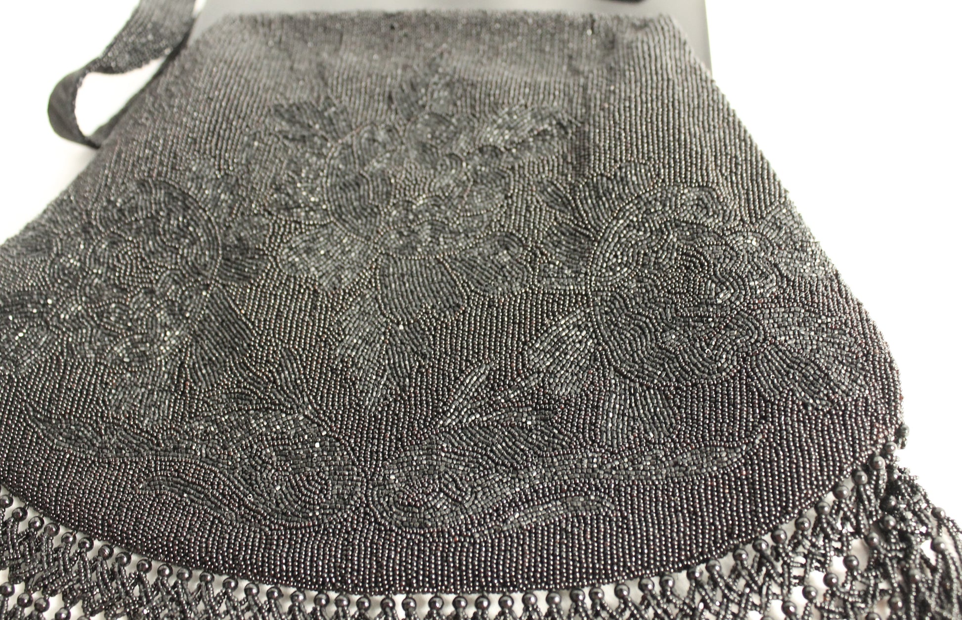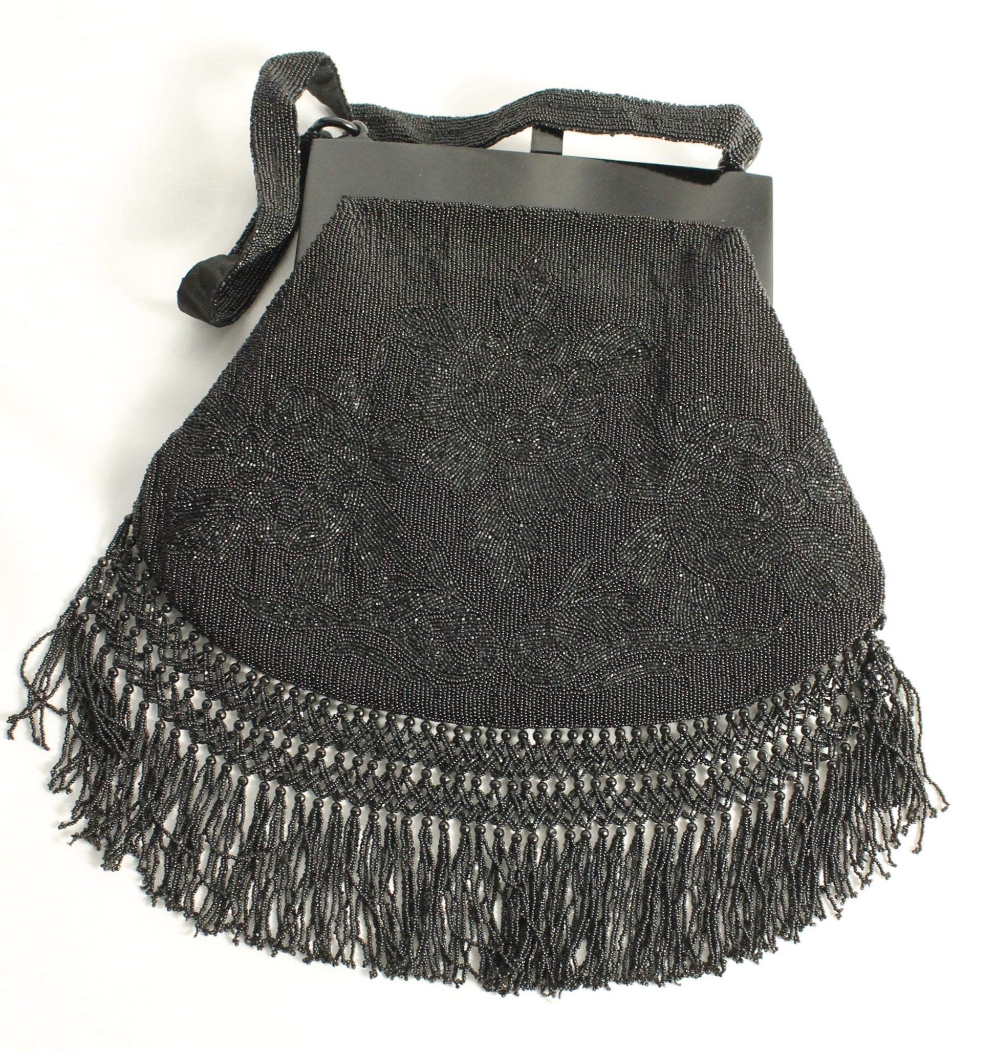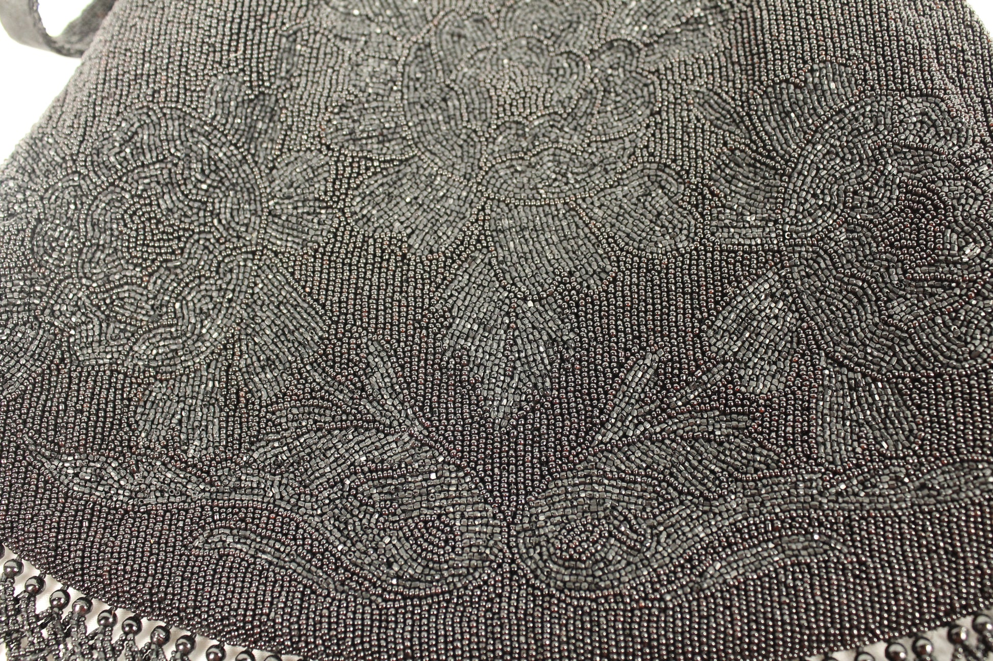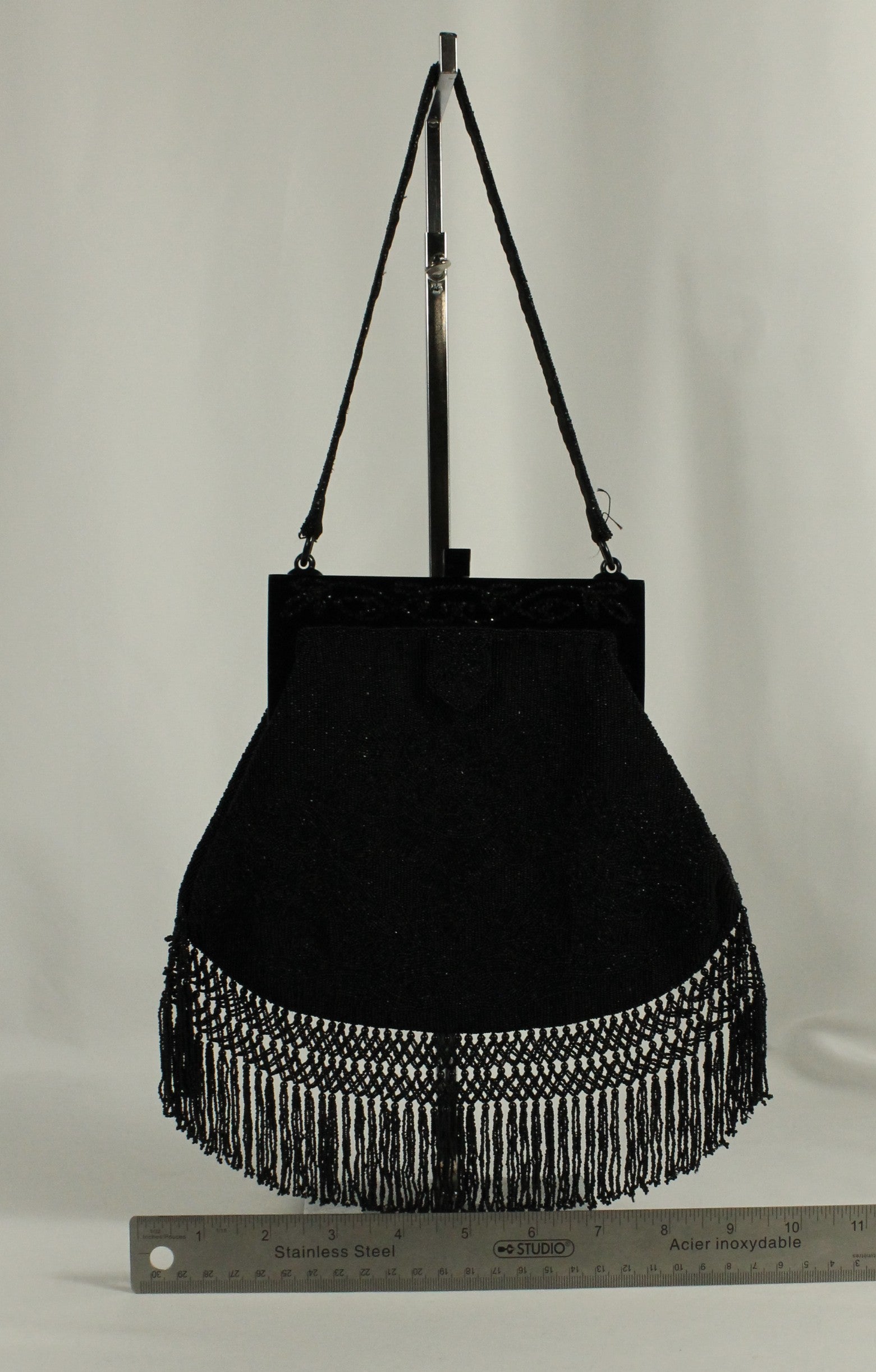 This shimmery black-beaded evening bag will make a statement on your next night out. With the beaded fringe, this bag has a signature look from the flapper and Art Deco eras, and is in great vintage condition.