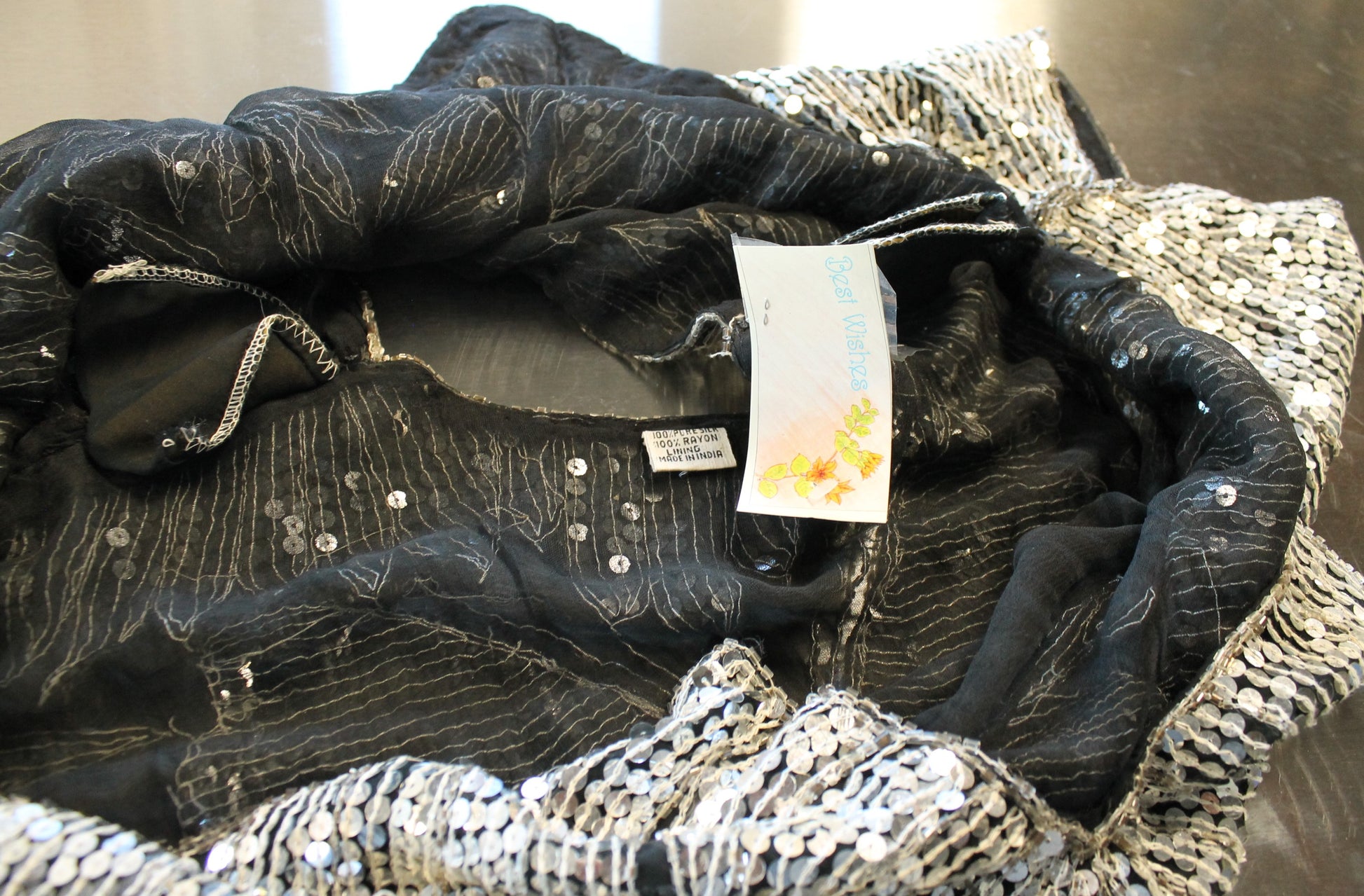Turn heads with this silver sequin butterfly top. This shirt is likely a size small with an oversized fit, and is made from 100% silk with a 100% nylon lining.