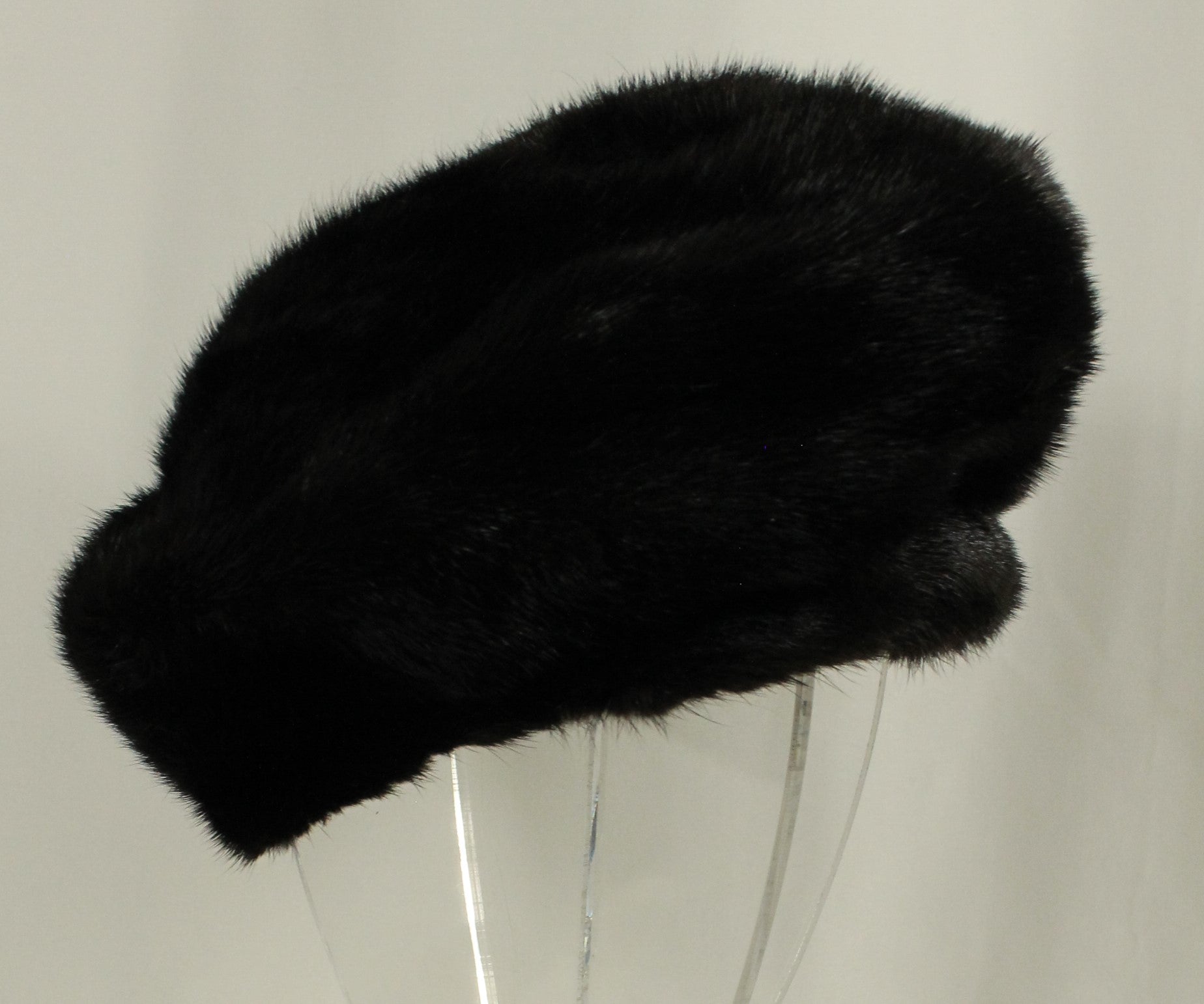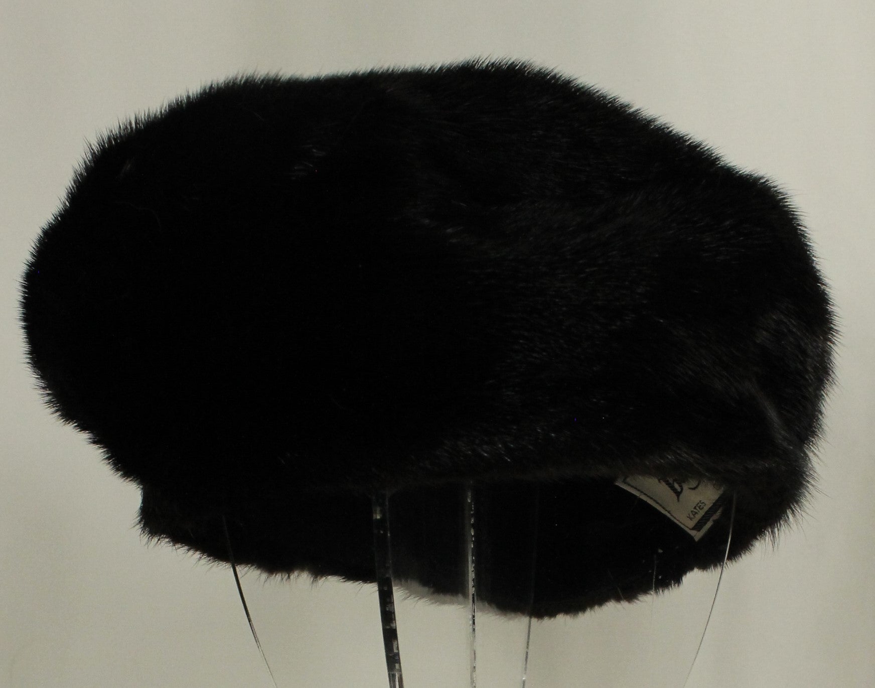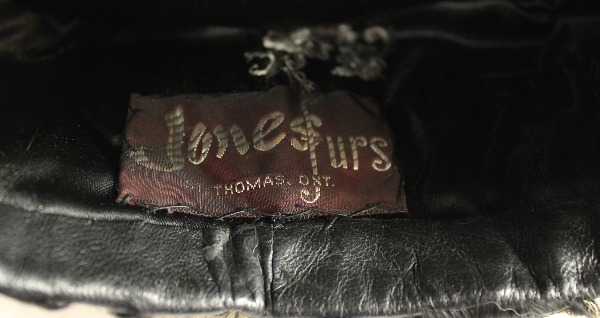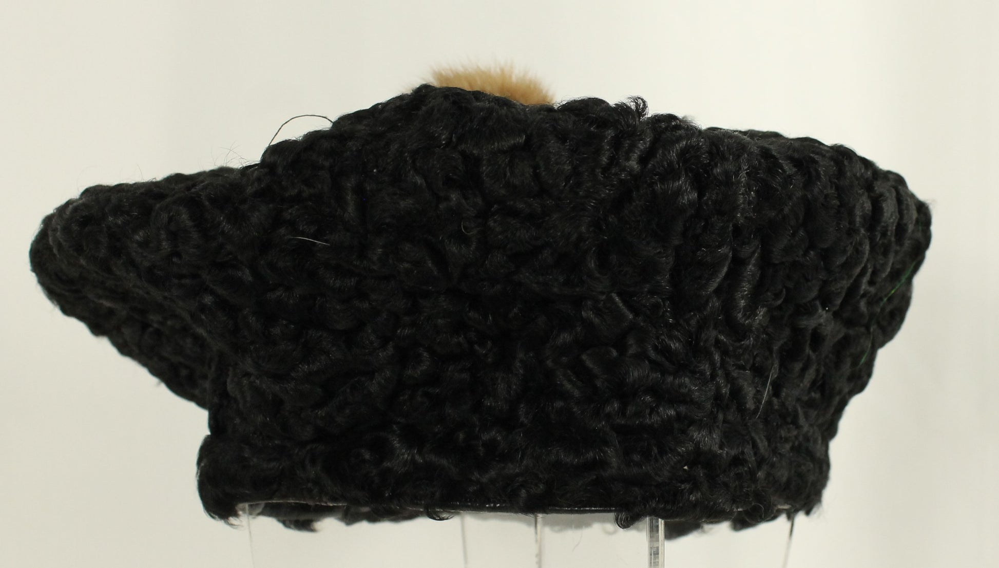- Black curly fur beret with a brown pom-pom, lined in satin, labeled Jones Furs, St. Thomas, Ont.
