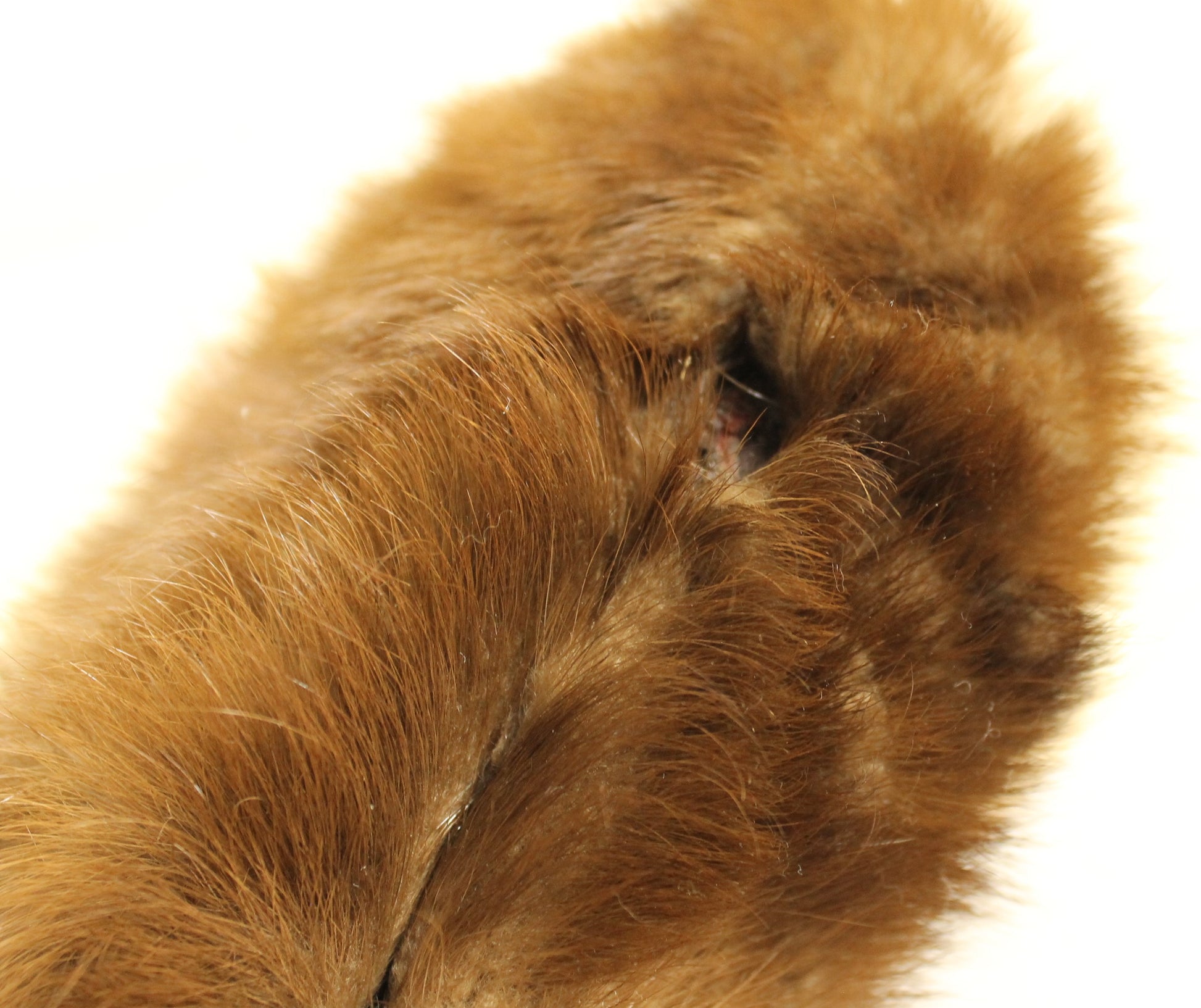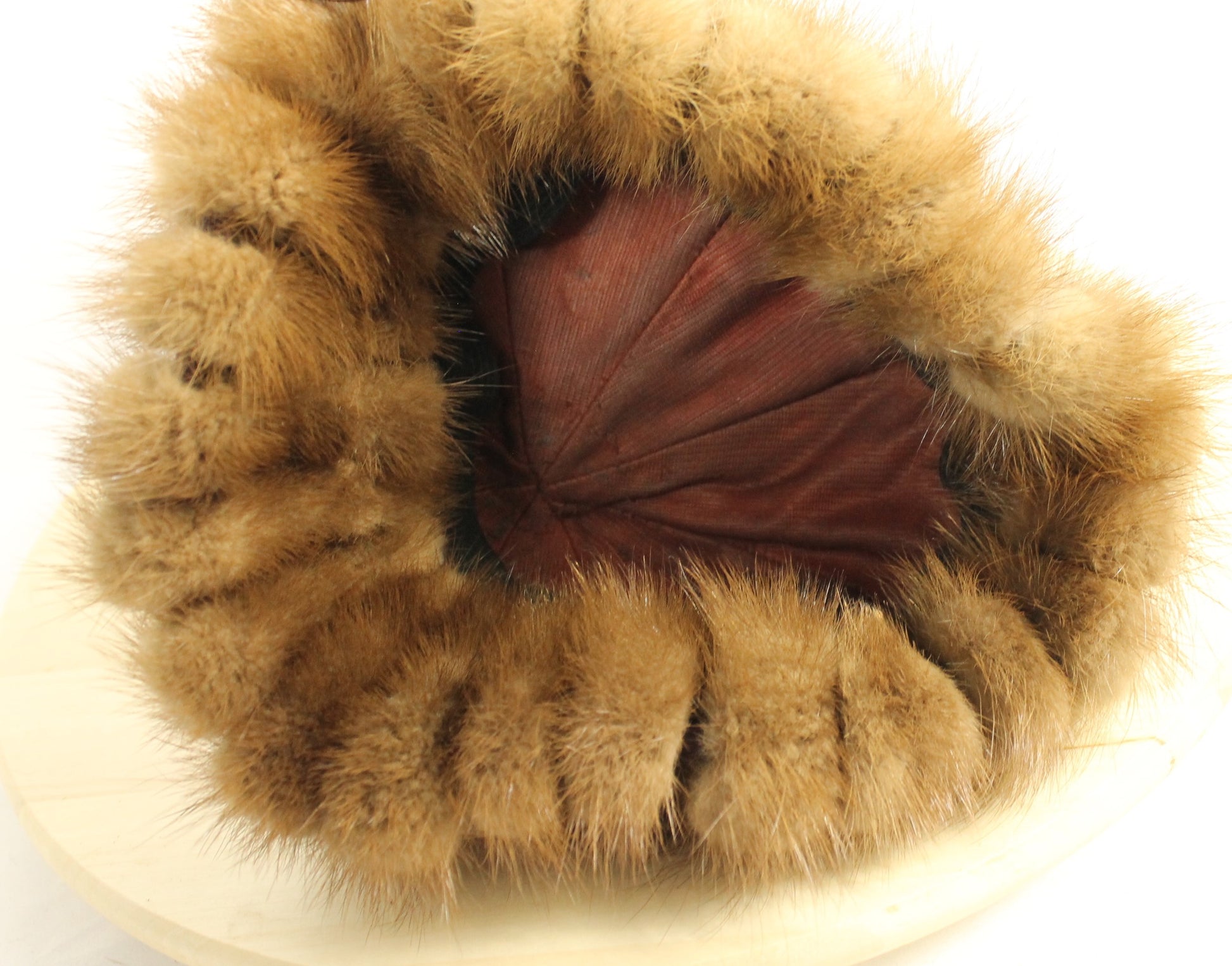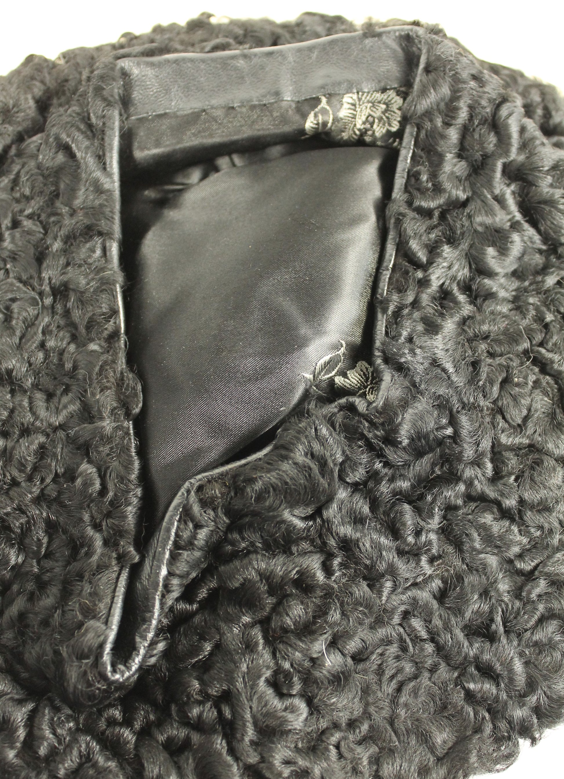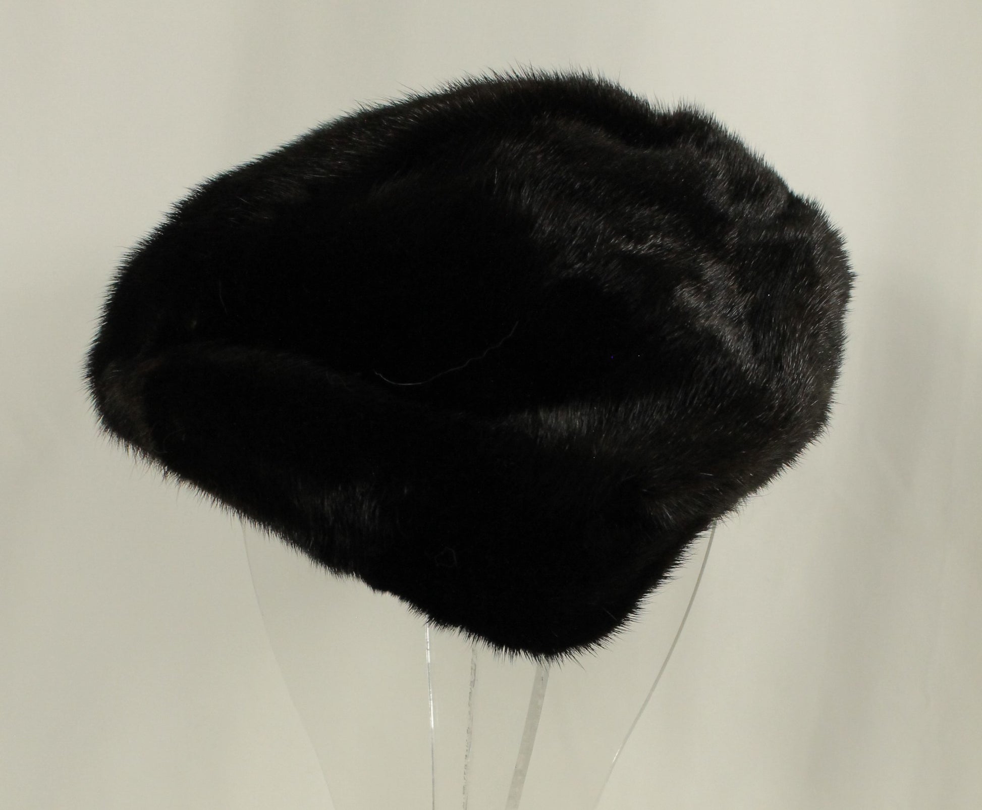 - Black curly fur beret with a brown pom-pom, lined in satin, labeled Jones Furs, St. Thomas, Ont.