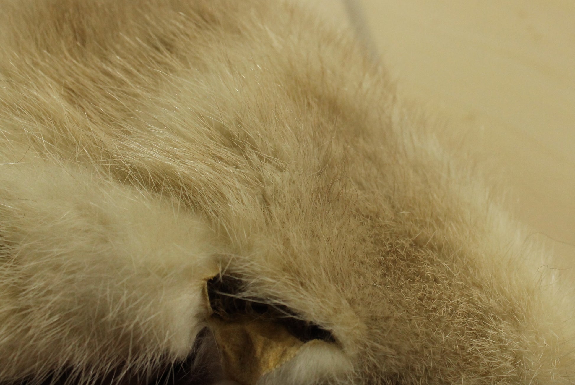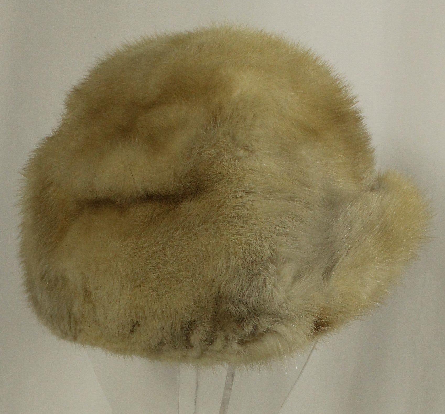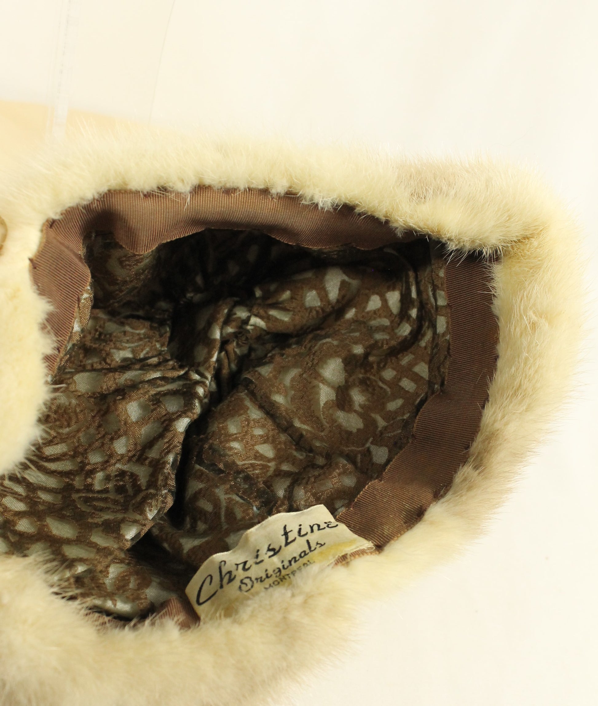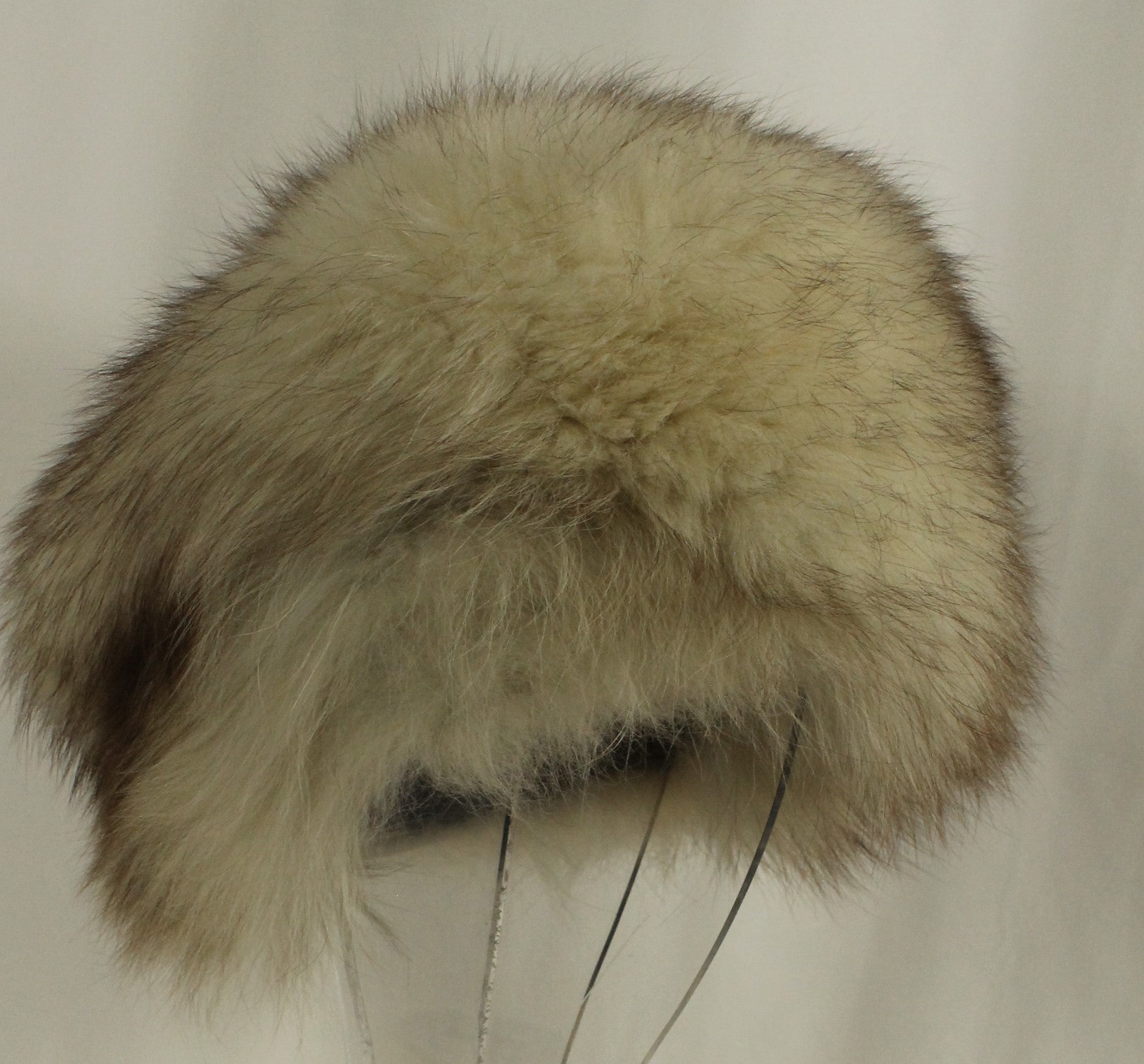 - Beige rounded fur hat with ornate lining, labeled A Boutique Hates Canada.