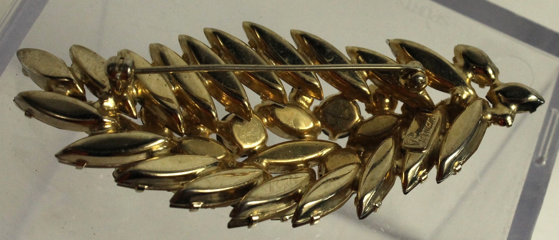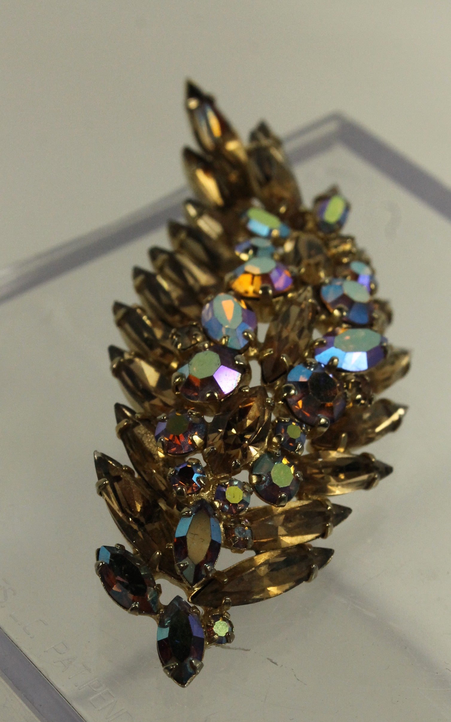 Spectacular Vintage Sherman Brooch - Champagne Topaz & Aurora Borealis AB Crystal Leaf/Feather Pin