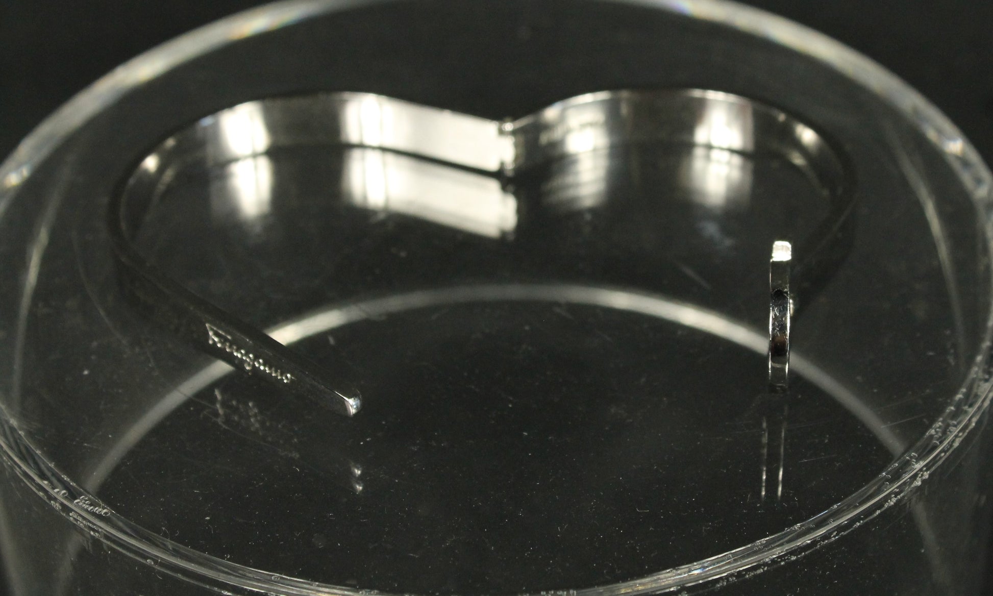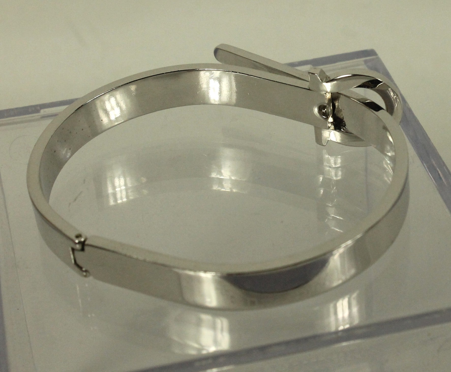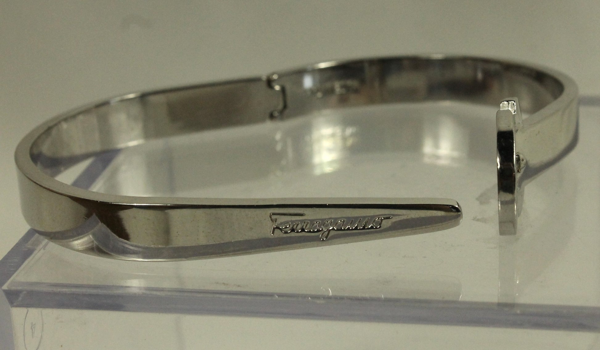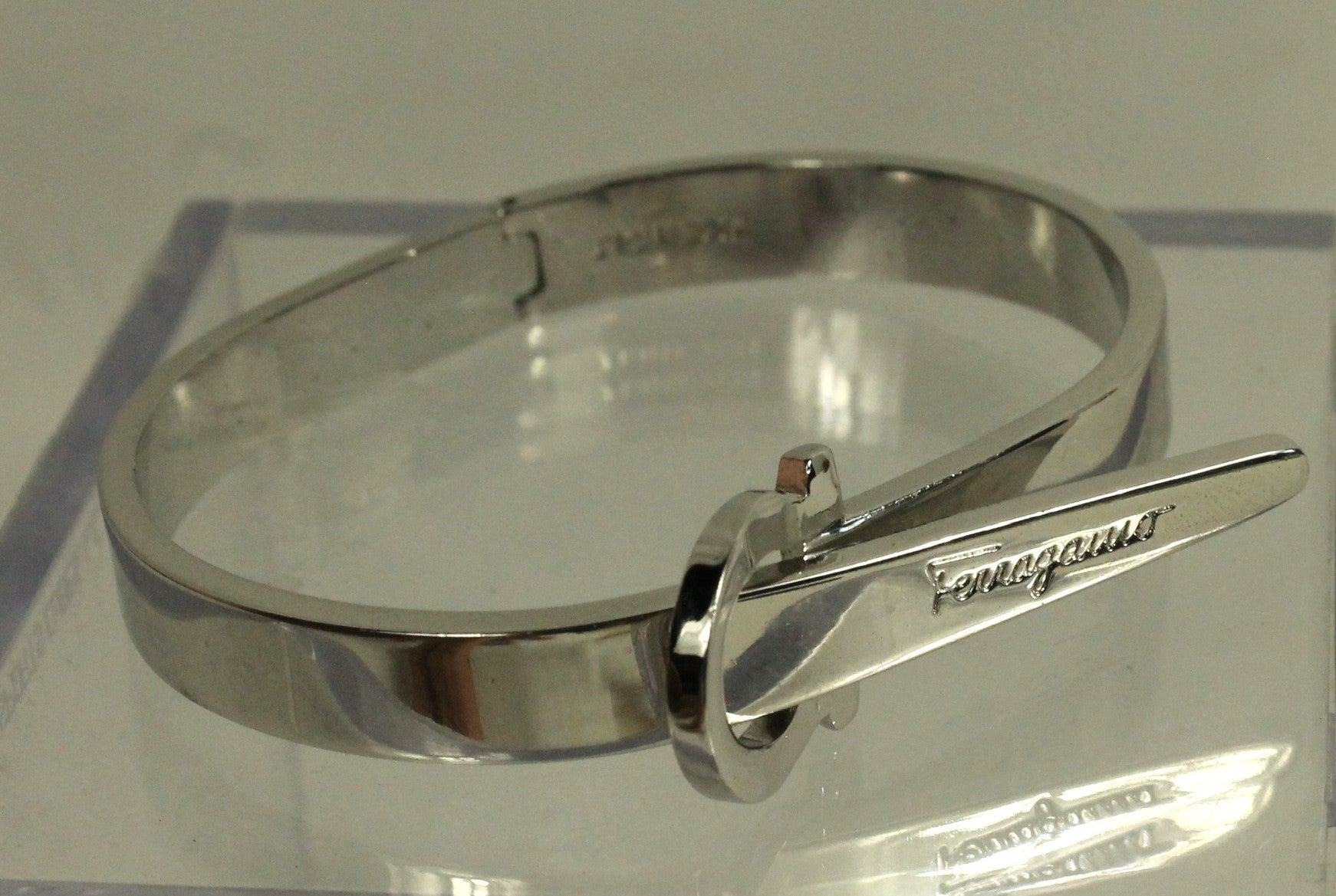 This bracelet is a polished, silver-tone bangle or cuff style that features an elegant belt buckle closure. The piece is signed (but unauthenticated) with the Ferragamo logo clearly engraved on the buckle's tongue. This versatile piece is perfect for stacking with other jewelry or wearing alone. The bracelet comes in its original white presentation box, making it an excellent gift or a valuable addition to any jewelry collection.