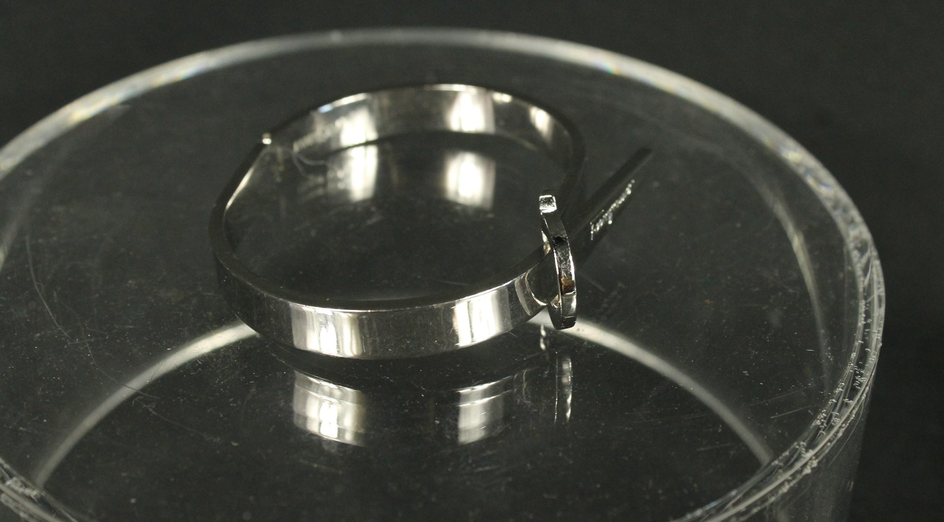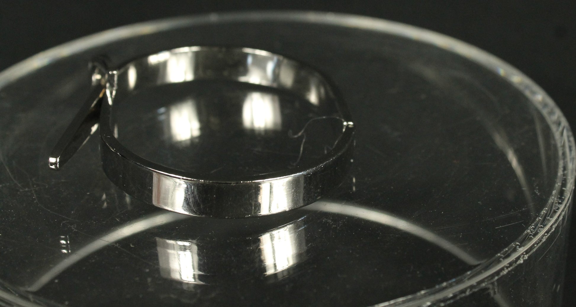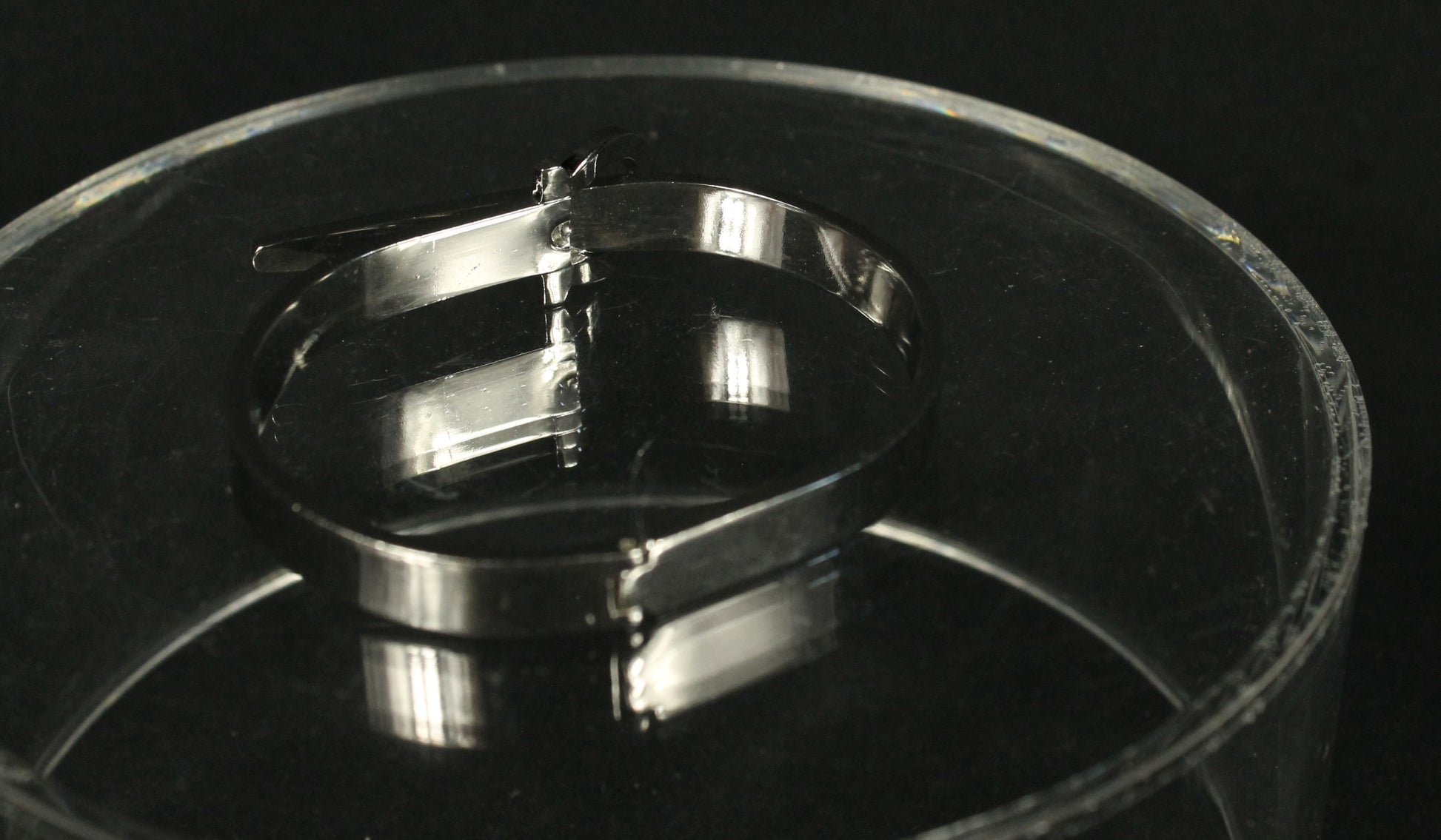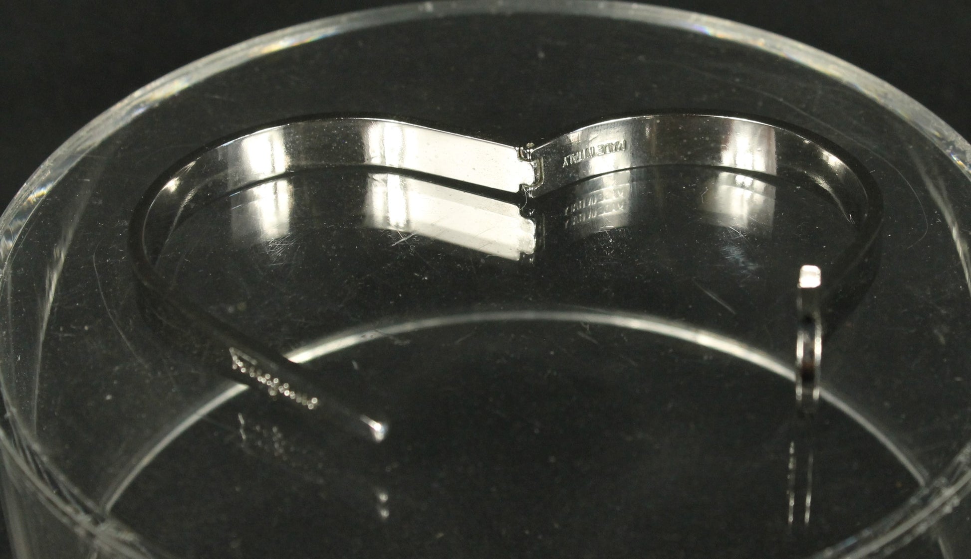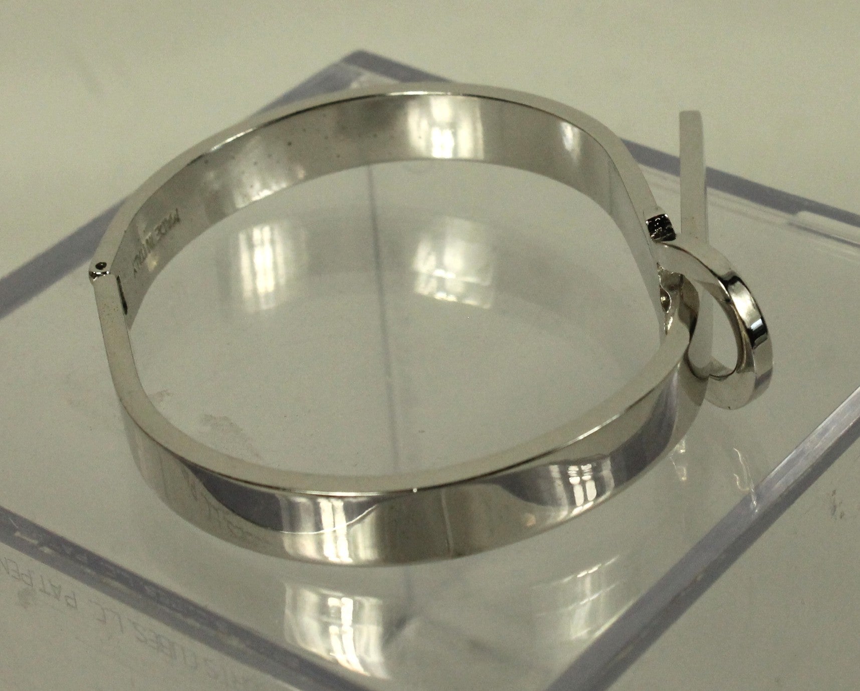 This bracelet is a polished, silver-tone bangle or cuff style that features an elegant belt buckle closure. The piece is signed (but unauthenticated) with the Ferragamo logo clearly engraved on the buckle's tongue. This versatile piece is perfect for stacking with other jewelry or wearing alone. The bracelet comes in its original white presentation box, making it an excellent gift or a valuable addition to any jewelry collection.