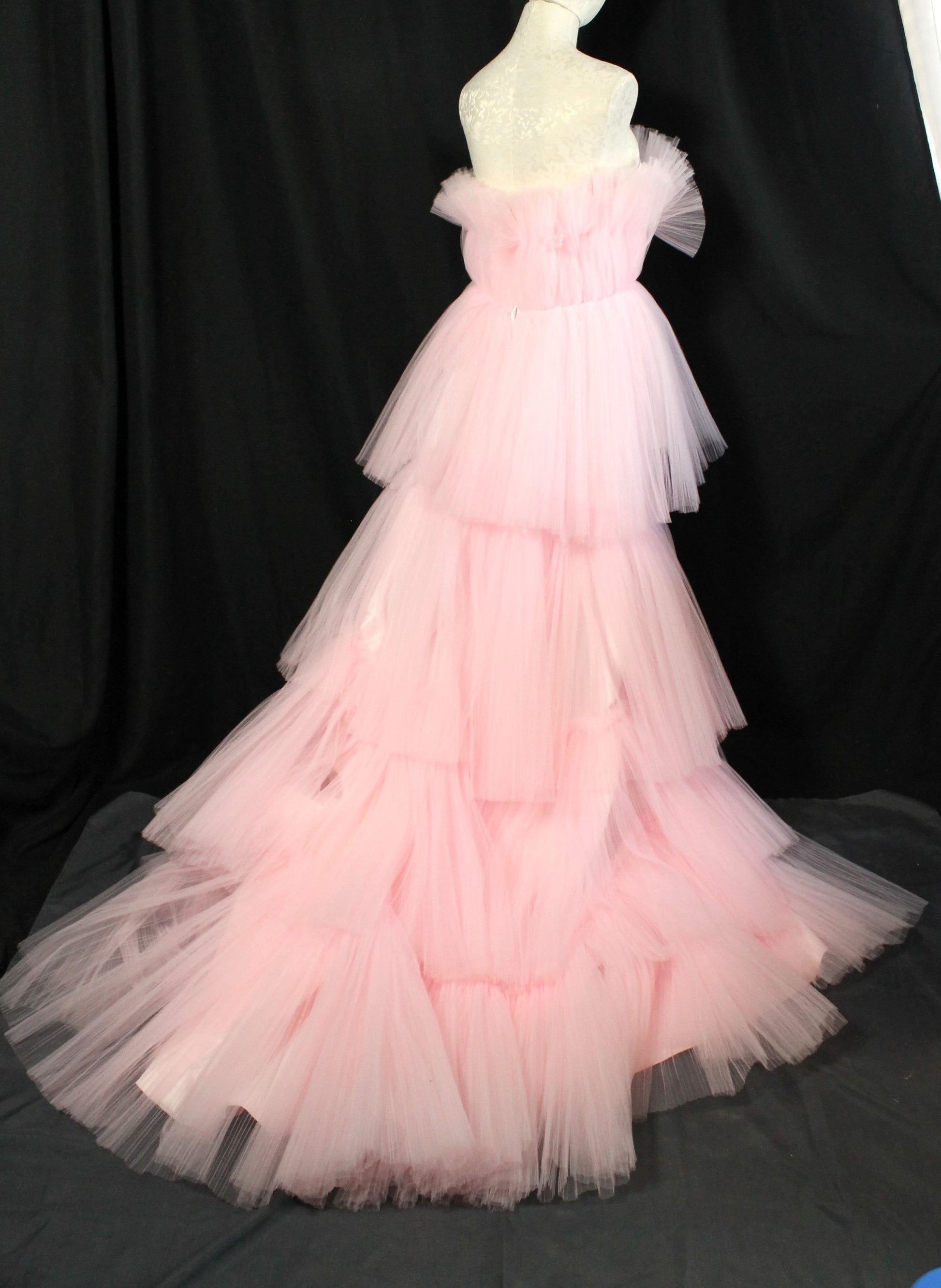 Think pink with this breathtaking formal gown. Designed with layers of flowing tulle, this dress measures a 94 cm bust and 82 cm waist. The fitted bodice features an elastic band for comfort and a back zipper for a secure fit. This dress is in like-new condition.