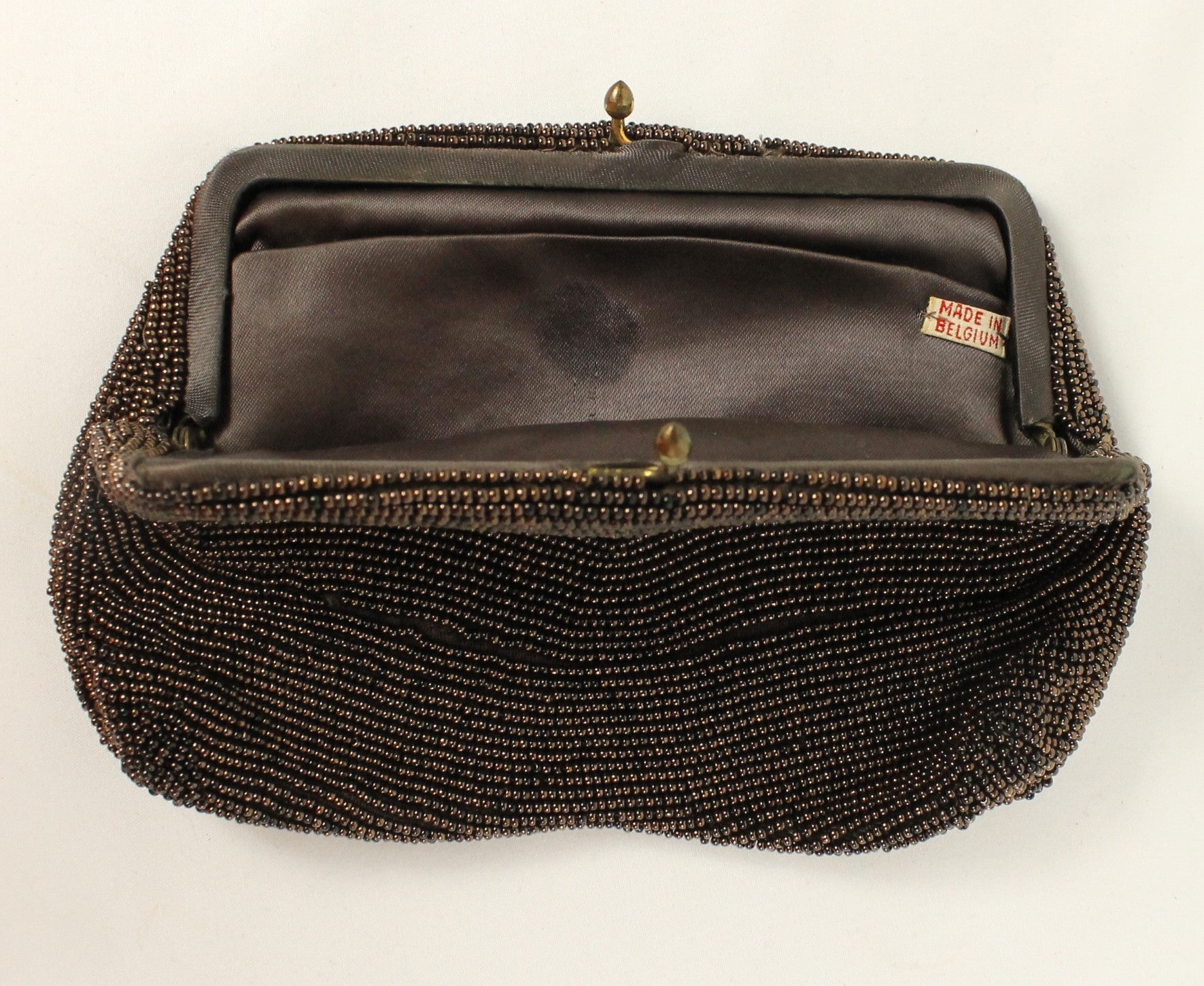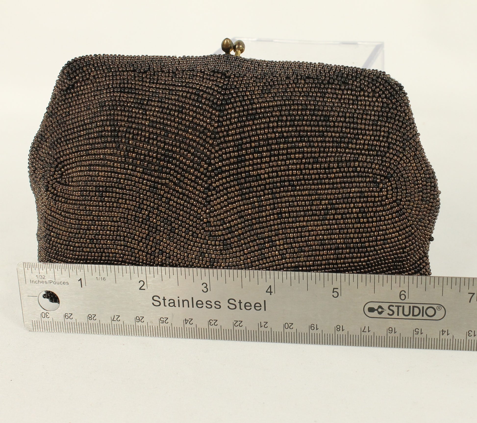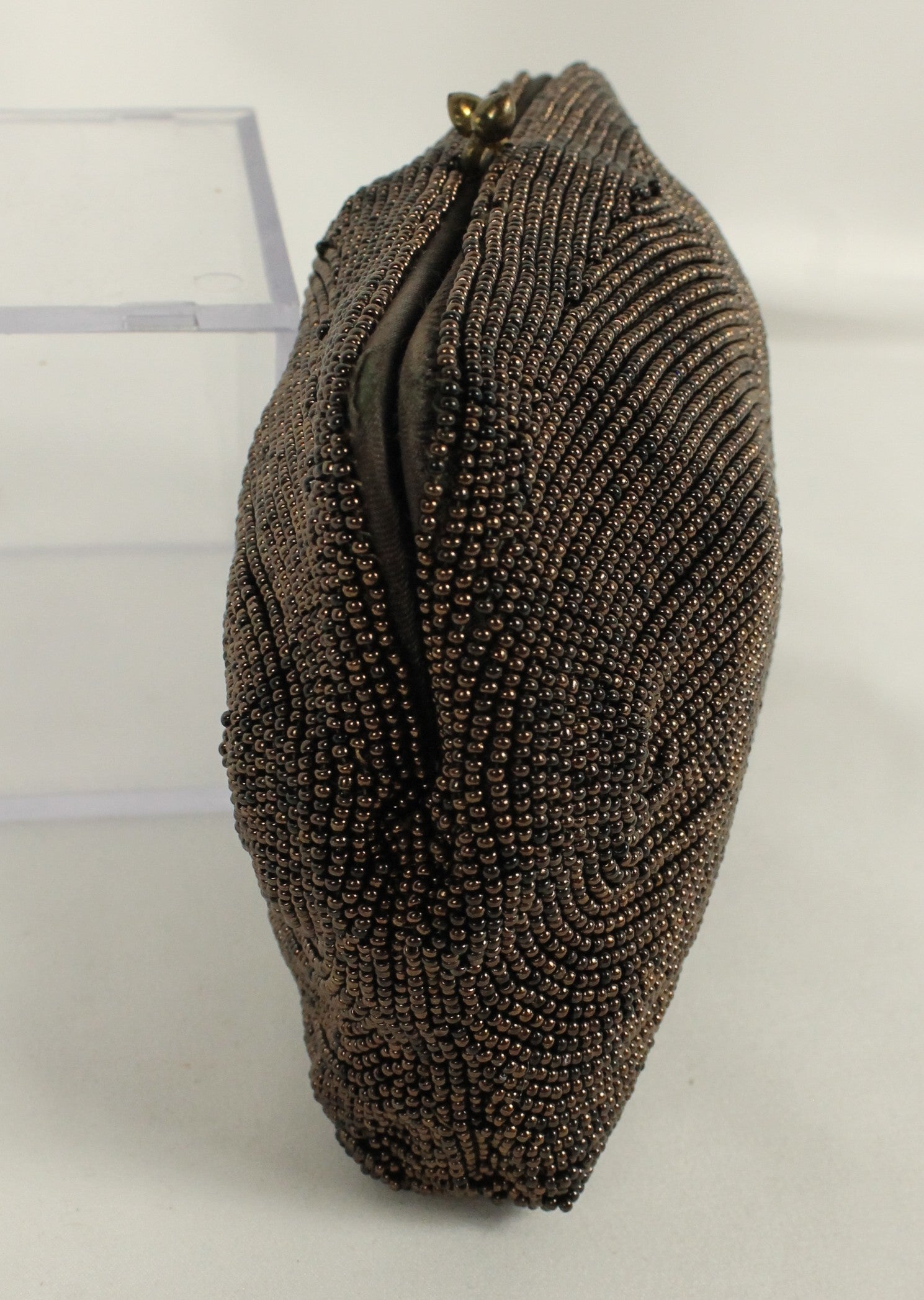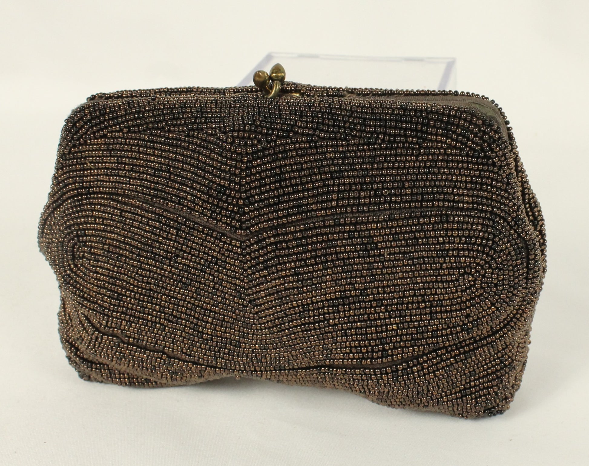 Step back in time with this vintage micro-beaded clutch purse. This pouch is hand-covered bronze-to-deep-brown glass beads. There is slight damage on the corners, but this is a timeless accessory that adds old-world glamour to any collection.