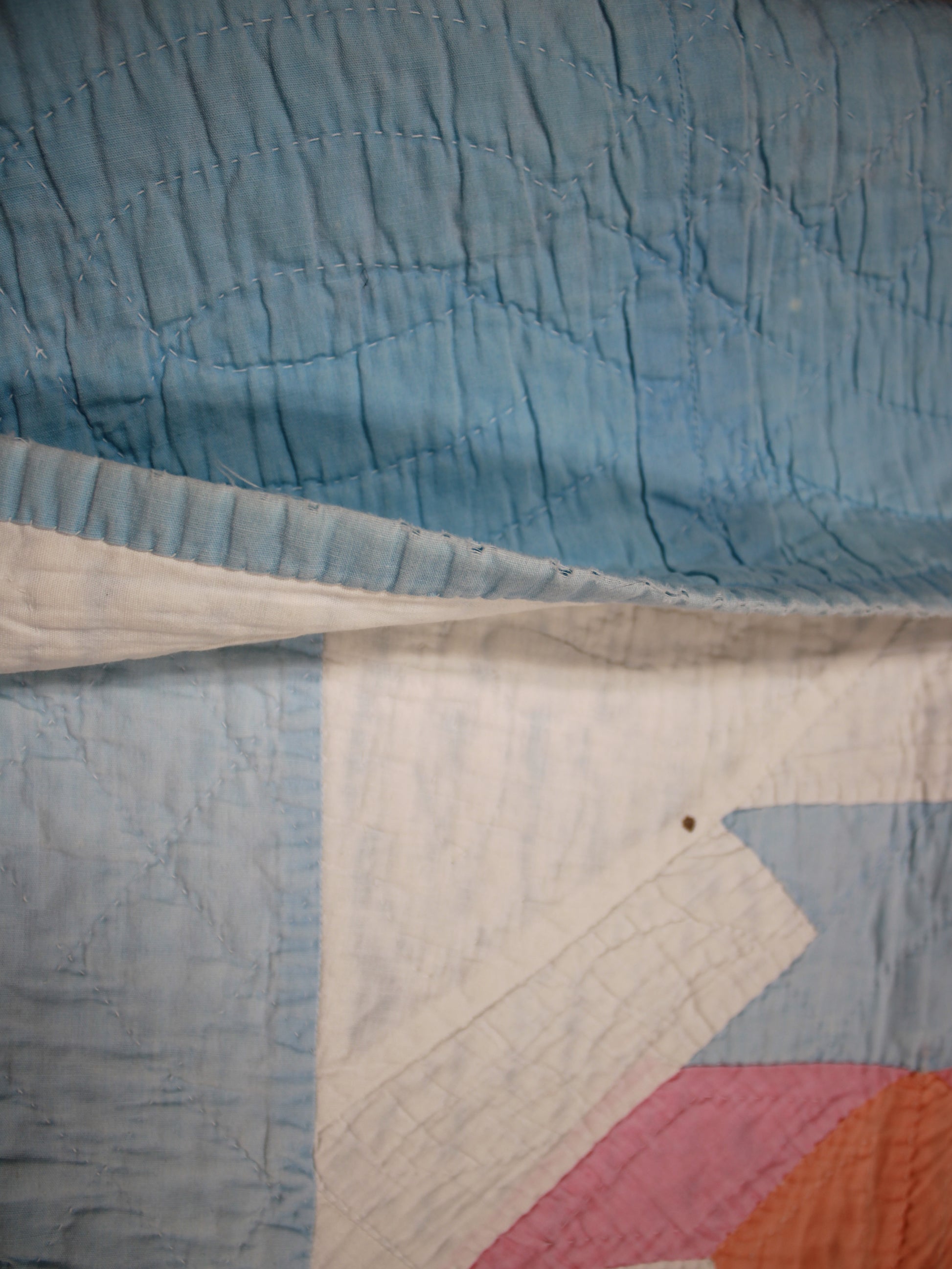 This authentic hand-quilted piece features the timeless "Basket" pattern, rendered in a charming palette of pastel blue, pink, and peach. The quilt showcases meticulous hand-stitched detailing across the ivory ground and borders, highlighting the traditional craftsmanship of the mid-20th century. Measuring approximately 200 cm by 223 cm, it is a versatile size that works beautifully as a queen-size bed cover or a significant decorative statement piece. While in good vintage condition, the quilt displays minor age-related spots and slight discoloration that serve to confirm its heritage and handmade nature.