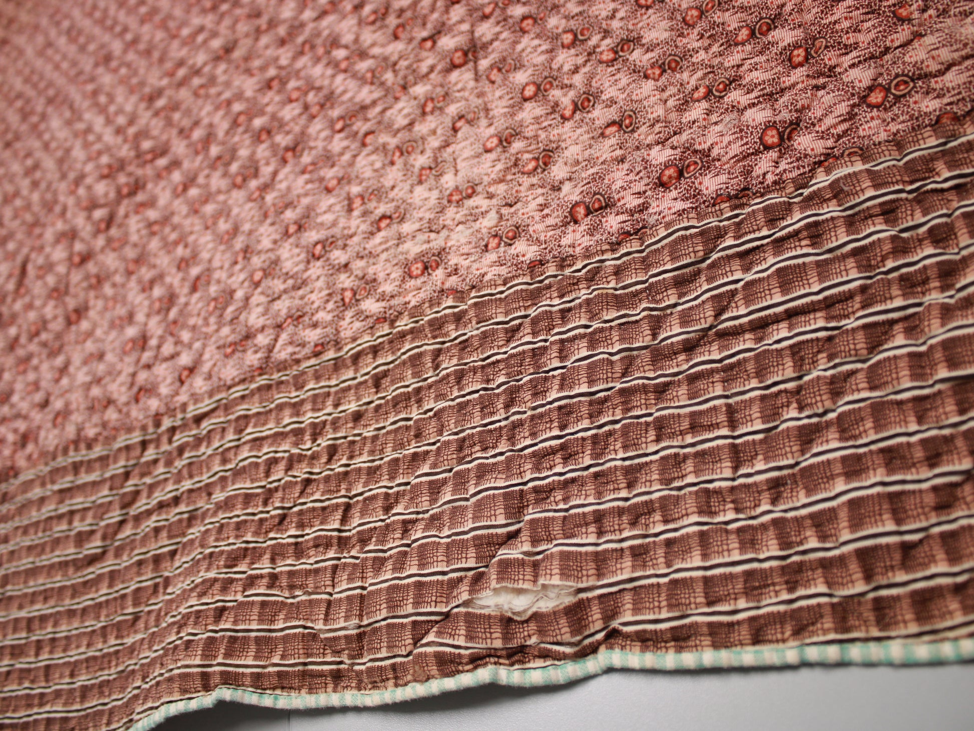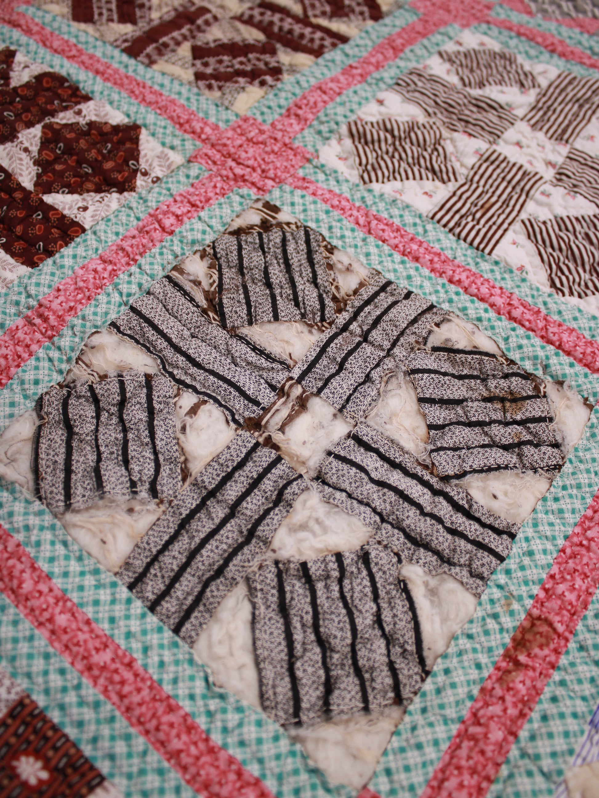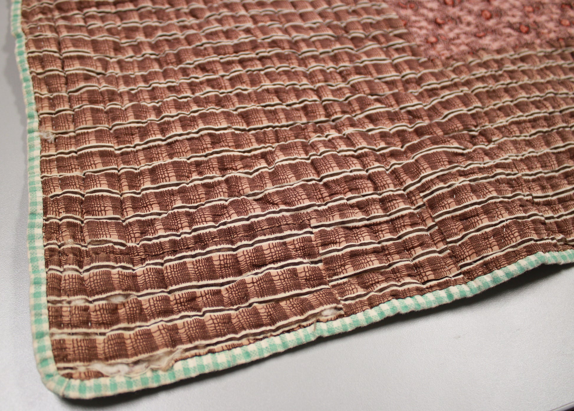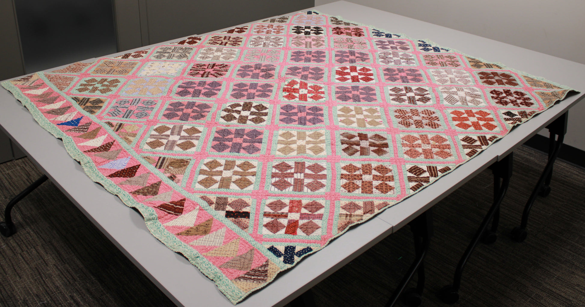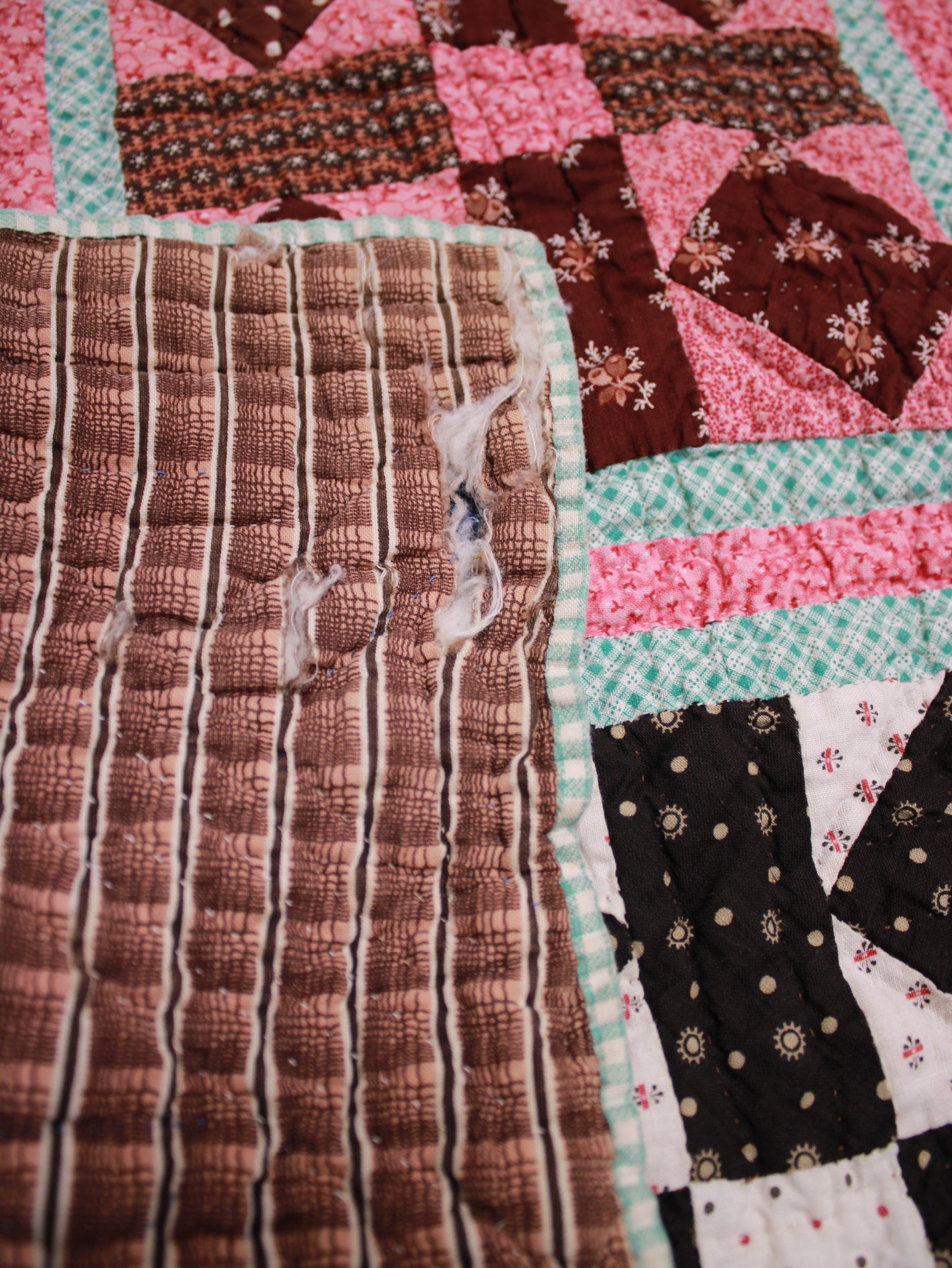 Late 19th Century Geometric Block Quilt in Pink, white, Green, and Brown Size - Single