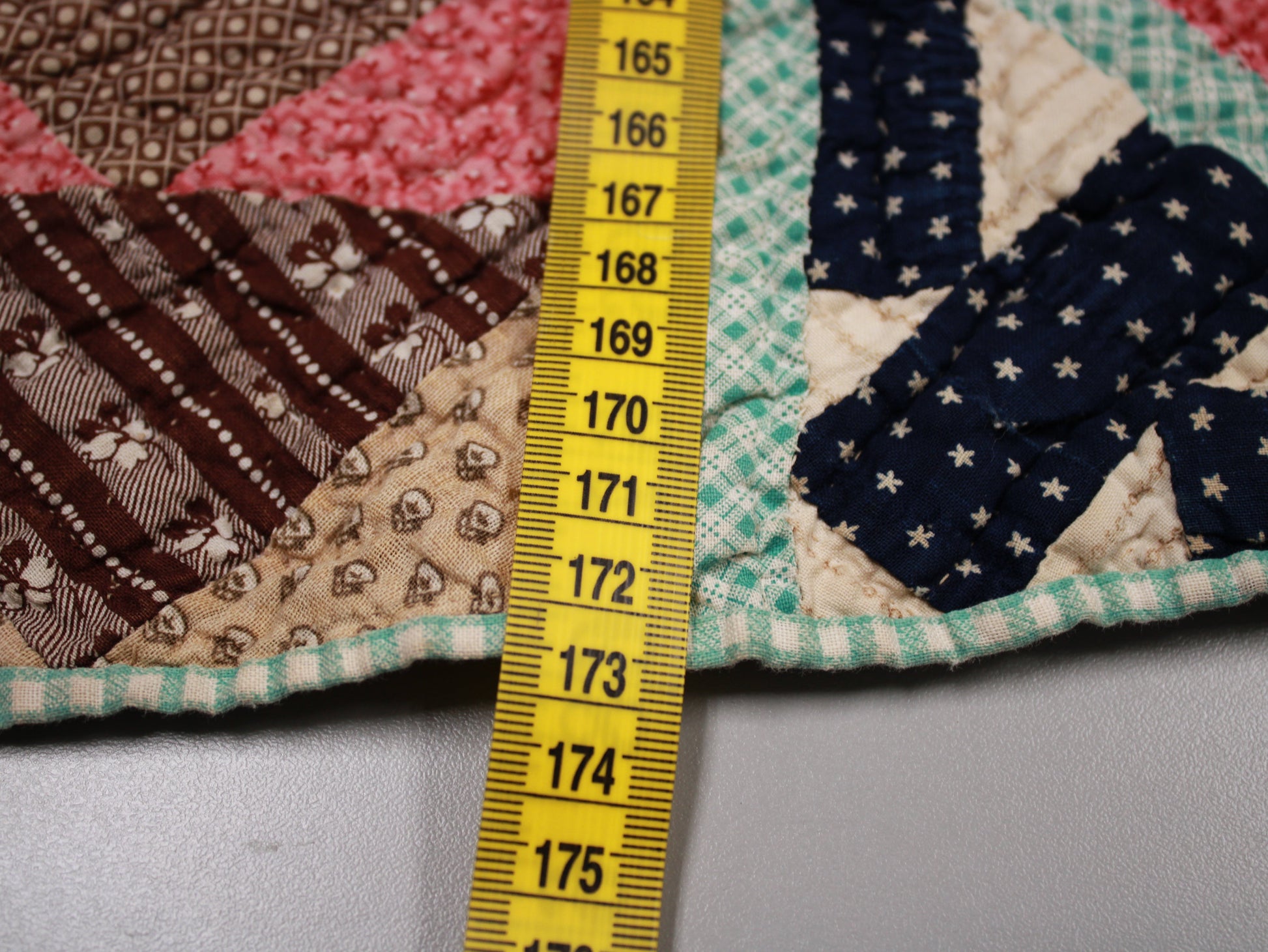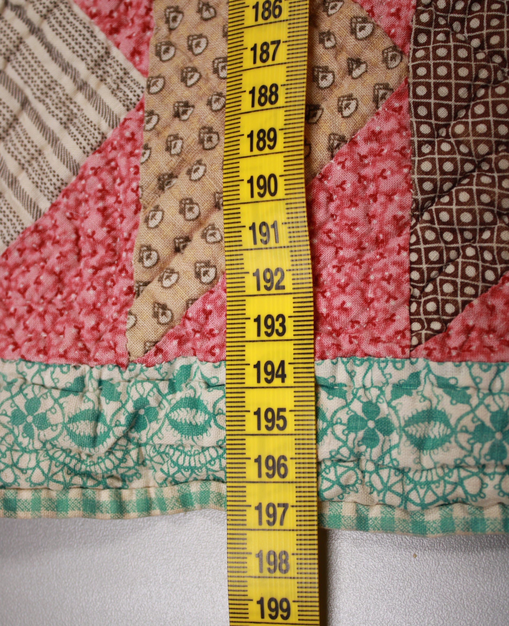 Capture the soul of 19th-century folk art with this authentic, hand-pieced Bear’s Paw quilt featuring a vibrant palette of dusty rose, sage, and chocolate brown. The stunning "on-point" layout is framed by a double-sashed grid and a "scrappy" Flying Geese border that adds incredible visual character. Measuring 197cm x 173 cm, this textile shows beautiful age-related "shattering" and wear that tells a story of a century of use. It is a must-have statement piece for any collector seeking a high-contrast, primitive aesthetic for a farmhouse or gallery wall.