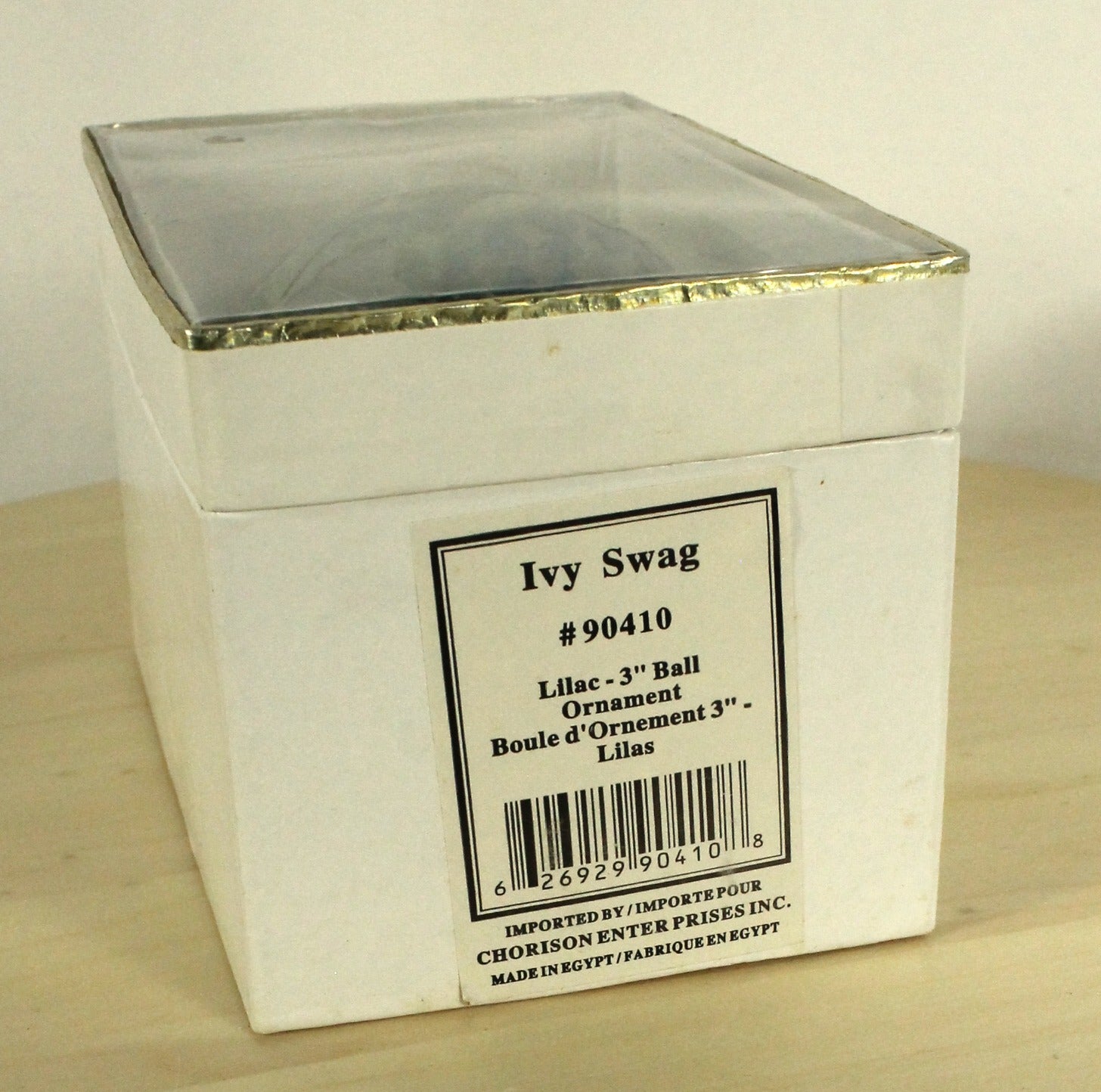 This exquisite 3-inch glass ball ornament features a stunning iridescent finish, primarily in shades of teal and green, giving it a unique shimmer. The surface is beautifully decorated with an etched or cut design of leaves and a dotted lattice pattern, referred to as the "Ivy Swag" style. It includes a clear glass hanging loop with a gold-tone accent and a matching decorative finial at the base. Imported from Egypt and in its original white display box, this piece would make a beautiful addition to any holiday collection or a thoughtful gift.
