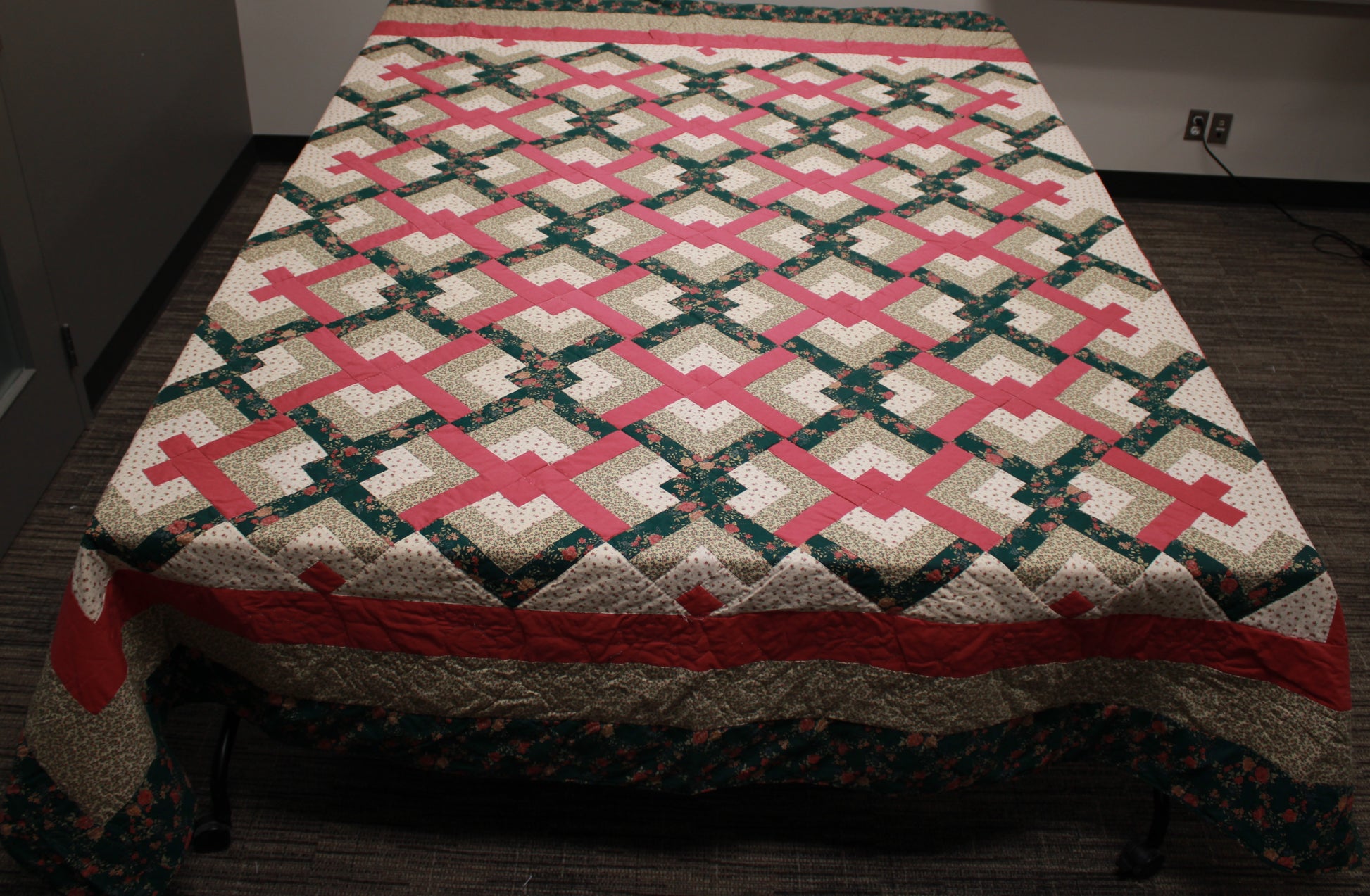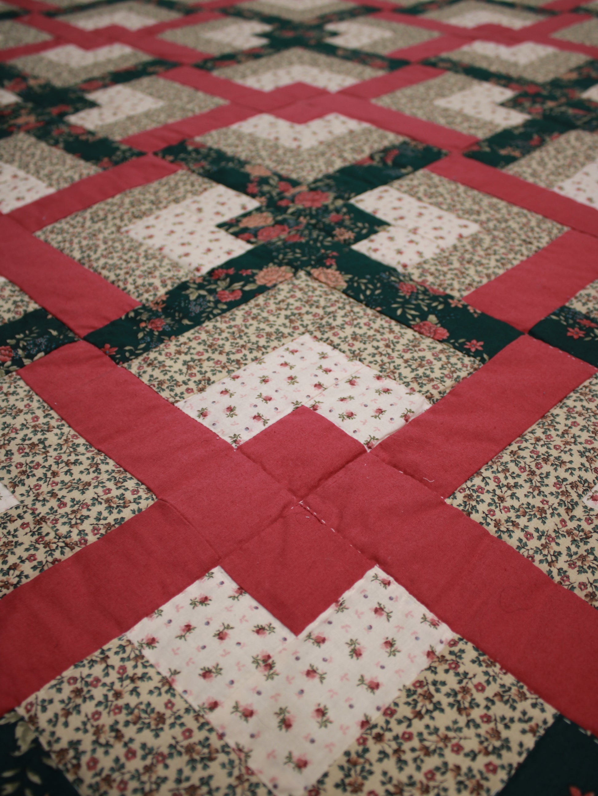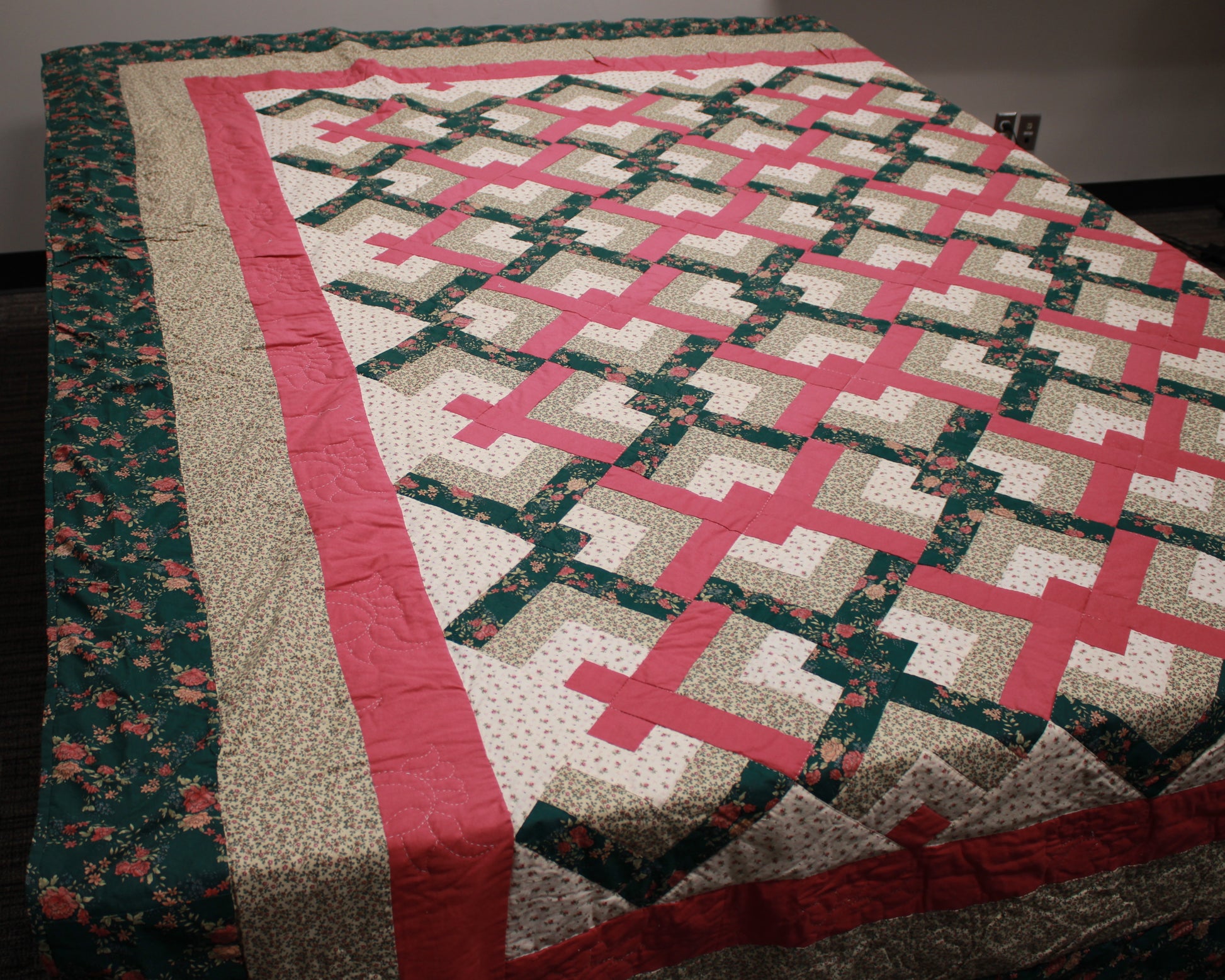 This stunning king-size quilt is a completely handmade masterpiece featuring a traditional "Log Cabin" inspired patchwork design in vibrant pink, forest green, and cream floral patterns. Measuring approximately 300 cm by 276 cm, this expansive piece offers generous coverage for a king-sized bed and adds a touch of rustic elegance to any bedroom. The reverse side is finished in a clean, solid cream fabric, showcasing the detailed hand-stitched quilting patterns that run throughout the entire piece. Please note that a small section of the green floral edging is coming loose as shown in the detail photos, which is a simple fix for any sewing enthusiast.