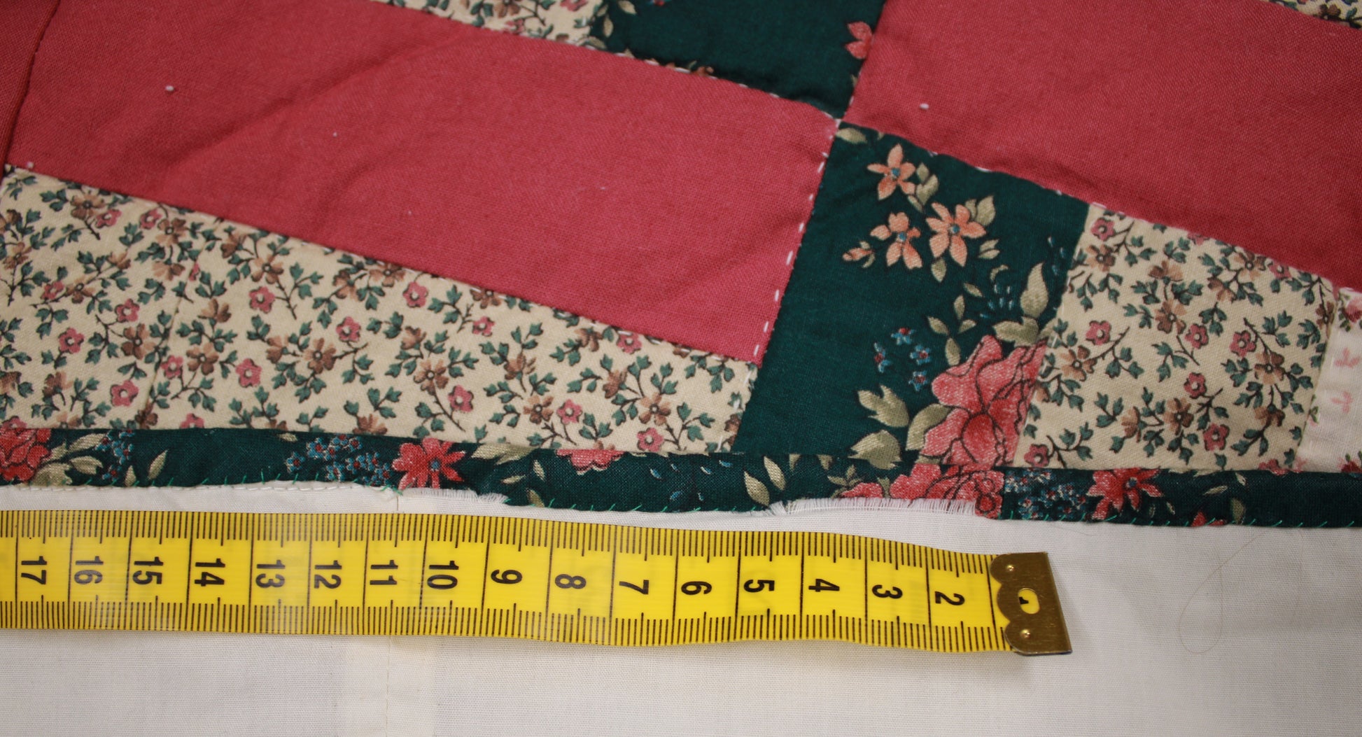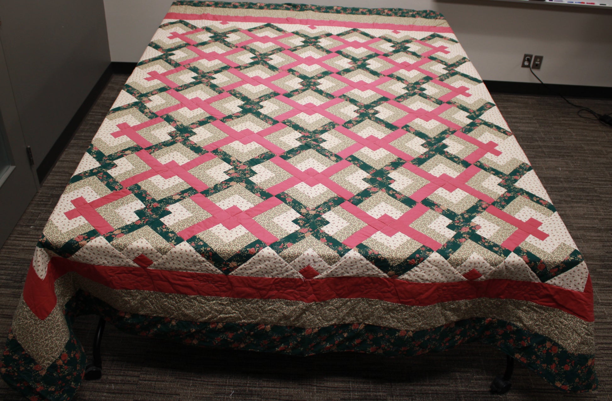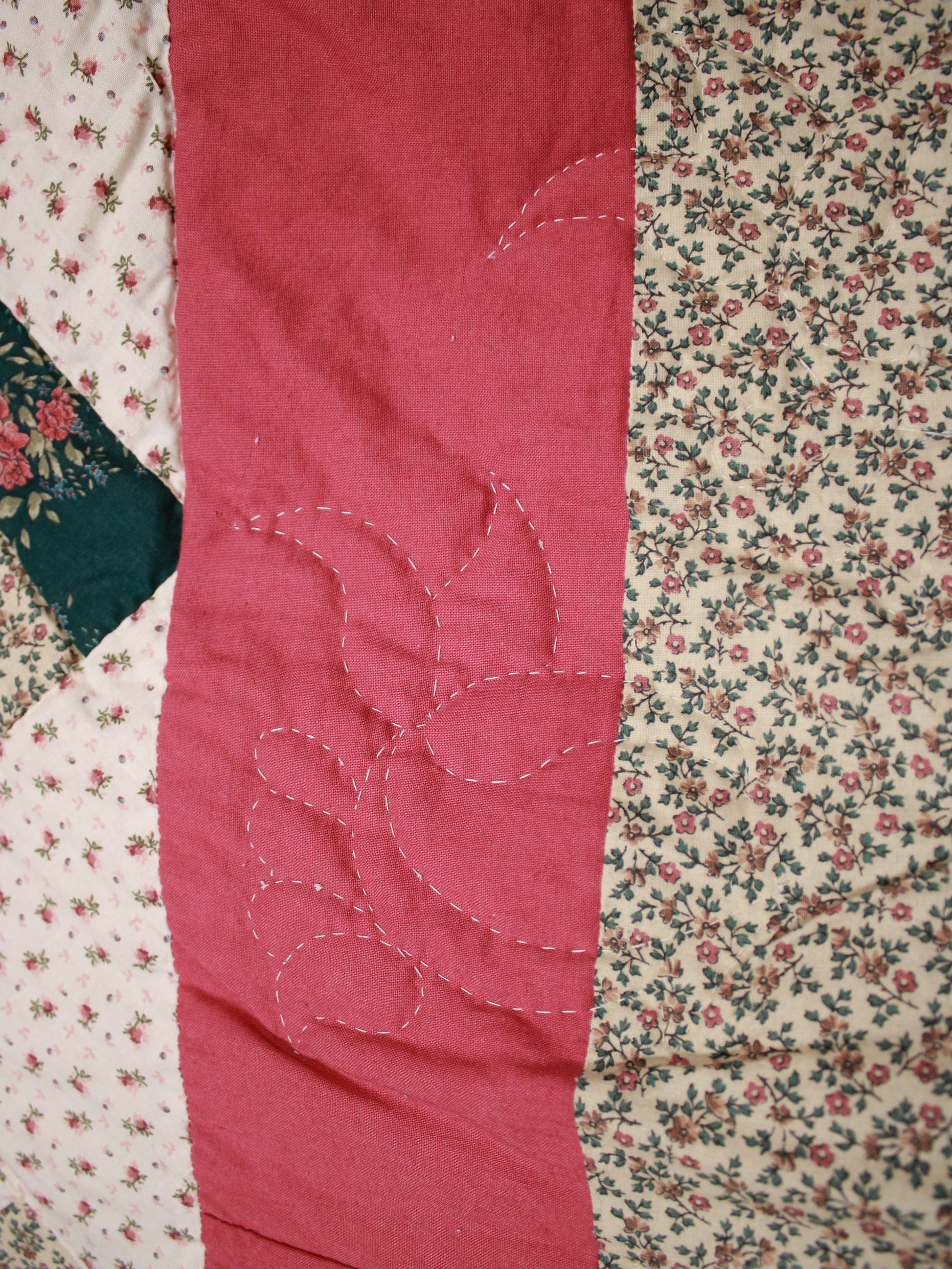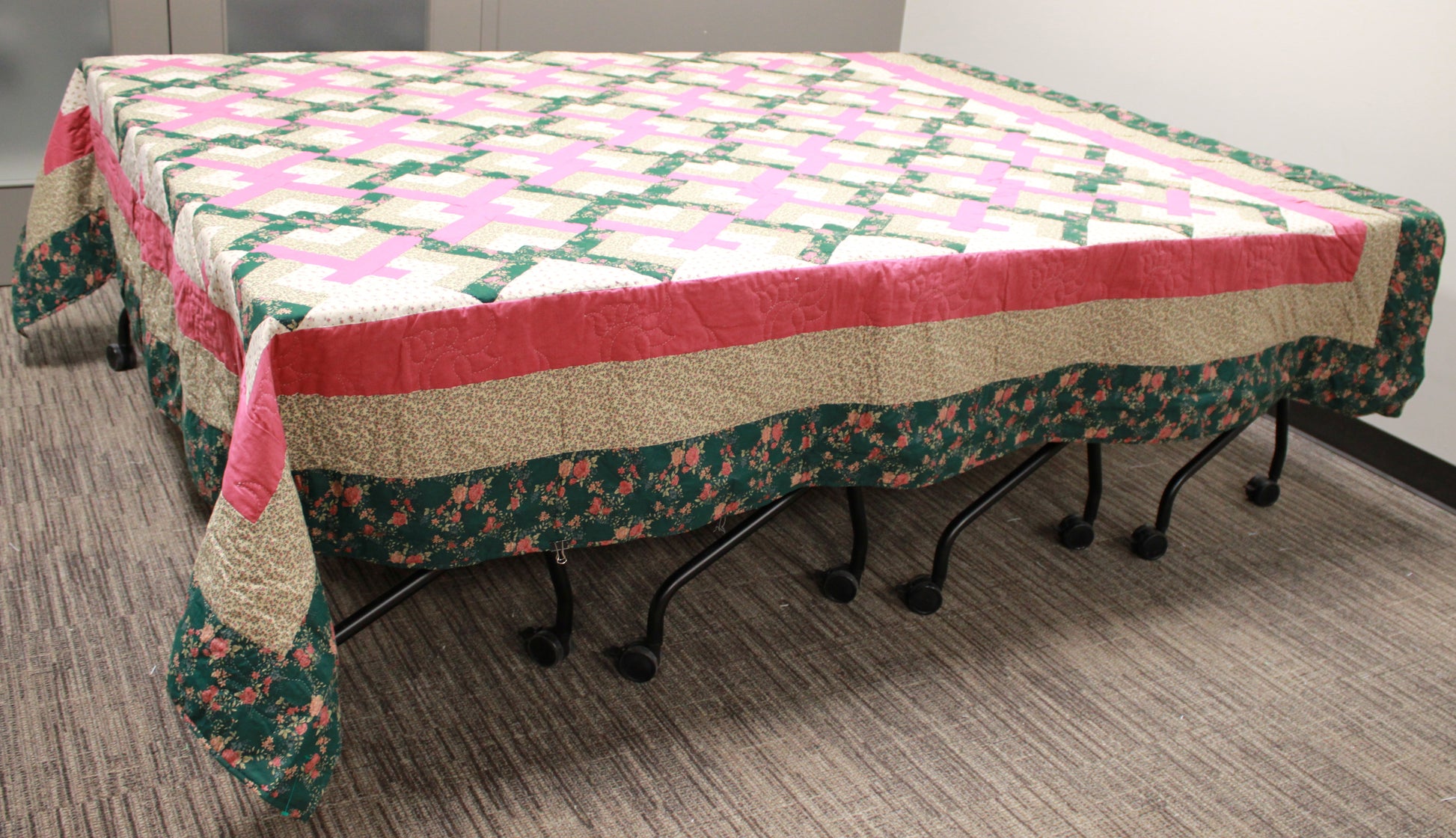 This stunning king-size quilt is a completely handmade masterpiece featuring a traditional "Log Cabin" inspired patchwork design in vibrant pink, forest green, and cream floral patterns. Measuring approximately 300 cm by 276 cm, this expansive piece offers generous coverage for a king-sized bed and adds a touch of rustic elegance to any bedroom. The reverse side is finished in a clean, solid cream fabric, showcasing the detailed hand-stitched quilting patterns that run throughout the entire piece. Please note that a small section of the green floral edging is coming loose as shown in the detail photos, which is a simple fix for any sewing enthusiast.