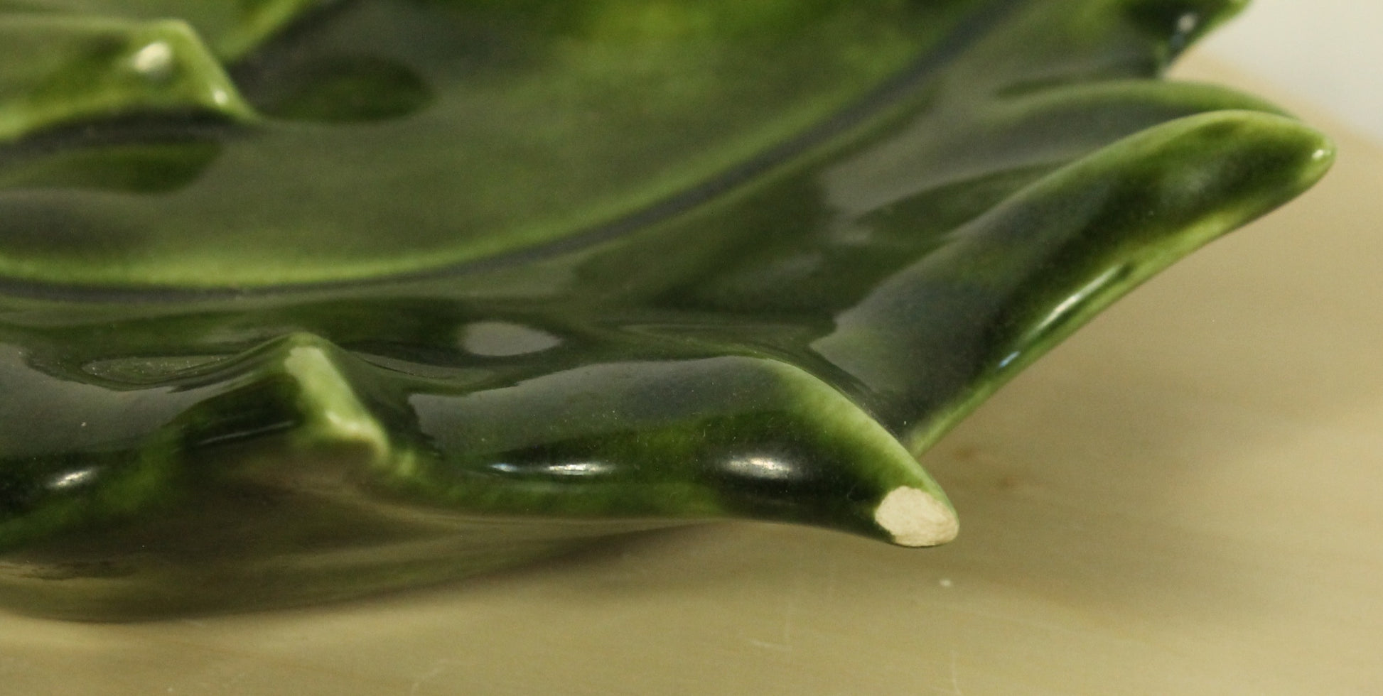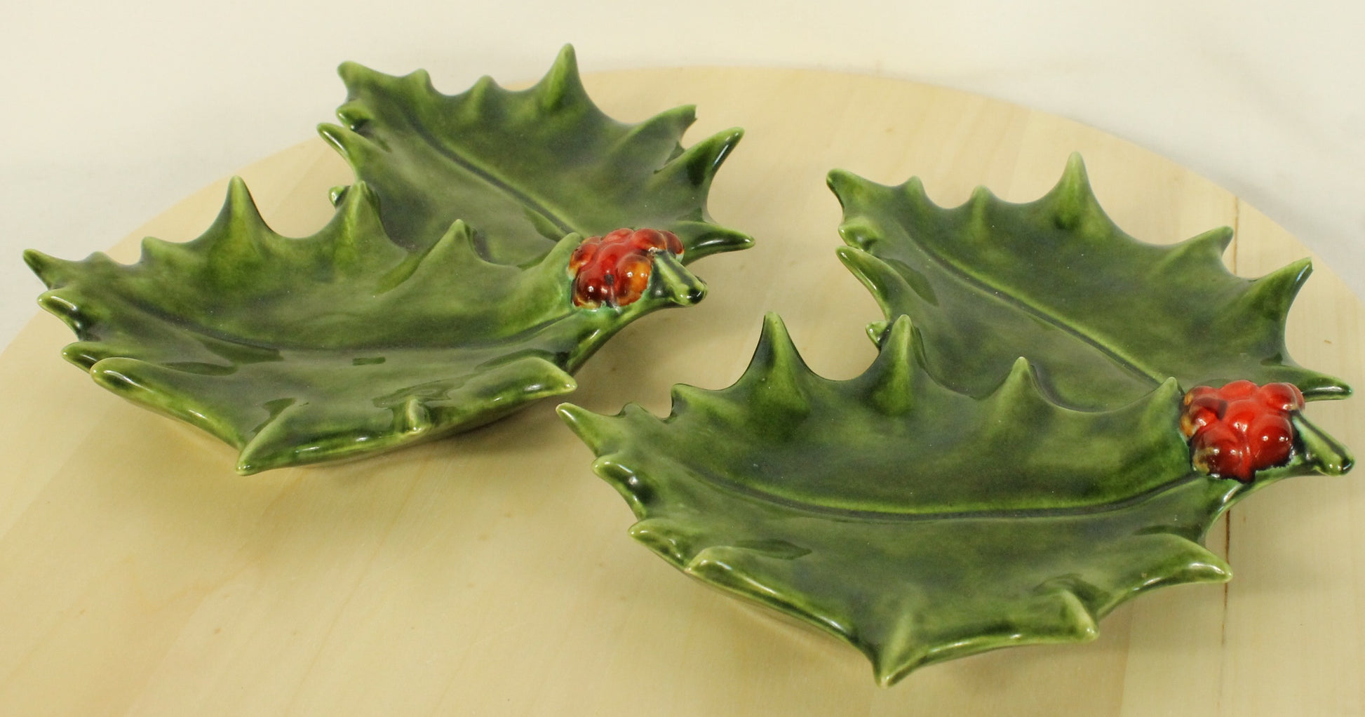 Capture the spirit of a classic Christmas with this striking set of four vintage Jamar ceramic holly leaf dishes! Adorned with a rich, glossy green glaze and vibrant red berries, these beautifully detailed trays instantly bring mid-century festive charm to any setting. Perfect for serving holiday candies and nuts, or as unique catch-alls for jewelry and small treasures. Don't just decorate—elevate your holiday entertaining with this charming and collectible 2-piece set. These items have some small chips on the edges of the leaves. Please see photos.