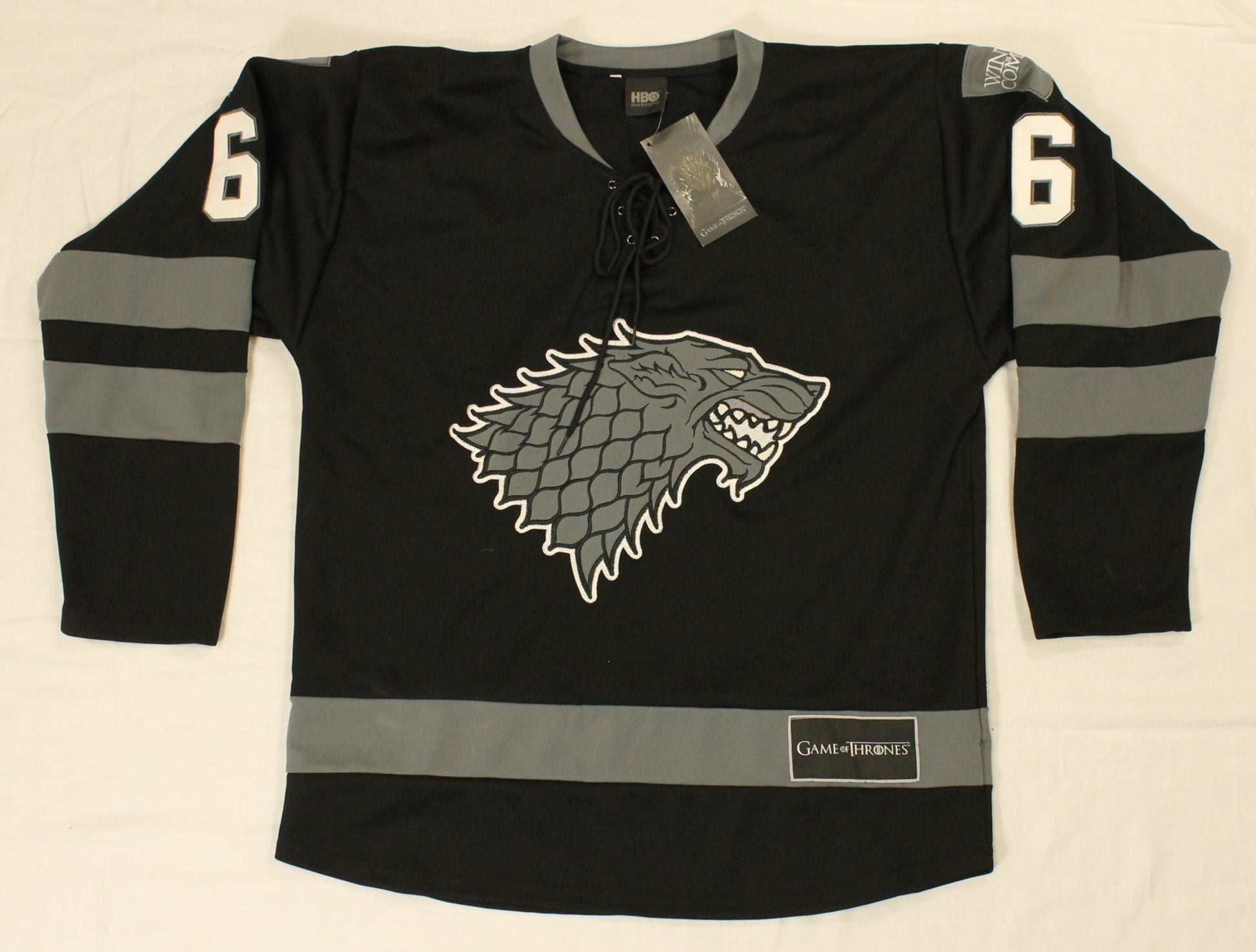 Channel the North with this gently used HBO jersey featuring the iconic "Winter is Coming" Stark 6 design from Game of Thrones.