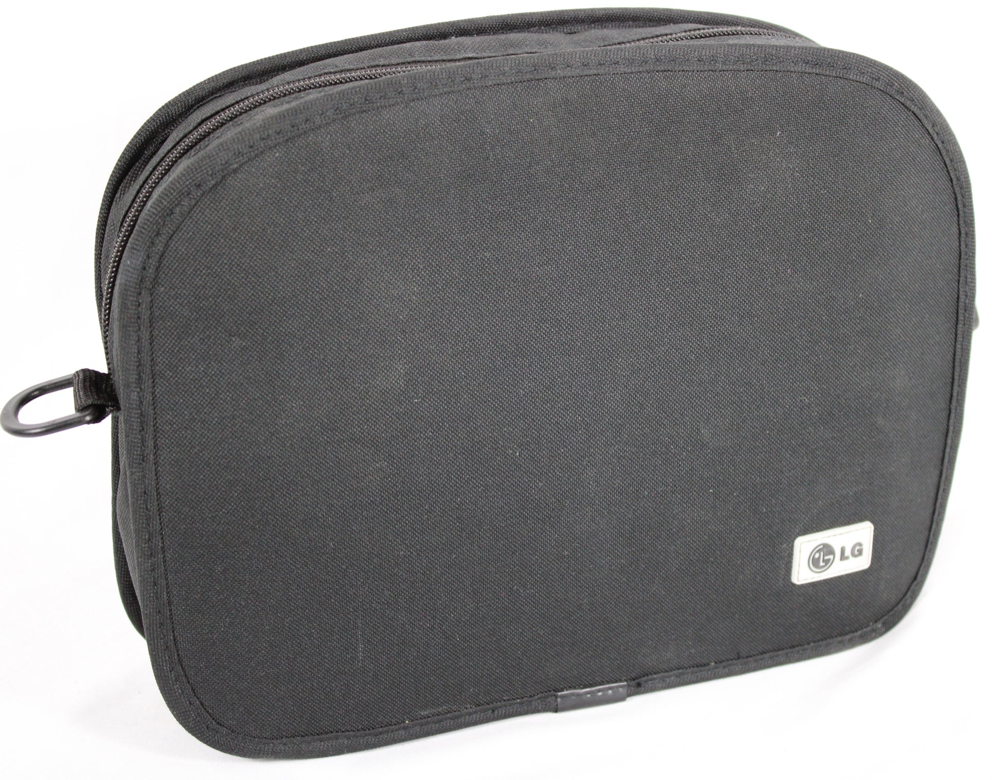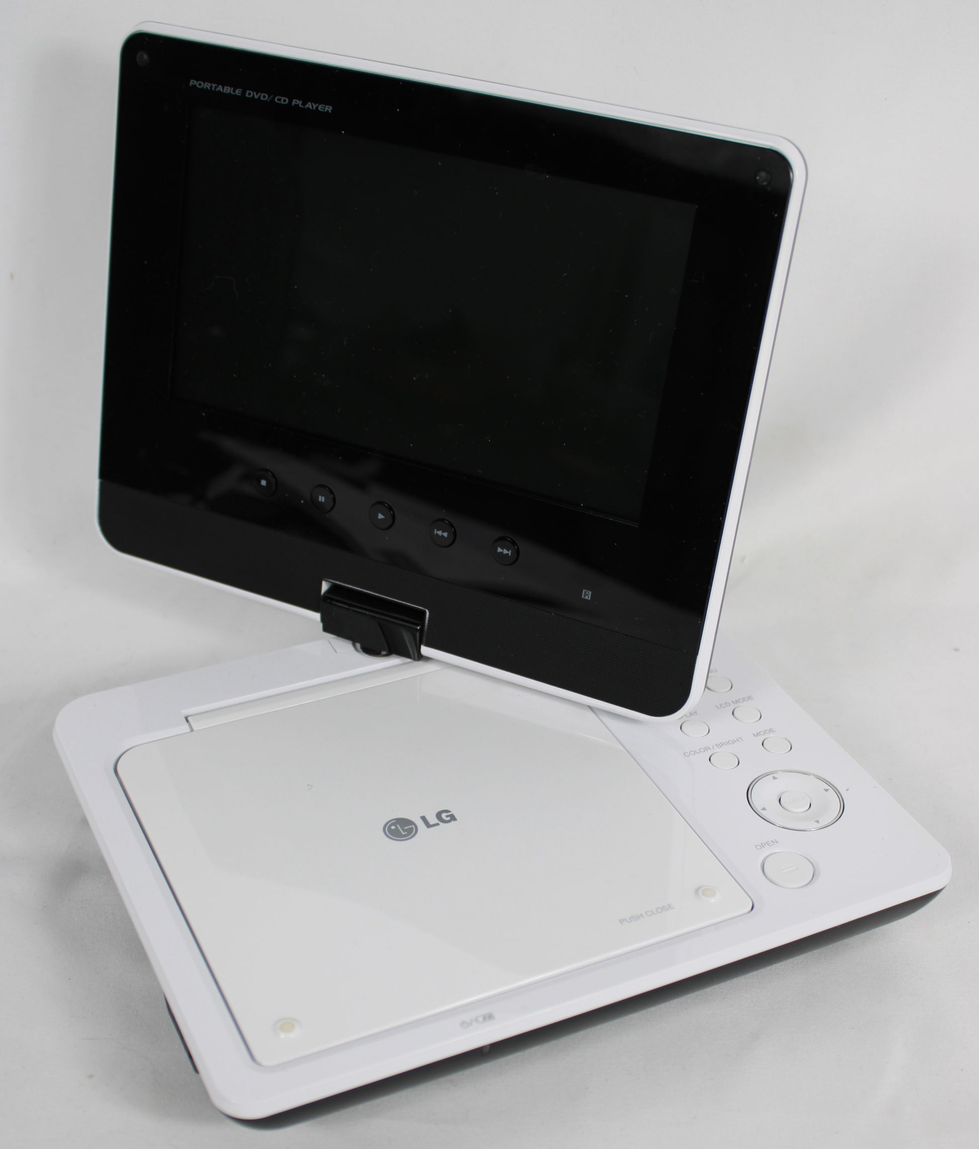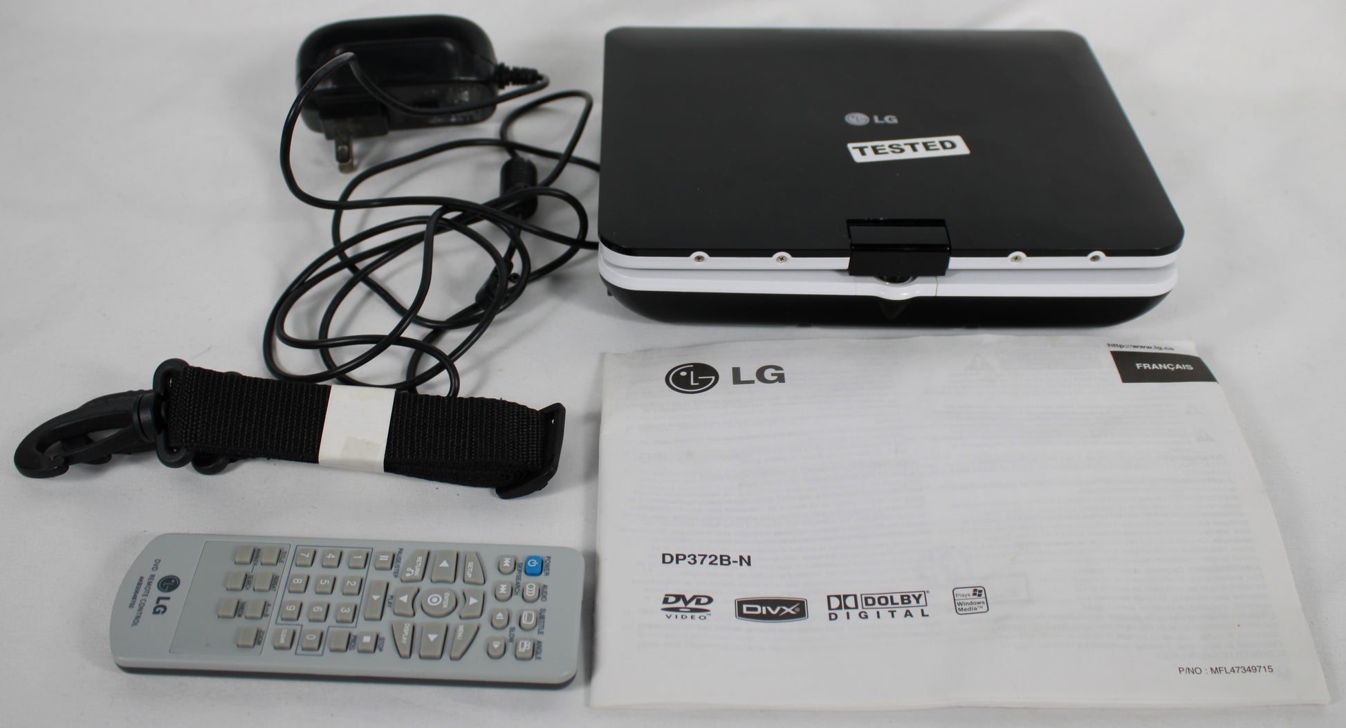 Enjoy movies and music on the go with this LG DP372B-N portable DVD and CD player featuring a sleek black and white design. This unit is compatible with DVD Video, DivX, and Dolby Digital formats to ensure a high-quality entertainment experience. The comprehensive bundle includes a remote control, power adapter, French instruction manual, mounting strap, and a dedicated LG protective carrying case. This specific unit has been tested and includes essential physical controls and connectivity for headphones and AV output.