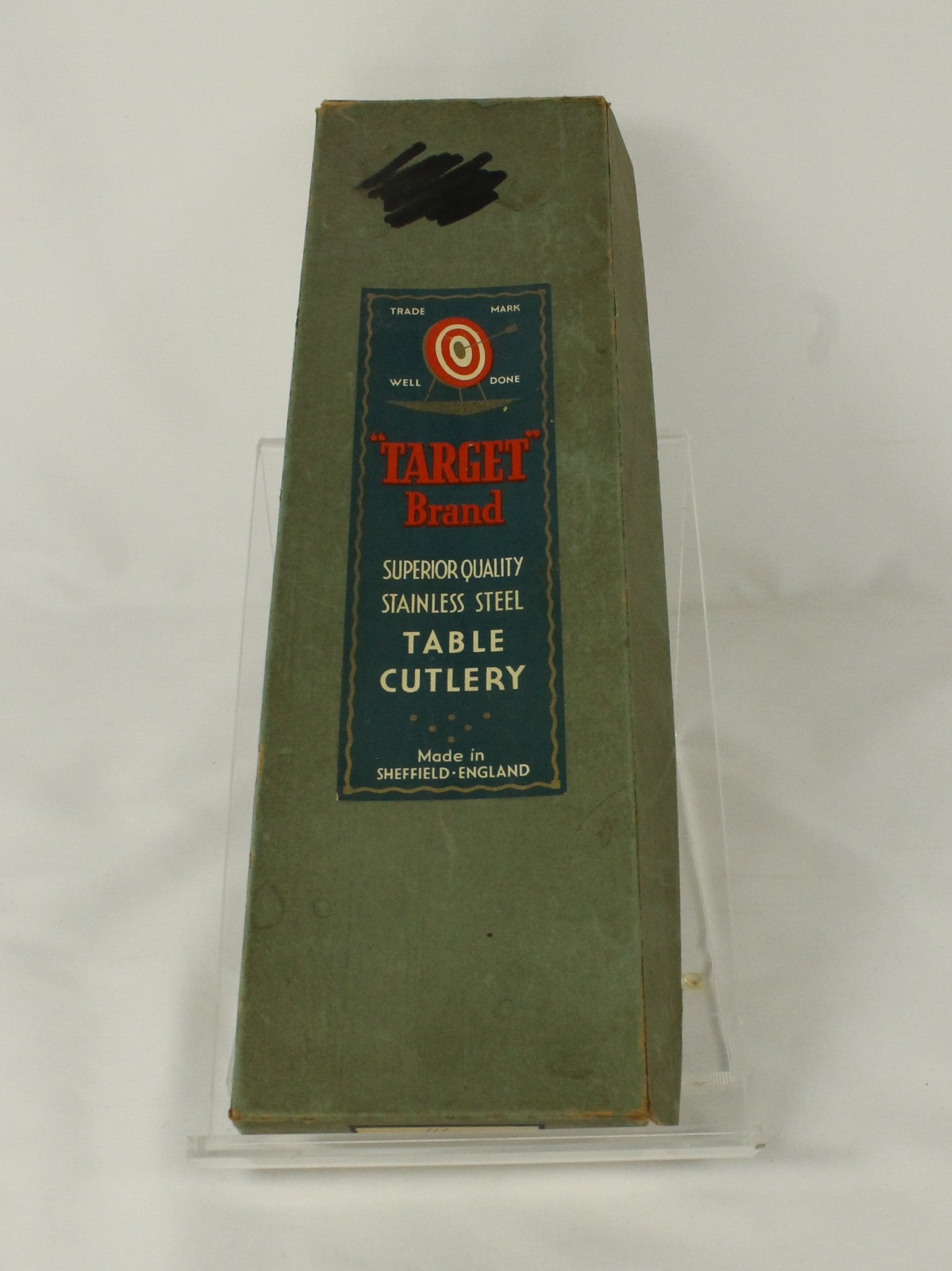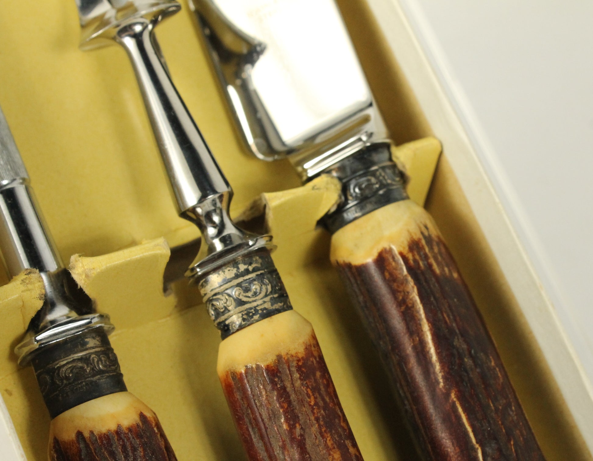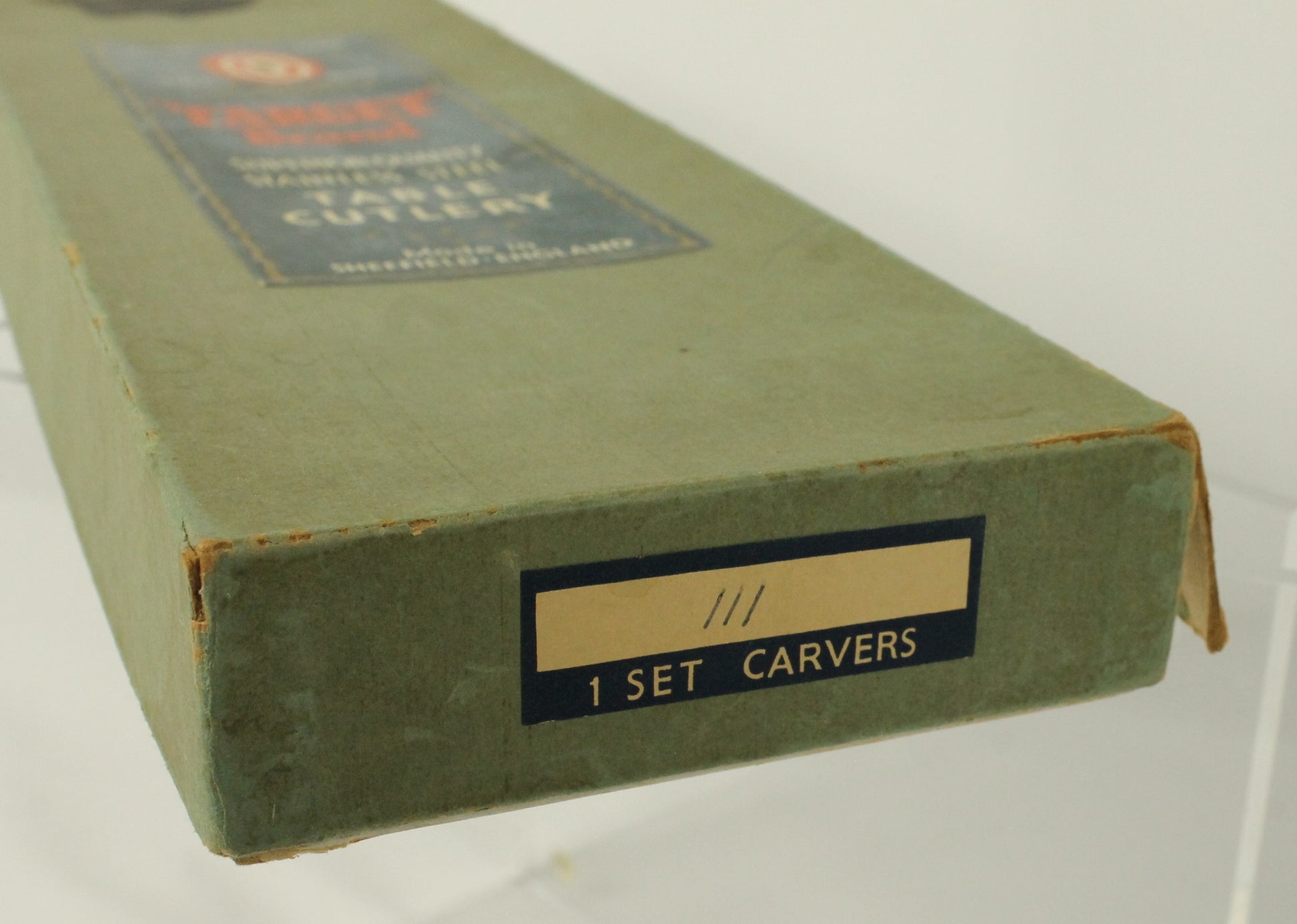 This Francis Howard Sheffield table cutlery set includes a carving knife and sharpening tool. It is designed for precise and efficient carving, offering both functionality and style.