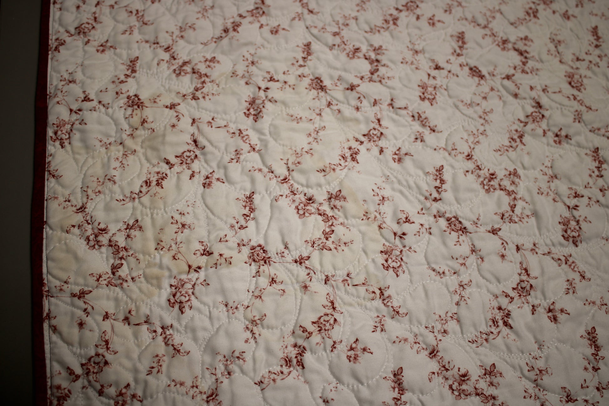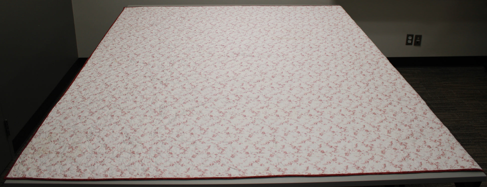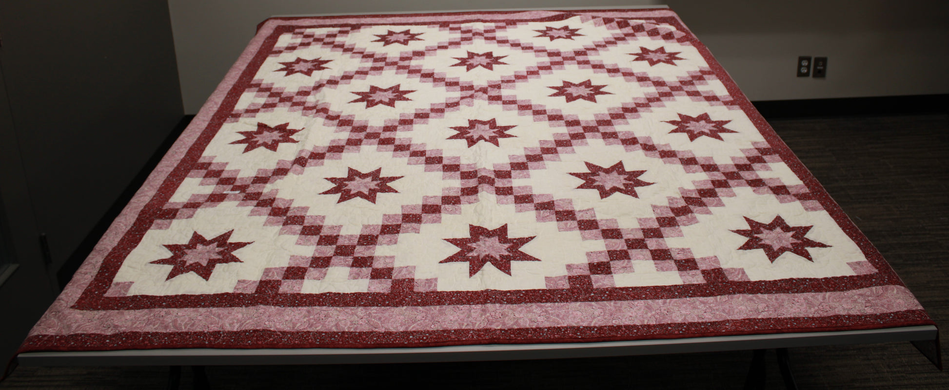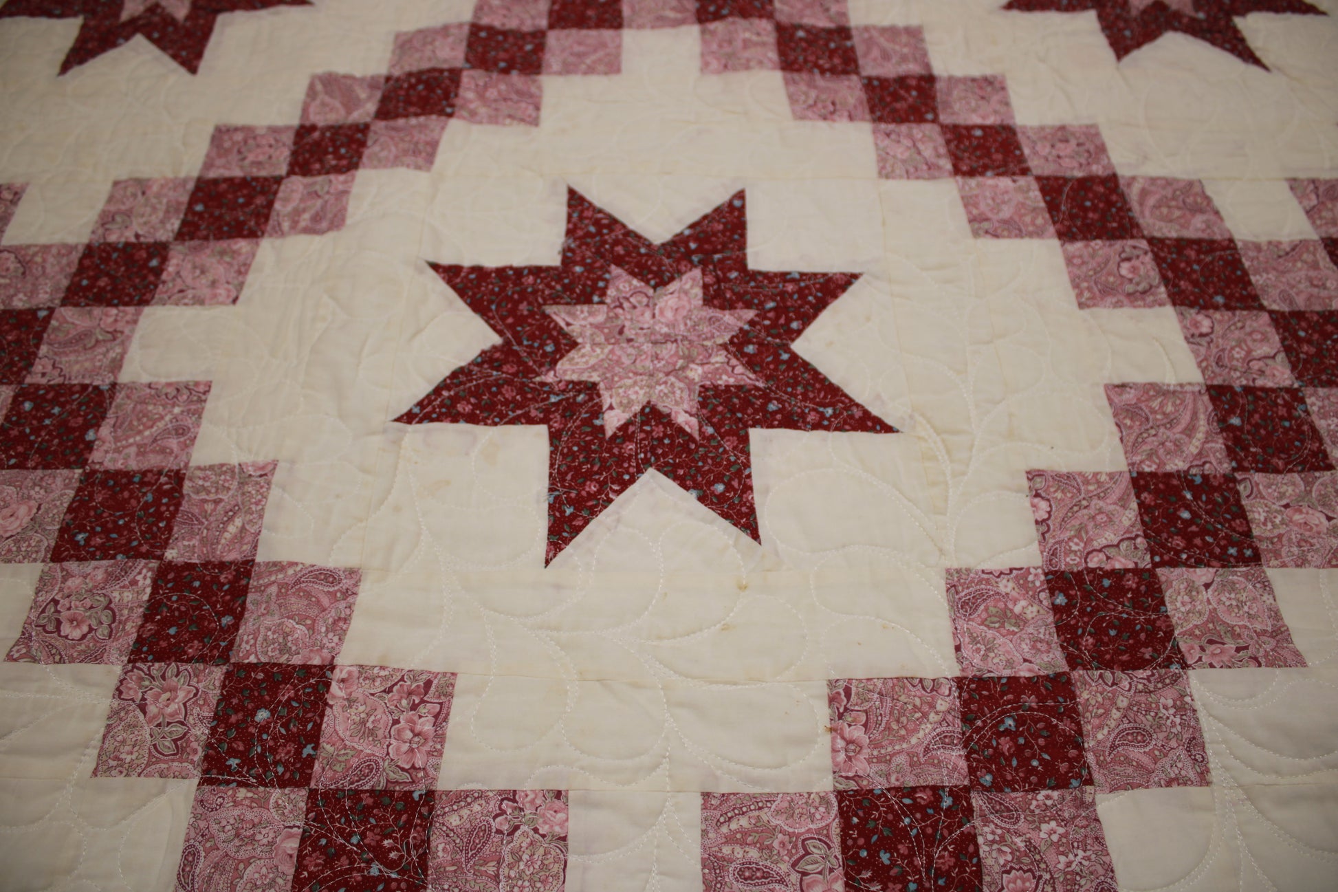 This hand-pieced double quilt showcases a timeless Star and Chain design, beautifully crafted with a palette of deep reds and soft pink paisley prints. Measuring approximately 238 cm by 205 cm, the quilt features a hand-pieced top that has been expertly finished with professional longarm quilting for lasting durability. While the intricate pattern is striking, there are some minor dirty marks on the cream fabric sections as shown in the detail photos. We have not attempted to launder this item, so it is offered in its original found condition, ready for a gentle cleaning to restore its full charm.