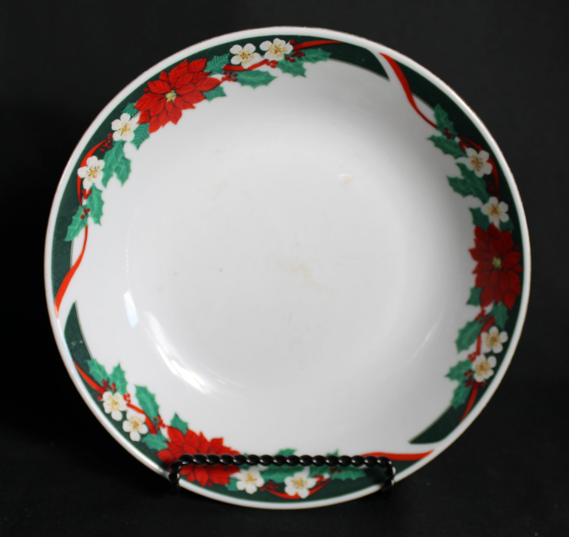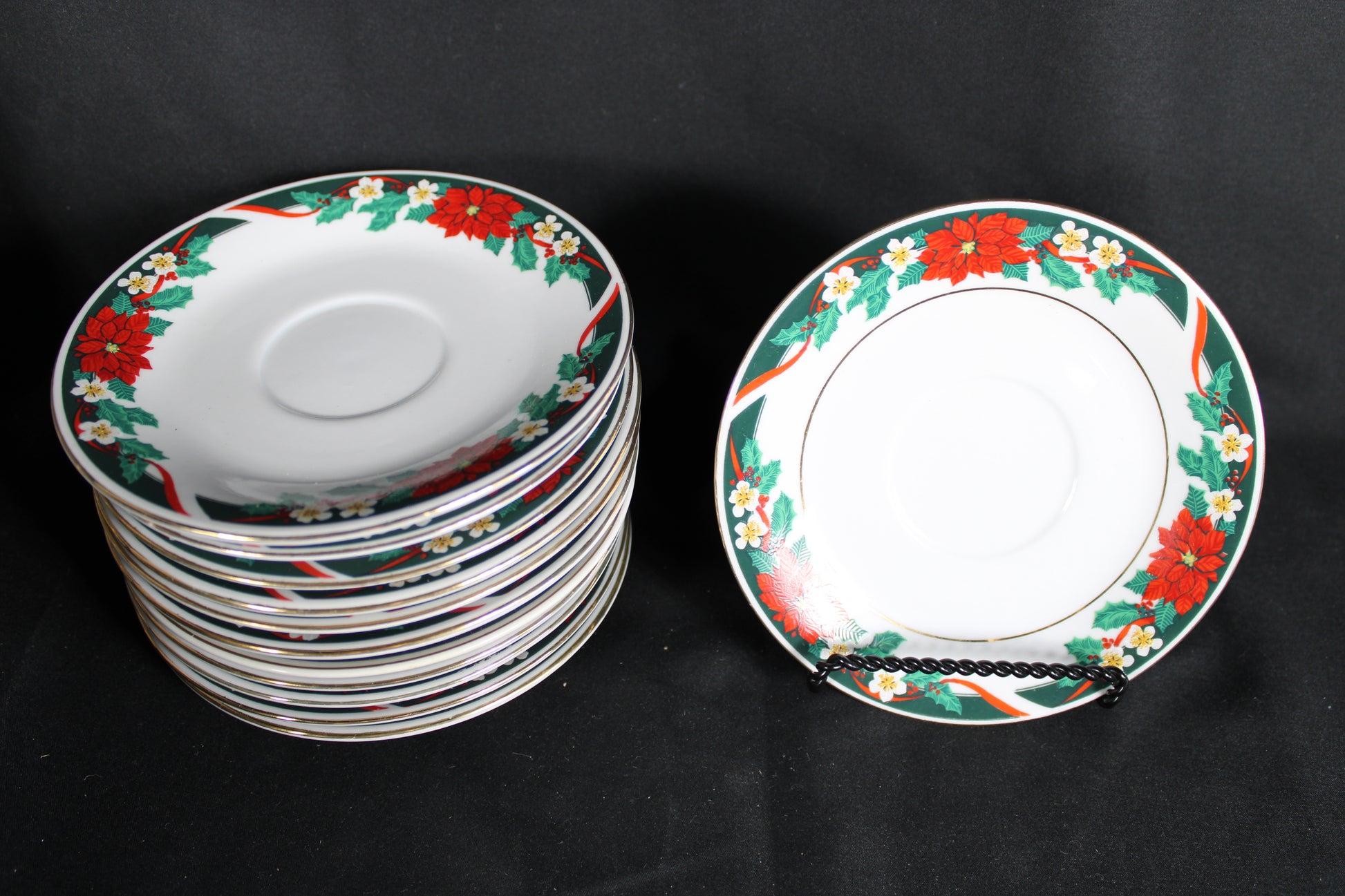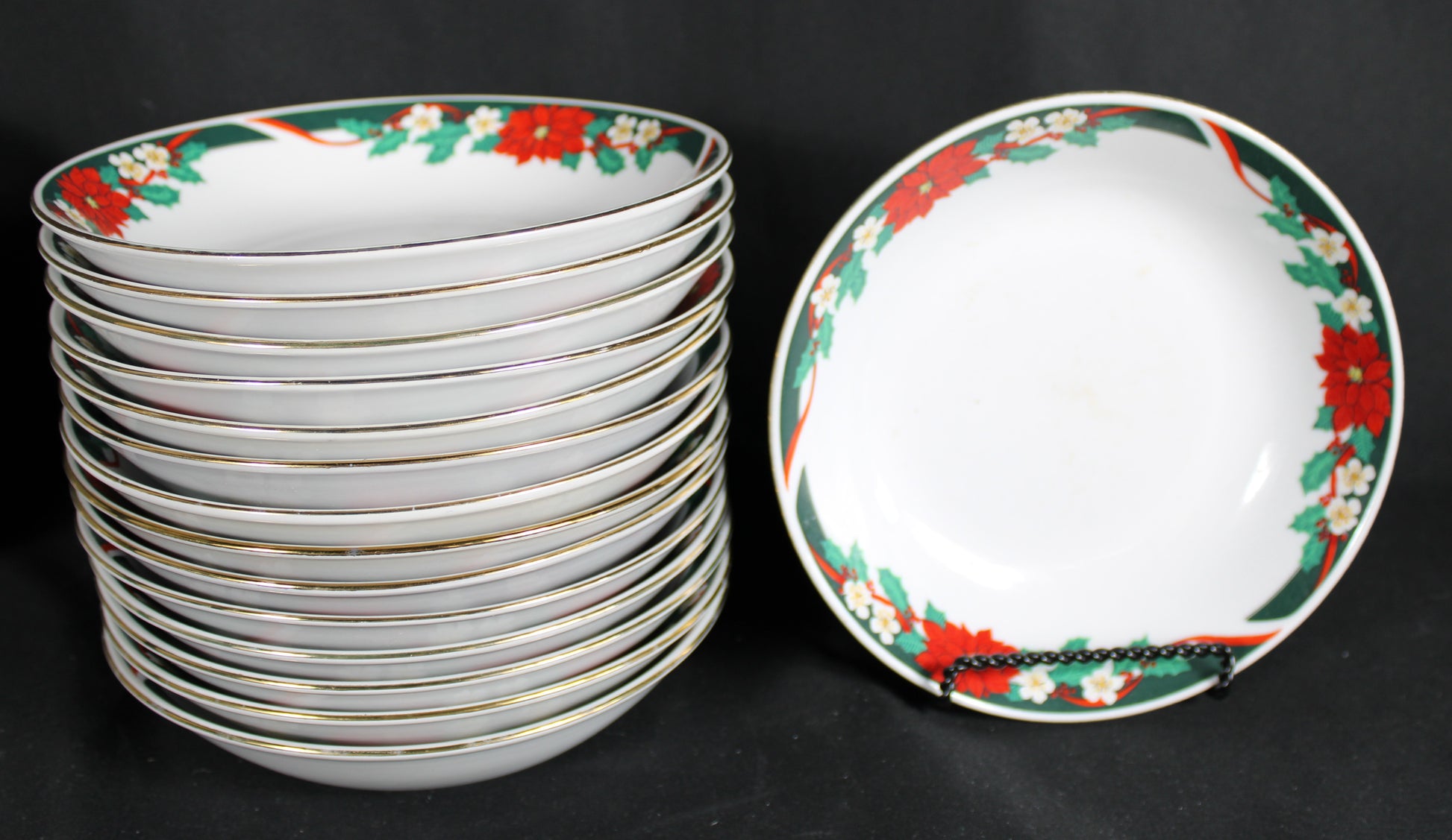 Capture the essence of holiday cheer with this beautiful dinnerware set, featuring a classic poinsettia, holly, and ribbon design. This set is made up of several different brands that share the same general pattern. The rich red, green, and gold trim offers an elegant, festive presentation perfect for Christmas gatherings and seasonal entertaining. This generous collection includes plates of various sizes, bowls, and matching mugs. Elevate your holiday table setting with this charming porcelain china ready to become a cherished part of your annual traditions. There are a few pieces that show wear from use. Please see photos for more details.