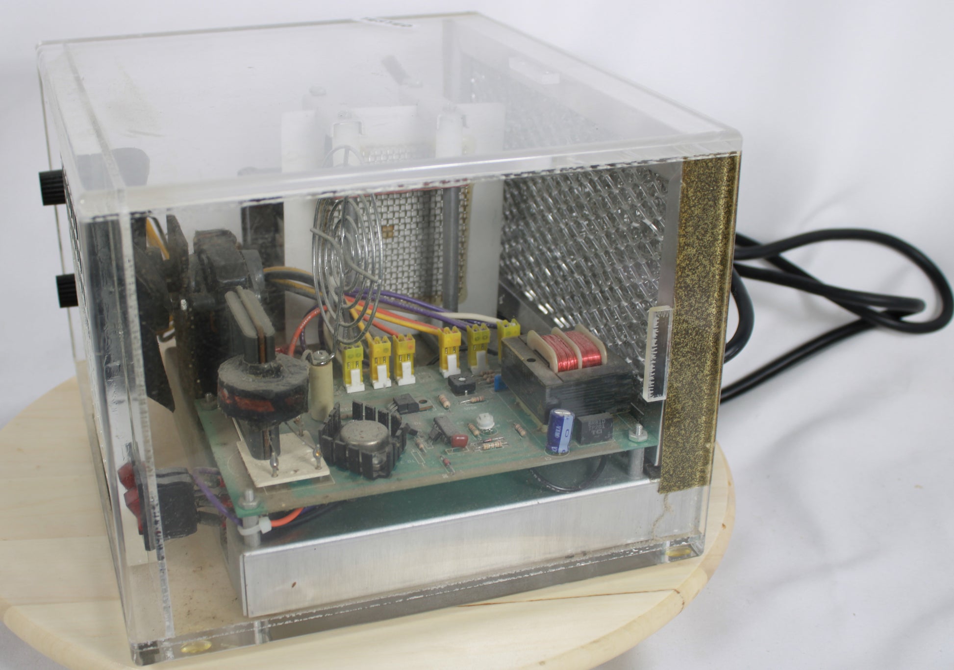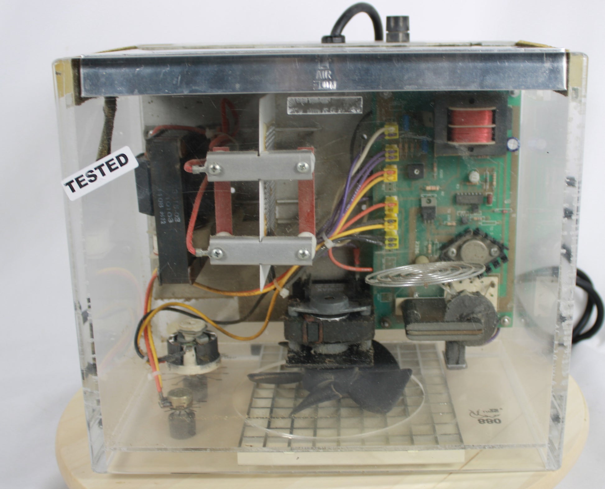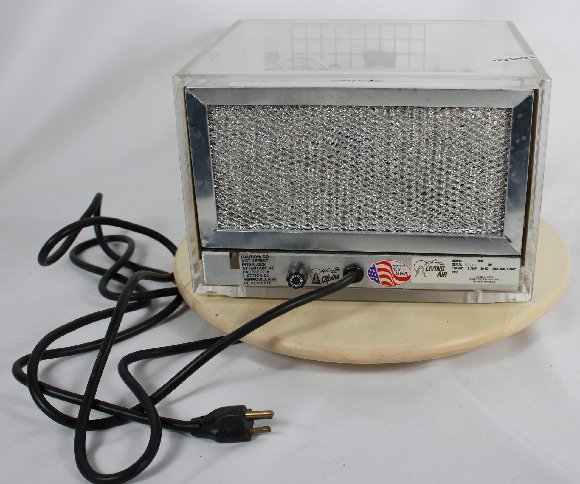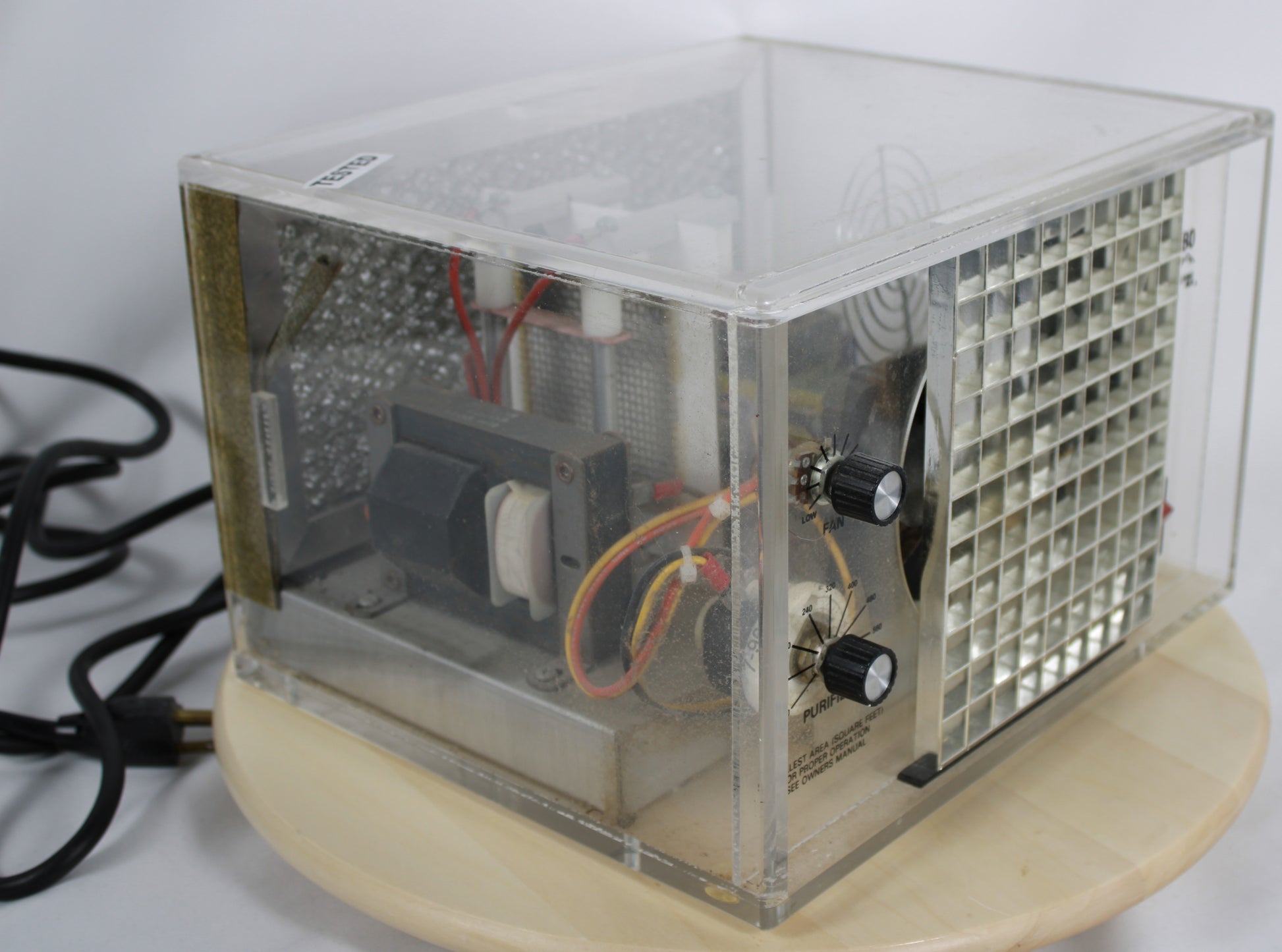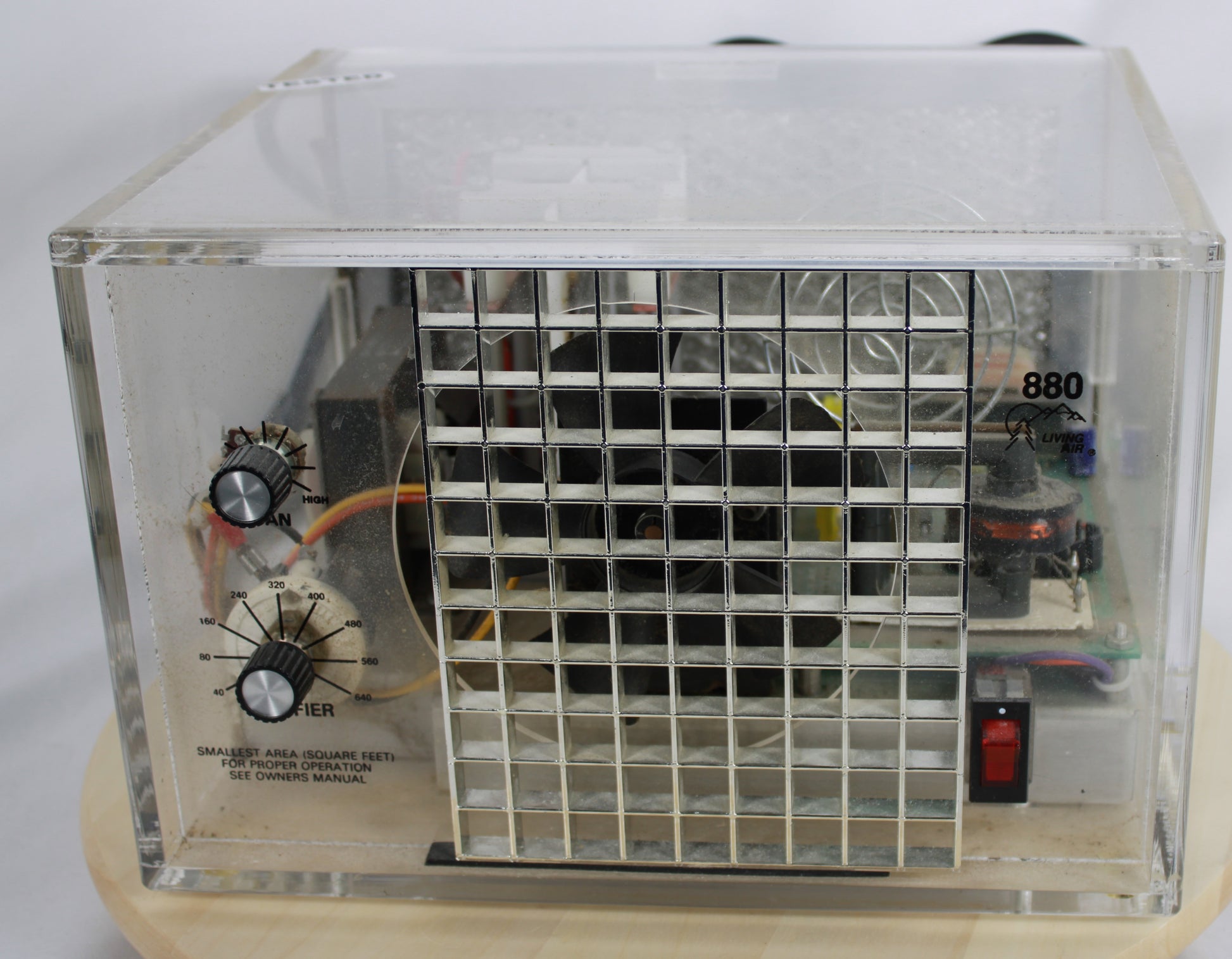 This vintage Alpine Air Living Air 880 XL is a powerful ionizer and air purification system designed to improve indoor air quality. The unit features adjustable fan speed and purification levels, allowing for customized coverage in spaces of various sizes. It is housed in a unique, clear acrylic "demonstrator" casing that provides a fascinating view of the internal components and circuitry while in operation. This model has been tested for power and includes the original aluminum mesh filter and a heavy-duty power cord.