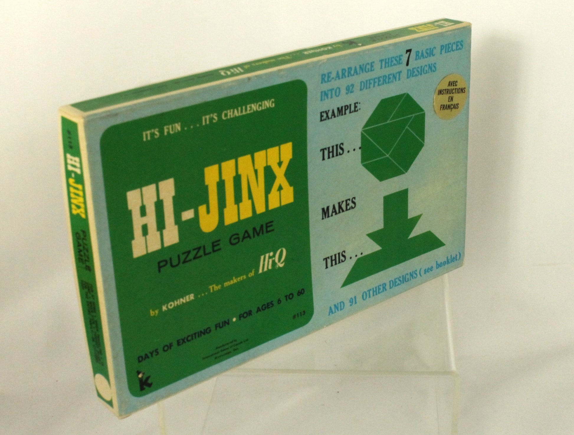 This vintage 1972 Kohner puzzle game set includes three classic games: Hexed, Hi-Jinx, and Kwazy Quilt, offering hours of brain-teasing fun for ages 6 to 60.