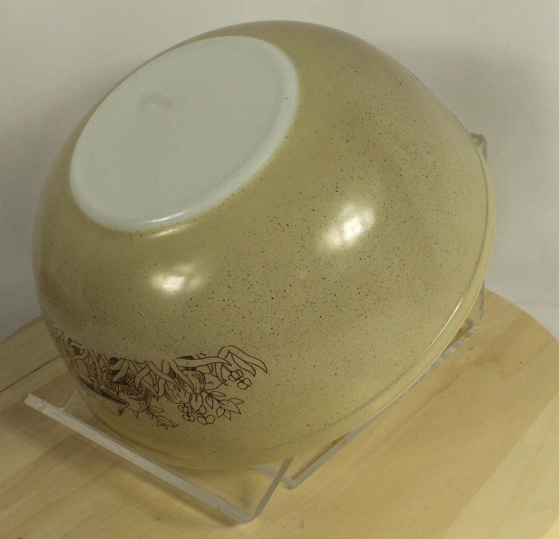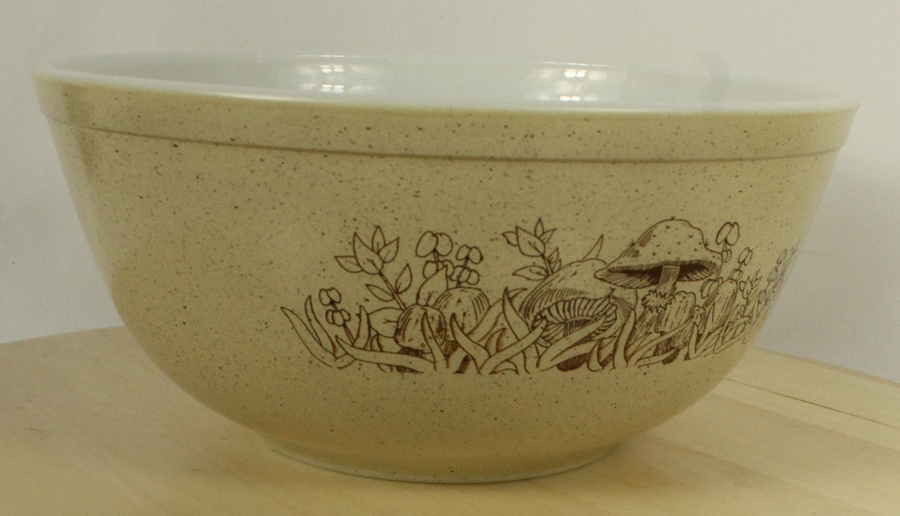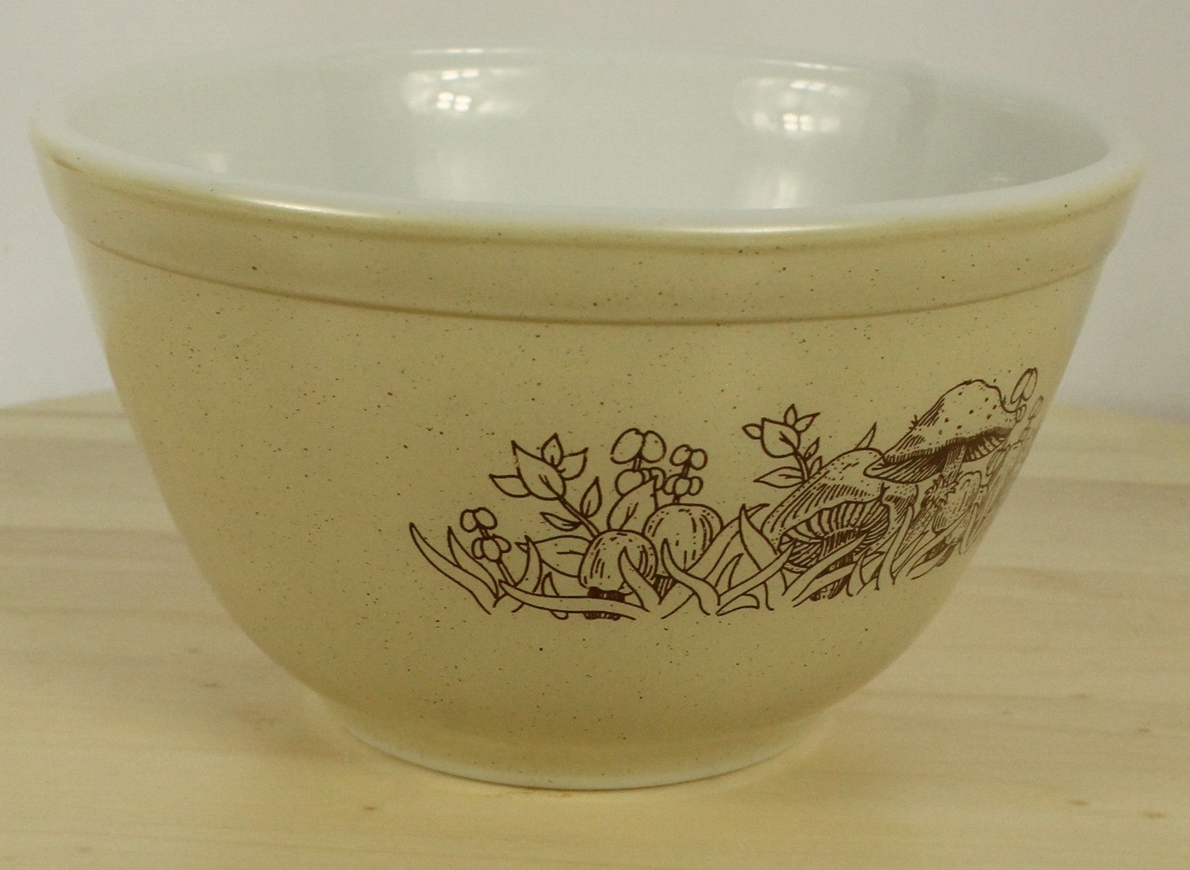 This set includes four Pyrex mixing bowls from the Forest Fancies collection, produced between 1981 and 1986. The bowls feature an assorted range of sizes and are in gently used condition, offering both charm and practicality for everyday kitchen use.