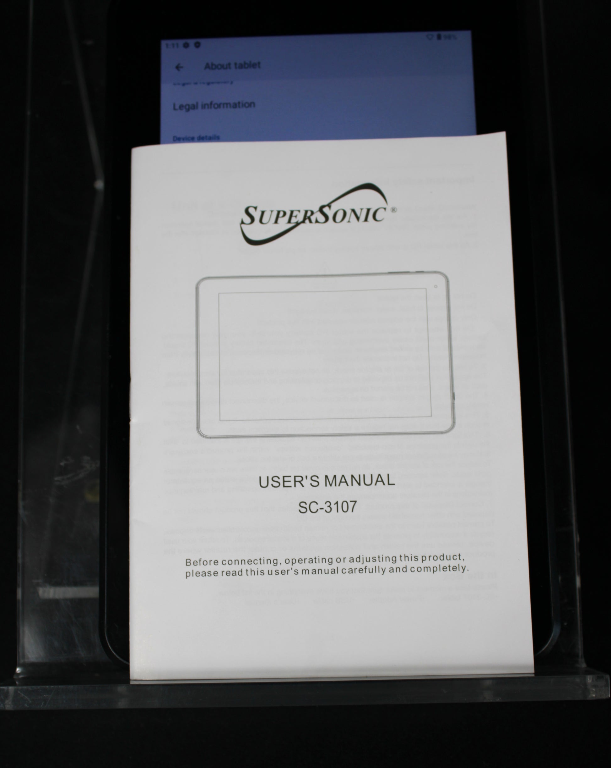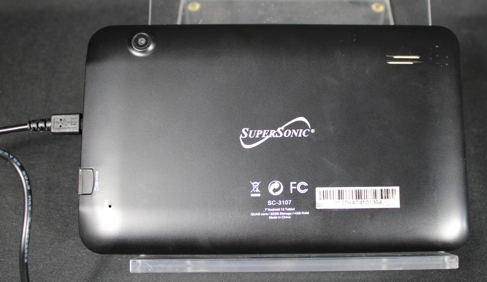 This SuperSonic Sonic 7 tablet offers a portable and efficient user experience, powered by the Android 13 operating system and a quad-core processor. It features a crisp 7-inch capacitive touchscreen with 1024 x 600 resolution, making it ideal for streaming videos, browsing the web, or reading e-books. The device is equipped with 32GB of internal storage, 4GB of RAM for smooth multitasking, and a microSD slot for expandable memory up to 32GB. Included in the original box are the tablet, a USB charging cable, an AC adapter, and the user manual, ensuring you have everything needed to get started right away. Item is confirmed to power on and charge. Full battery health and discharge cycles are unverified.