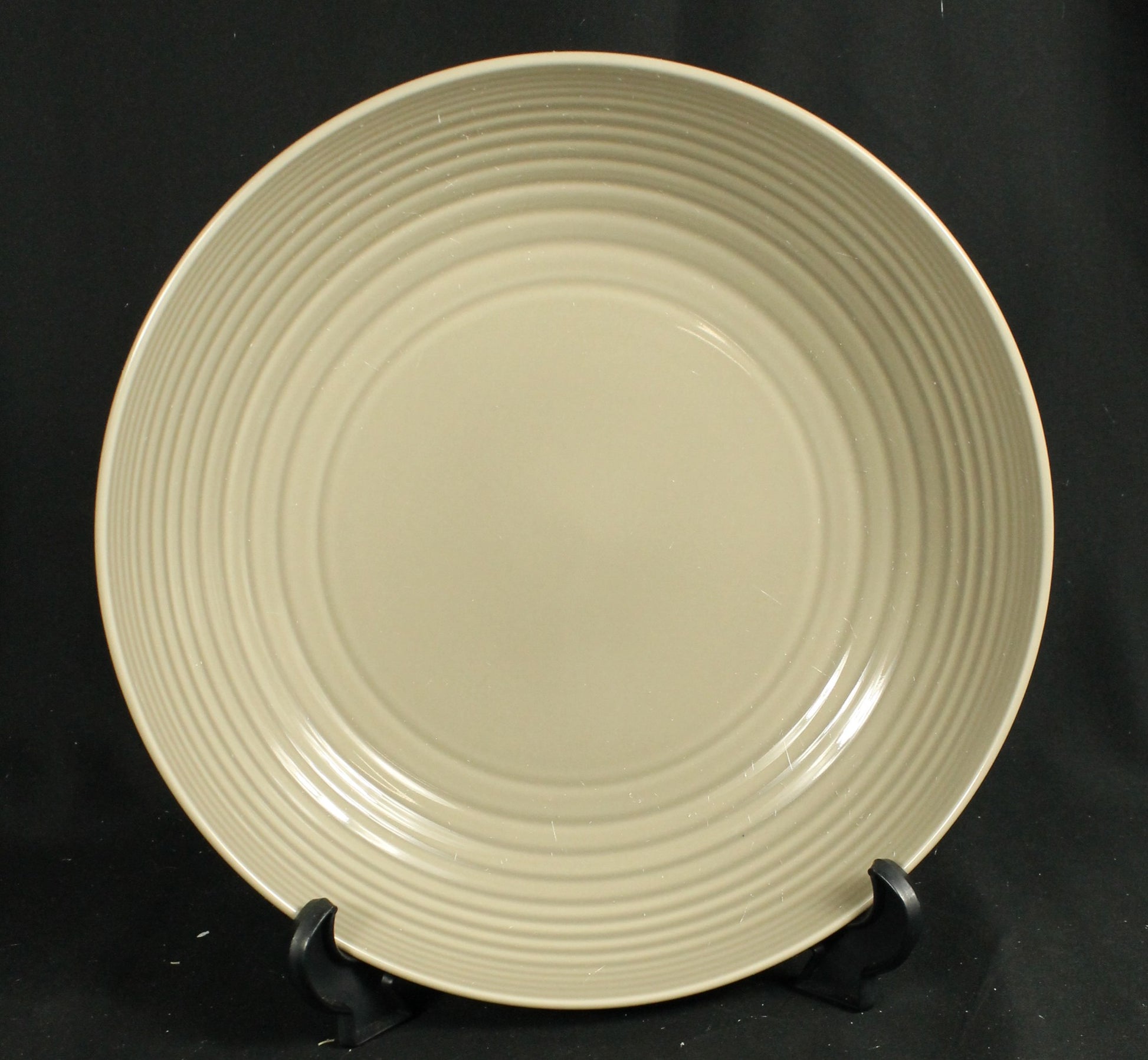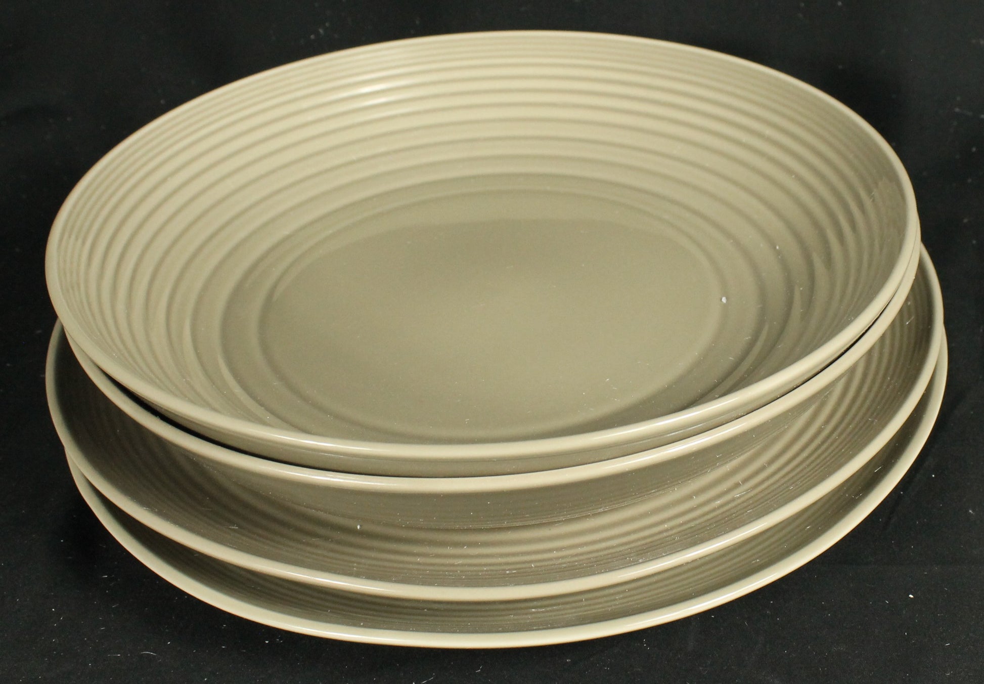 This Gordon Ramsay Royal Doulton Maze Stoneware dish set includes six taupe cups, six taupe salad plates, two taupe serving bowls, two taupe serving platters, and eight white dinner plates, all organized across six boxes. The iconic set is new in its original packaging and ready for use, offering a stylish and coordinated table setting.