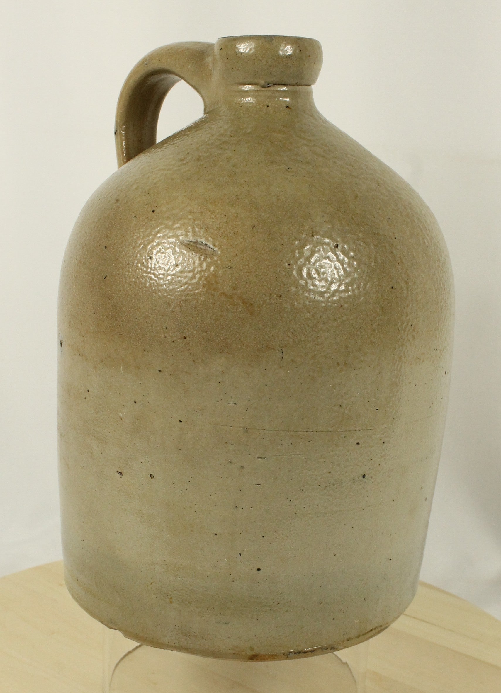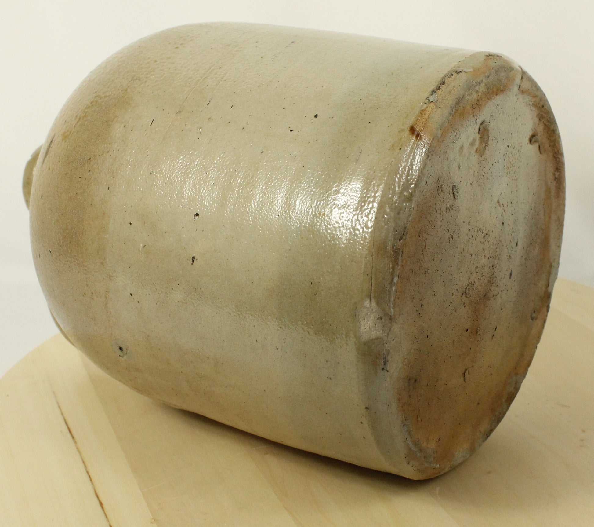 This primitive glazed stoneware crock jug is a used antique. Its rustic design and sturdy construction make it both a collectible piece and a functional item for display or storage.