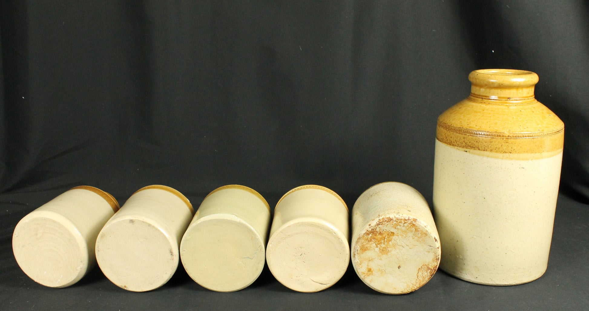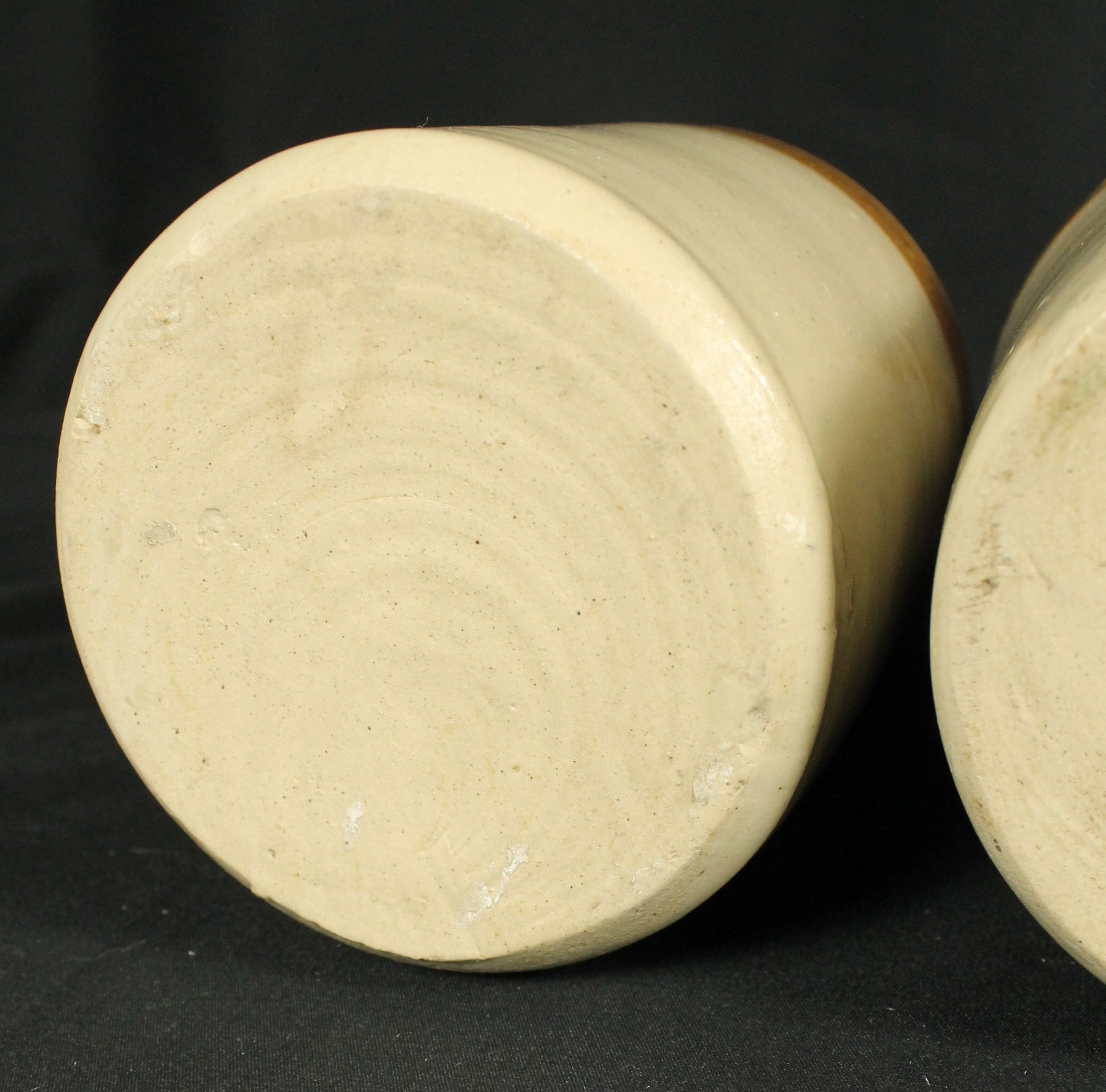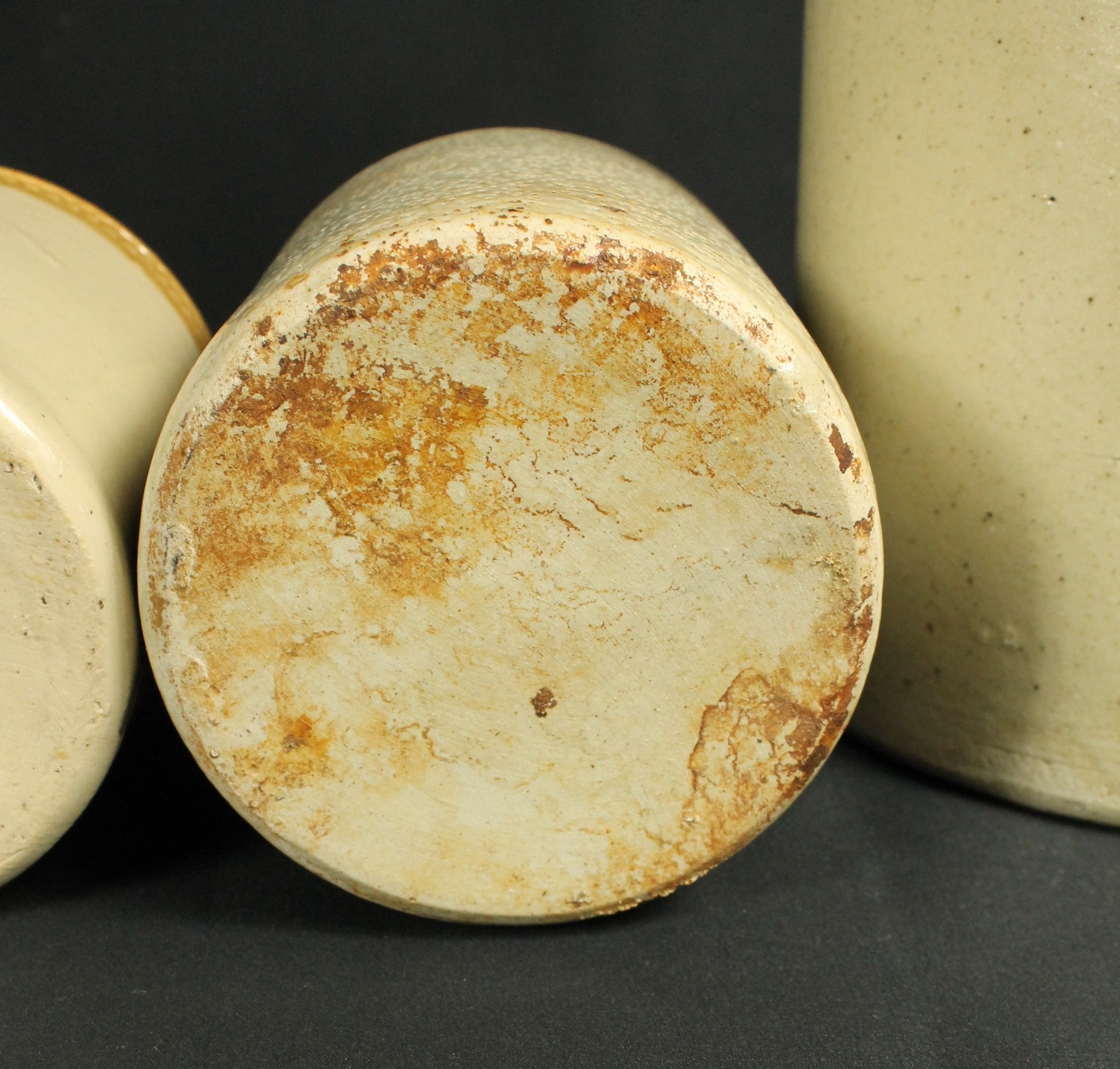 This set includes five primitive glazed crocks of varying sizes, including one large and four small pieces. They are gently used and show some manufacturer flaws, adding character and authenticity. The crocks are ideal for decorative display or collectible purposes.