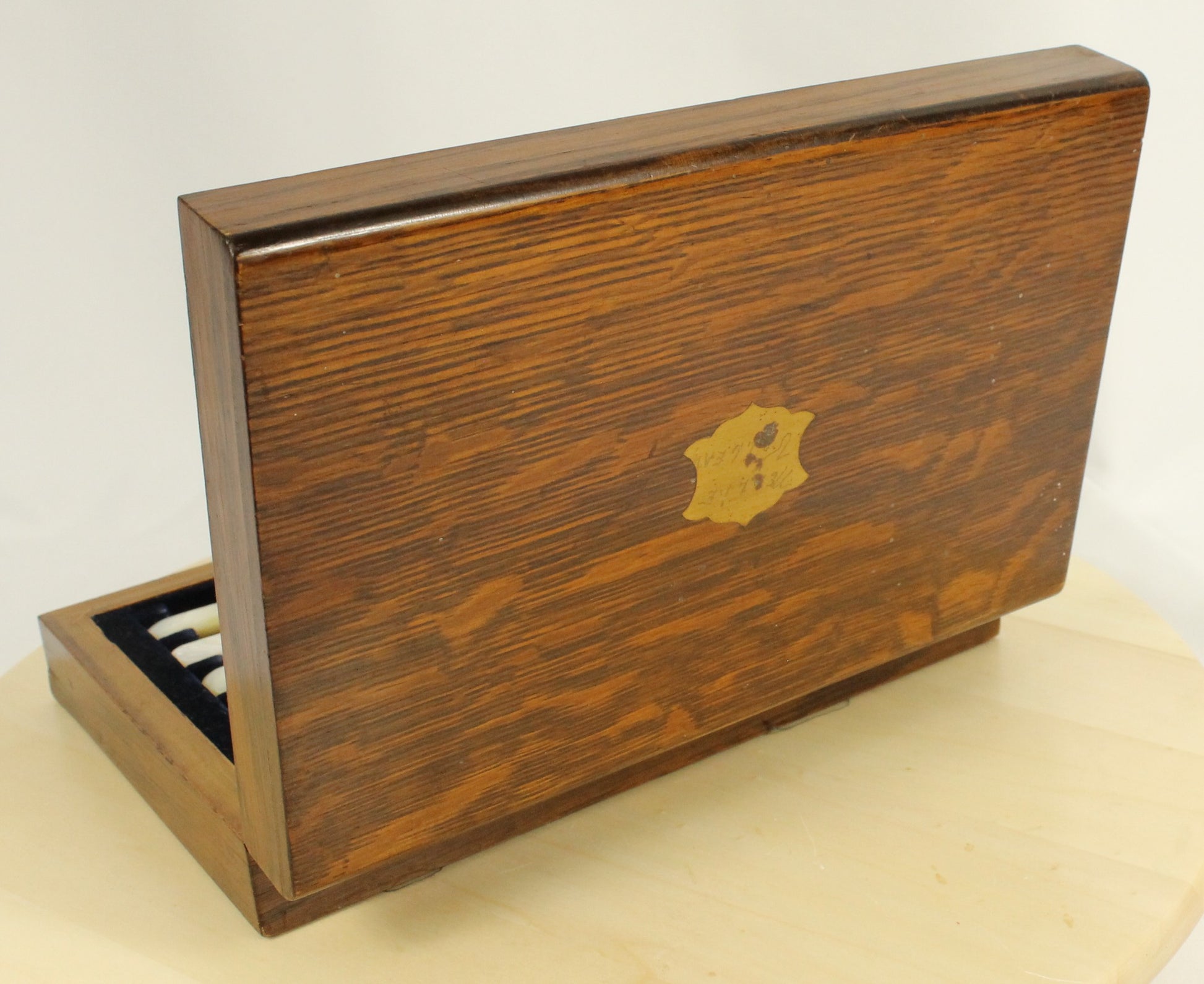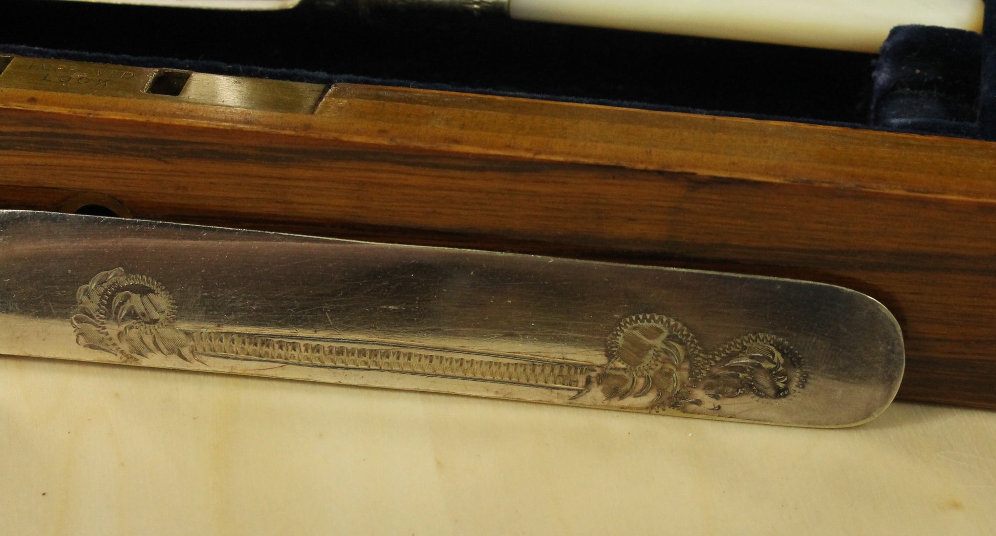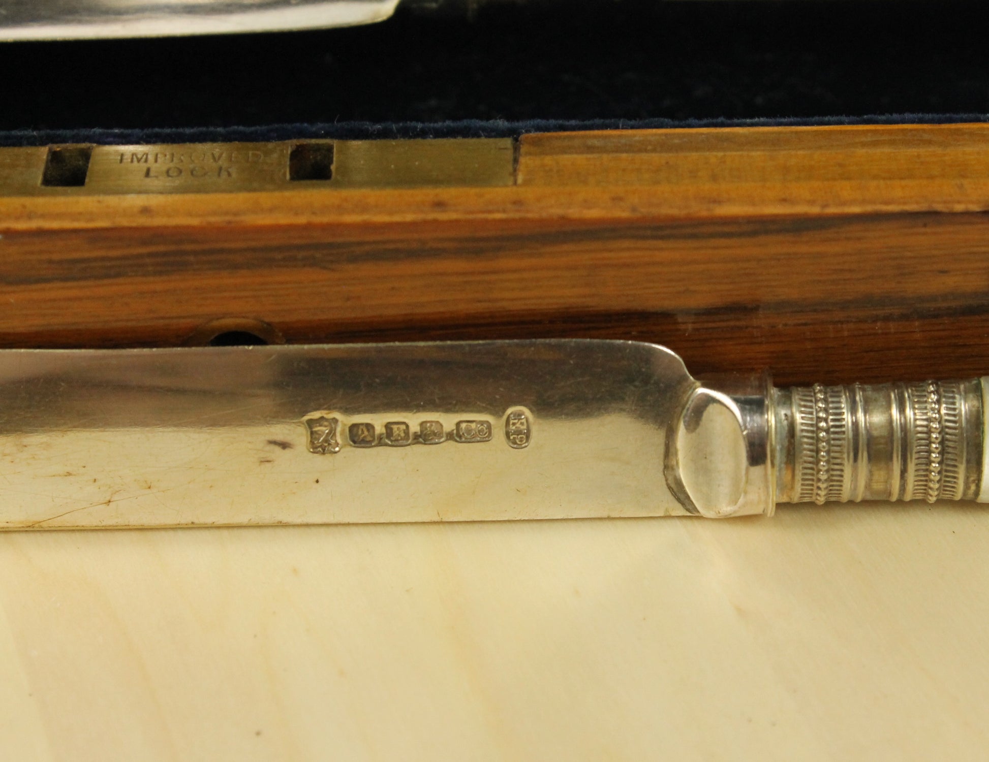 This set includes twelve antique English knives and forks featuring silver and mother-of-pearl handles. The pieces are well-crafted and exhibit classic design details, making them both functional and collectible.