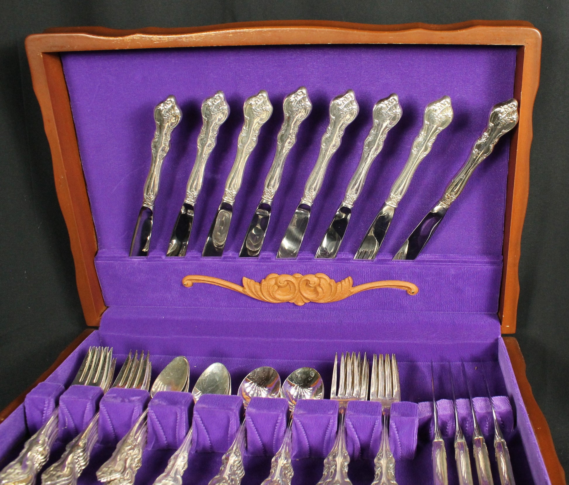 This 81-piece silverware set by 1847 Rogers Bros features the Orleans pattern and comes with its original box. The pieces are assorted in size and are used (see photos). They offer a classic design suitable for both everyday use and special occasions.