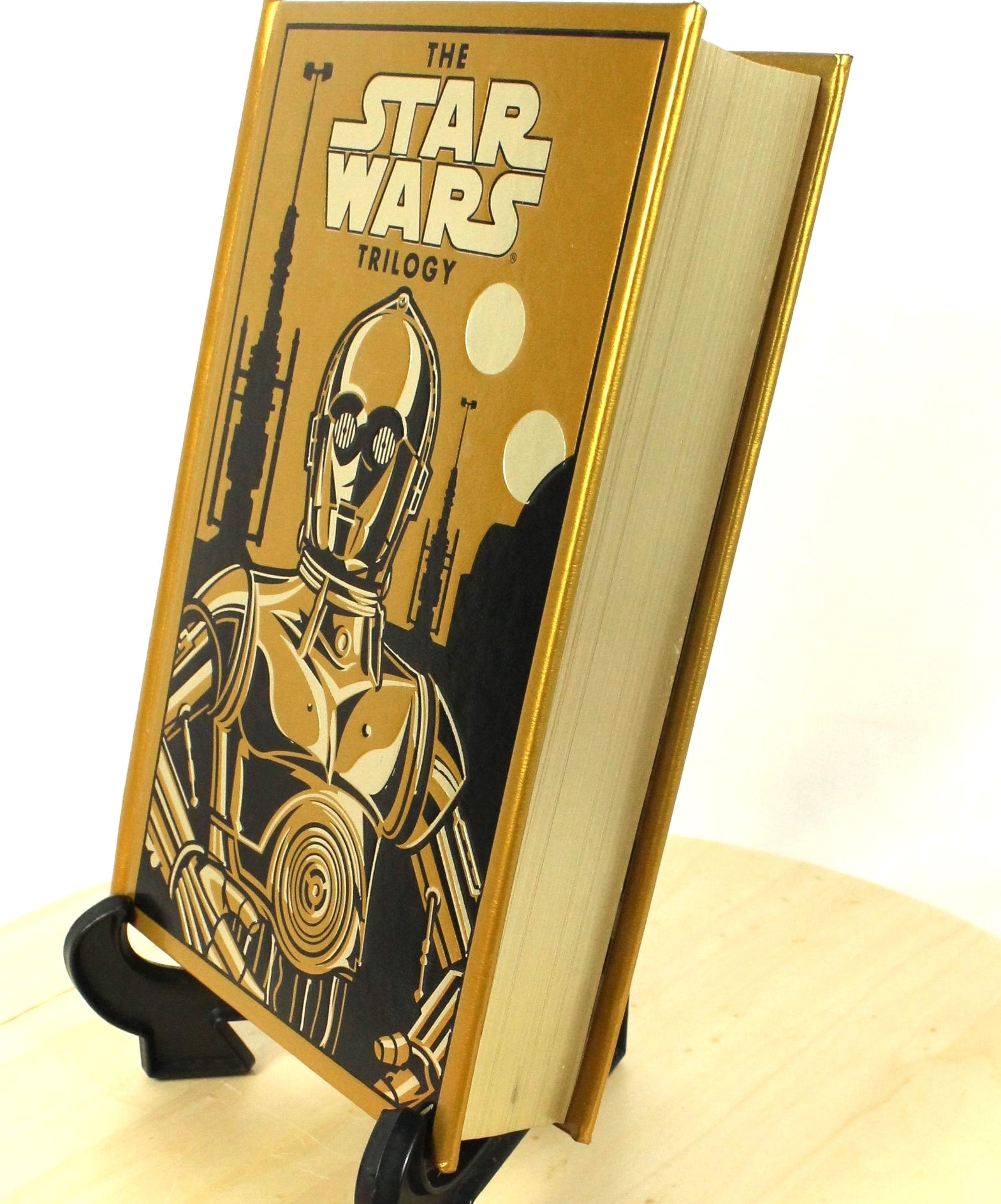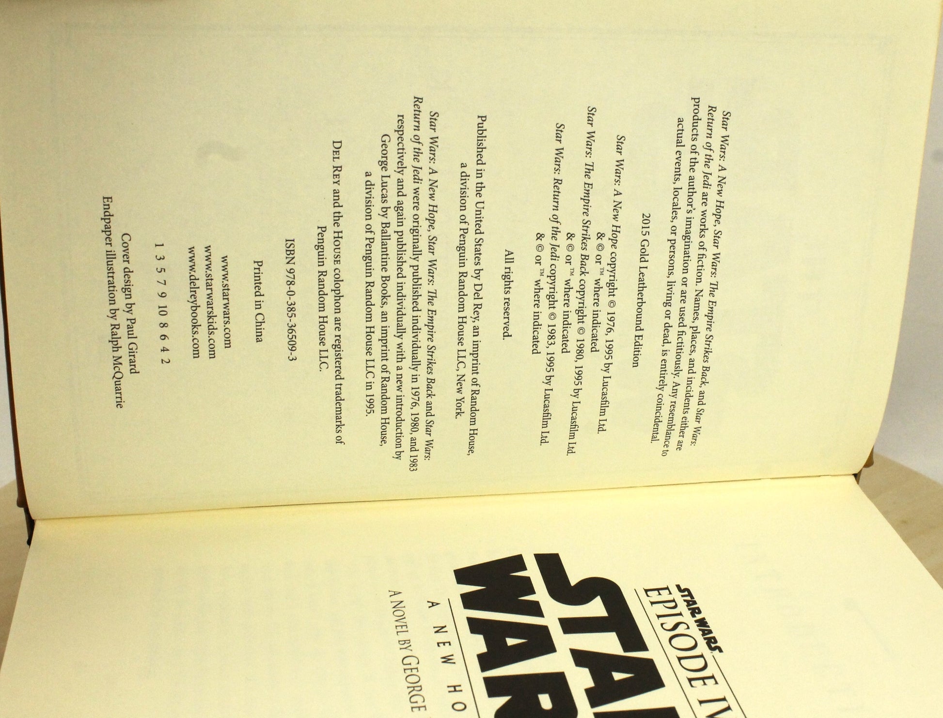 This 2015 Star Wars Trilogy is a gold leather-bound edition by Ballantine Books, featuring edition 978-0-385-36509-3. A beautifully crafted collectible, it combines elegant design with the timeless Star Wars saga.