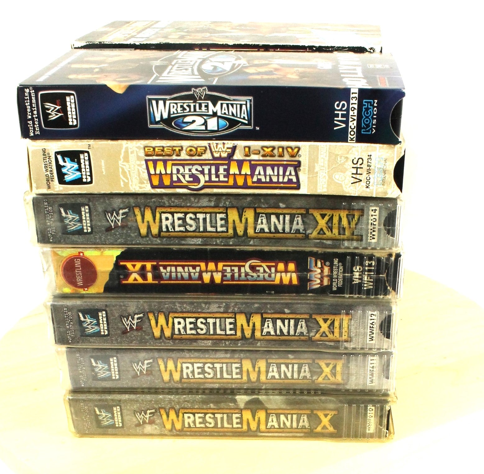 This collection includes 14 WWF wrestling VHS tapes, featuring WrestleMania V, VI (2 tapes), VII, VIII (2 tapes), X, XI, XII, XIV, Best of XIV, Greatest Matches, and XXI.
