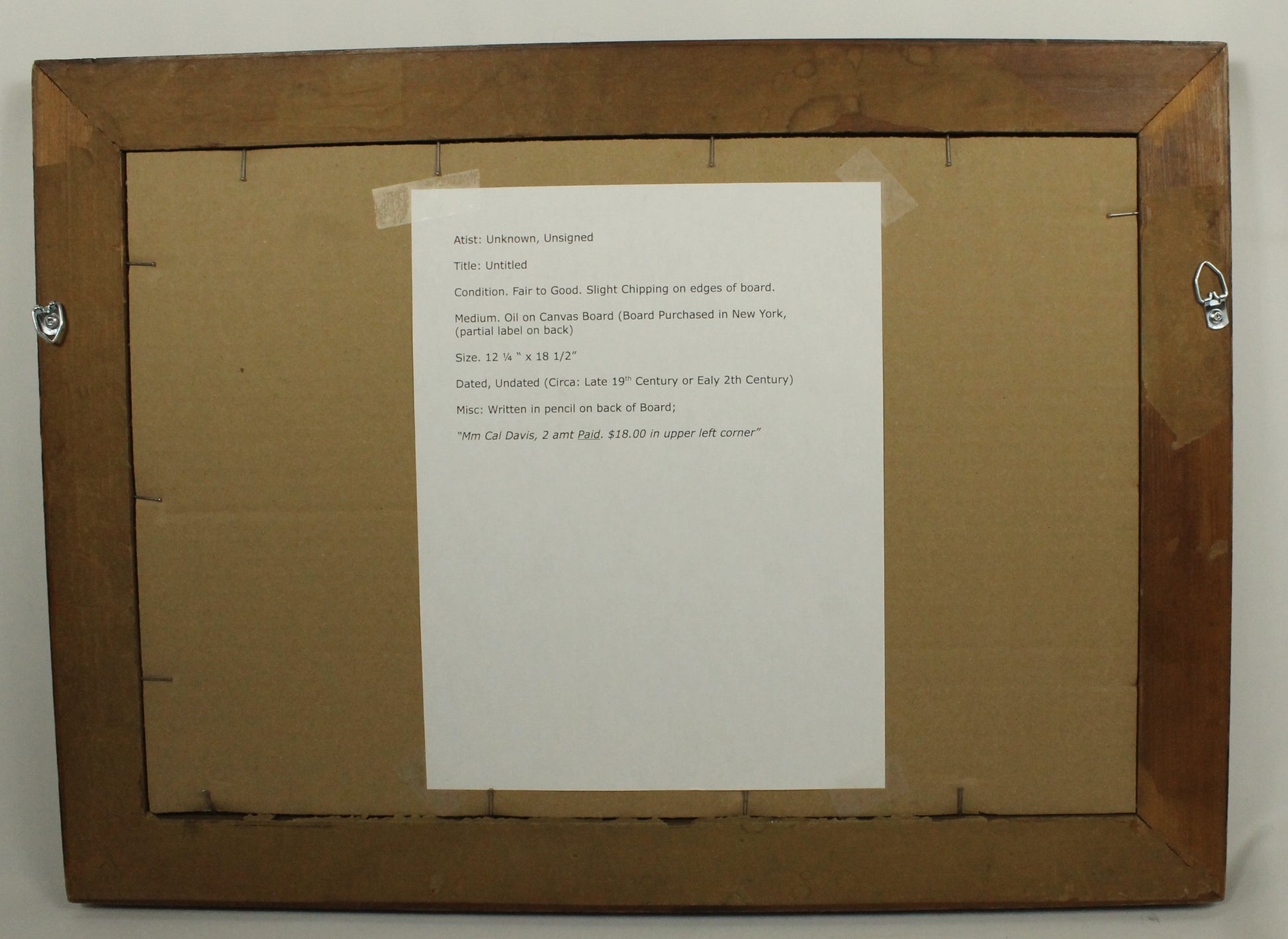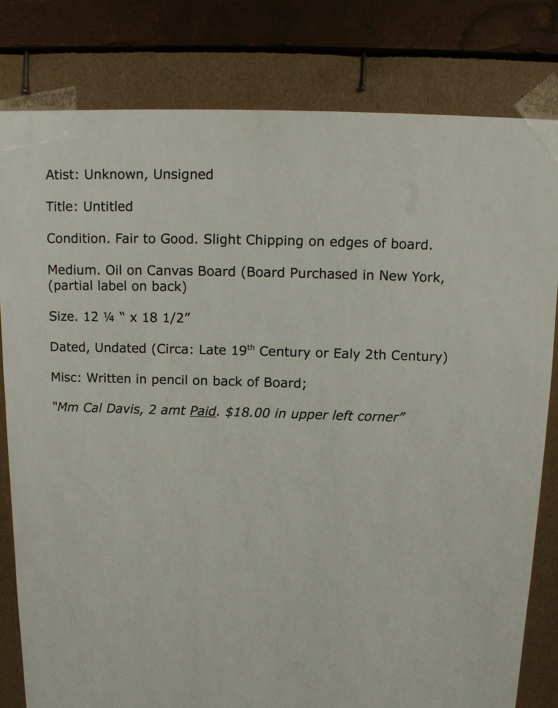 Evocative antique oil painting on canvas board, capturing a serene wetland scene with a heavy presence of water lilies and tall reeds. Believed to be from the Late 19th Century. The painting's dimensions are approximately 12 1/4" x 18 1/2". It comes complete with its original, decorative gilded frame. The painting has a rich history, with an old note on the back indicating it was purchased in New York.