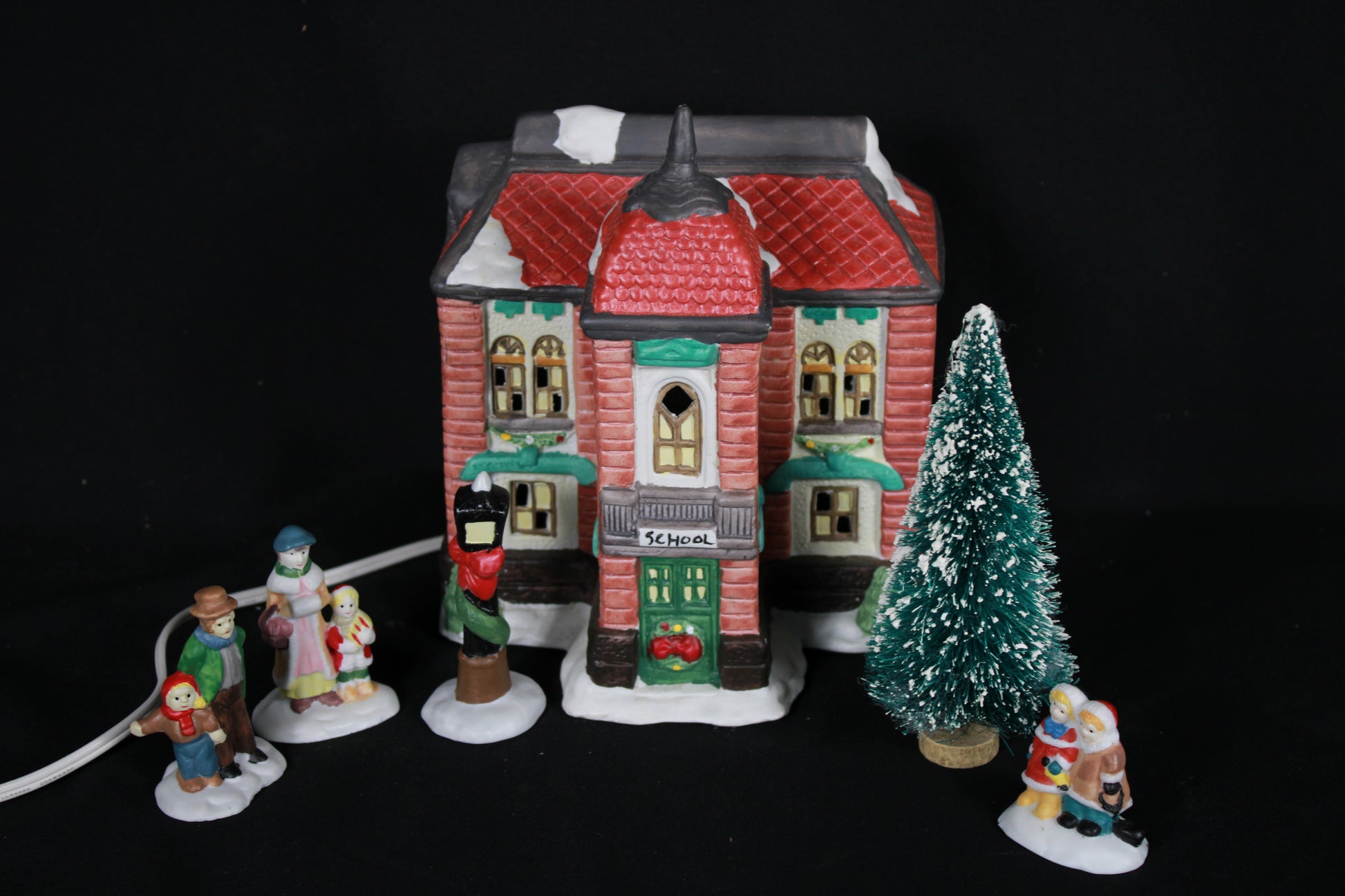 Create a massive, glowing holiday display instantly with this fantastic Lot of 5 Zellers Dickens' Lighted Ceramic Village Sets! Although the boxes are opened and show some wear, these five complete sets—including the Church, School, and Post Office—offer exceptional value for collectors. Each 7-piece, hand-painted set is ready to illuminate, bringing a charming, nostalgic Victorian scene to life on your mantel or table. Don't miss this opportunity to acquire five distinct, festive buildings for one great price! The original wiring is functional, however, we recommend professional inspection and rewiring for modern safety standards if you plan on regular use. Please note four boxes are complete sets, and the church set has had a bench added in place of a missing figure.