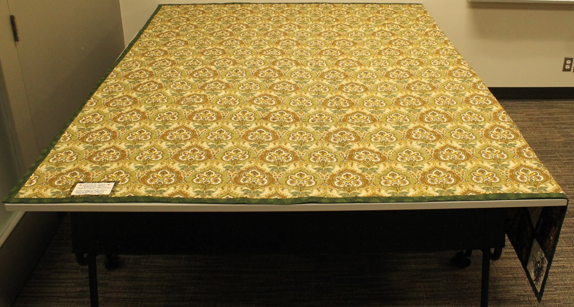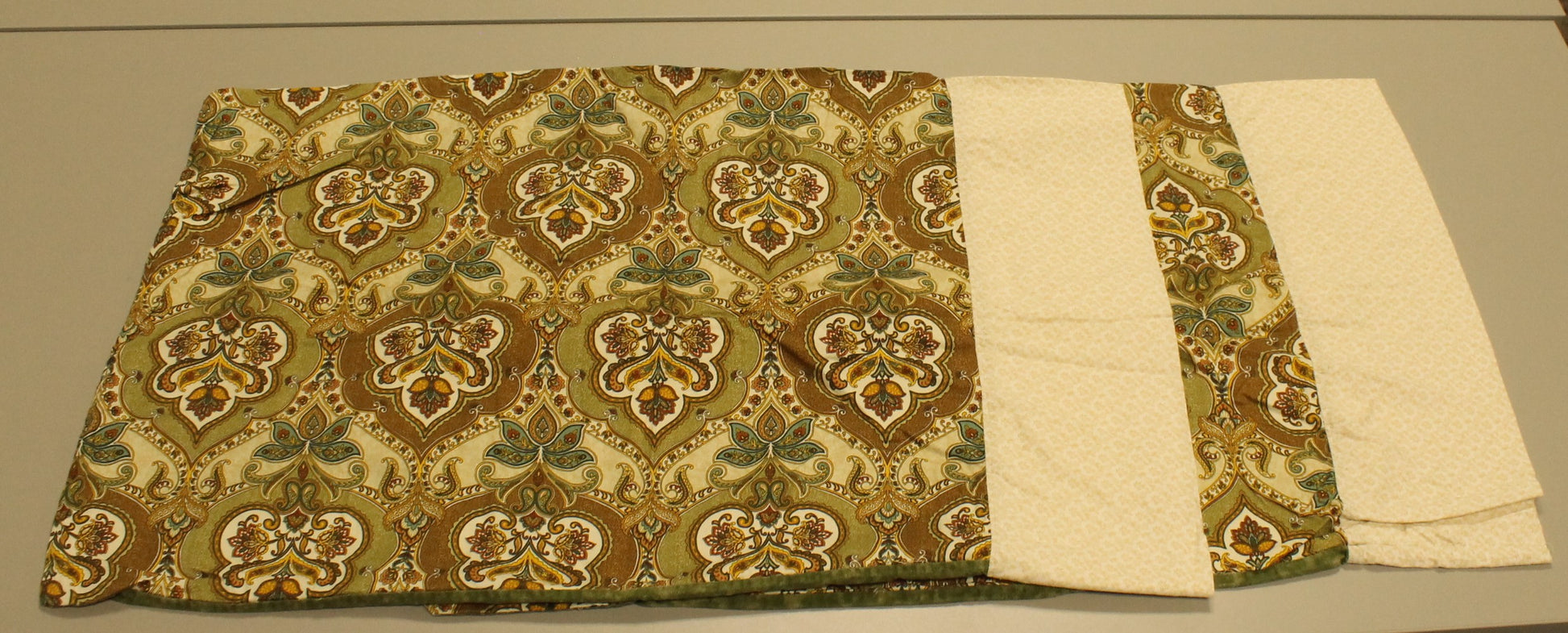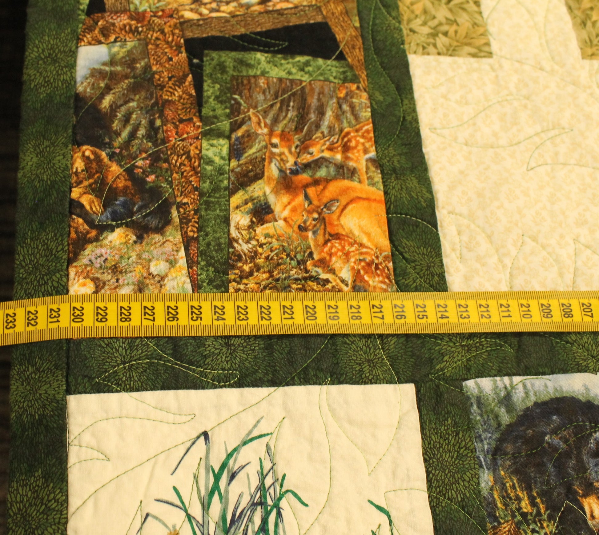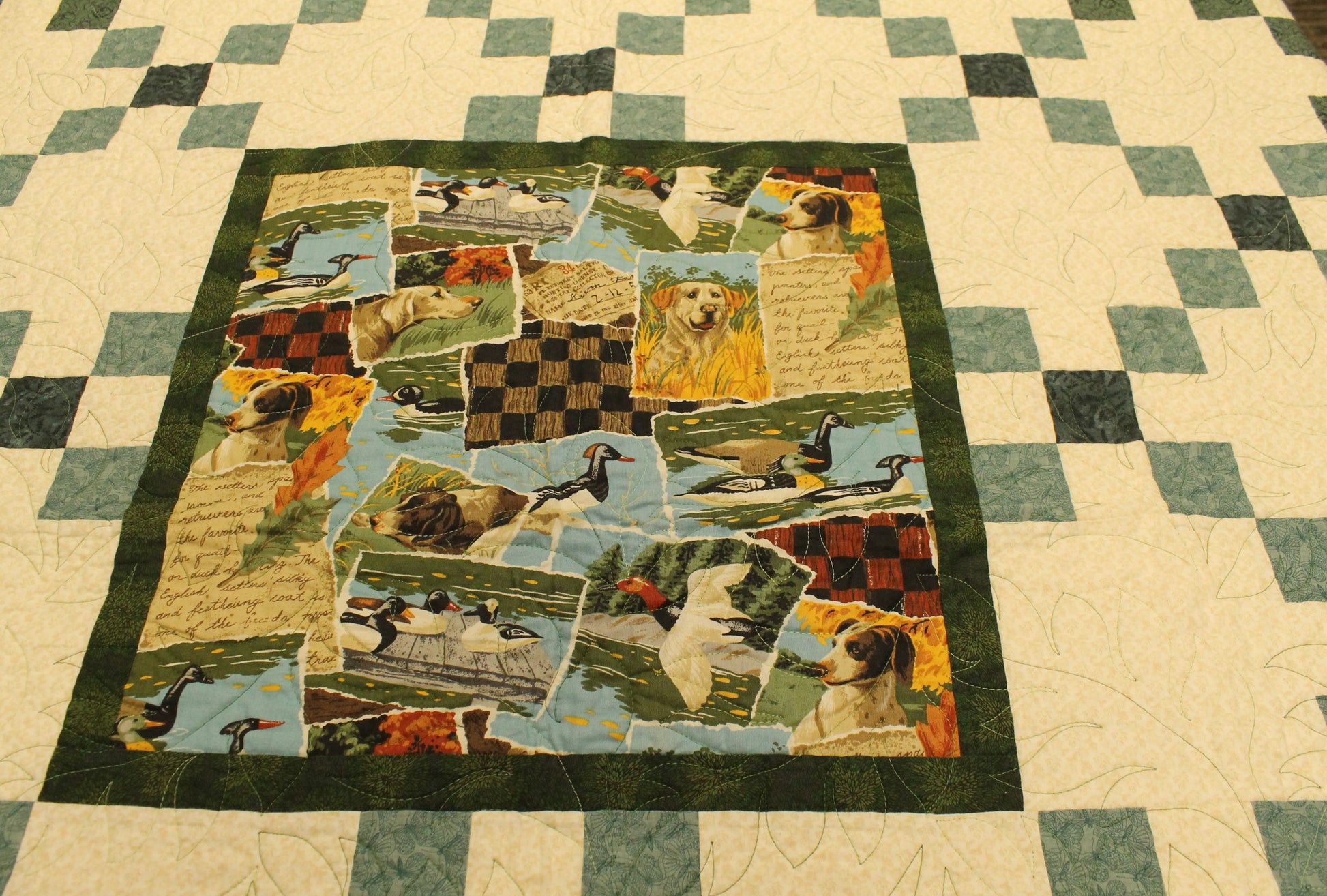 This double-size quilt set, created in 2023 by Marilyn Cook, features an engaging wildlife and nature theme with detailed photo-style fabric squares of deer, bears, raccoons, and ducks. The central panel and borders contrast beautifully with the classic Irish Chain pattern block work. While the top is handmade, the quilt is professionally machine-quilted for durability and comes complete with two matching pillow shams. With a cotton blend batting (80% Cotton, 20% Poly), this set is ready to bring a cozy, rustic cabin or lodge feel to any bedroom.