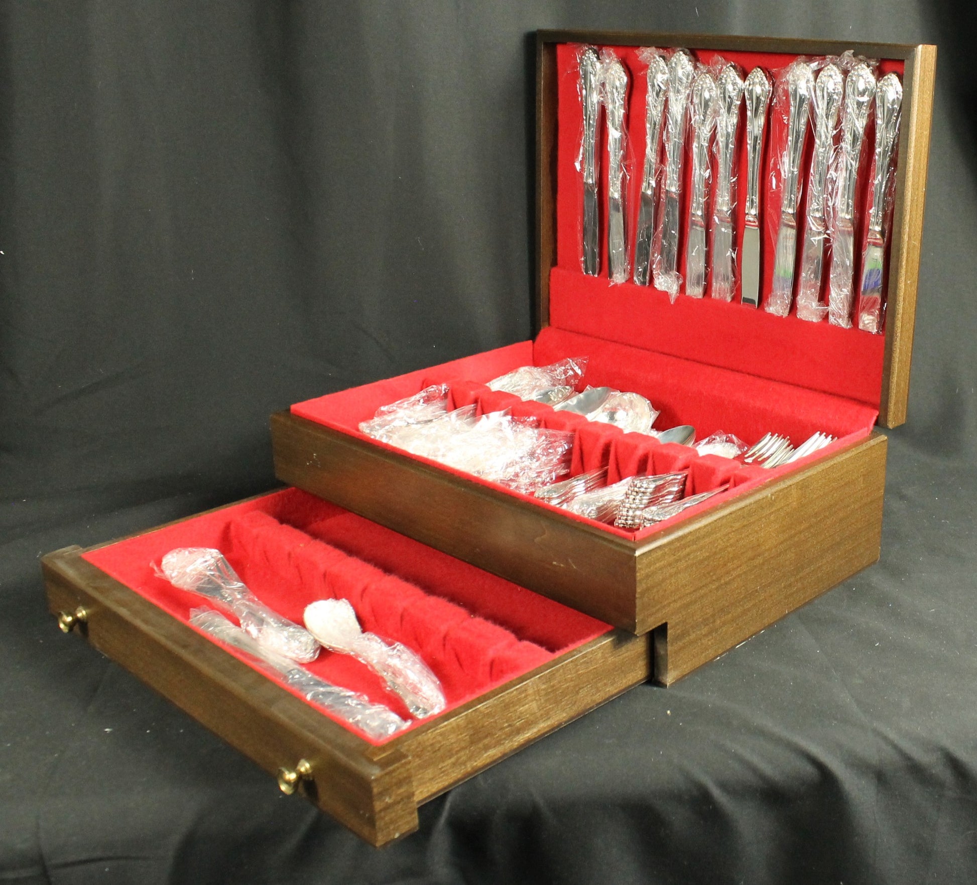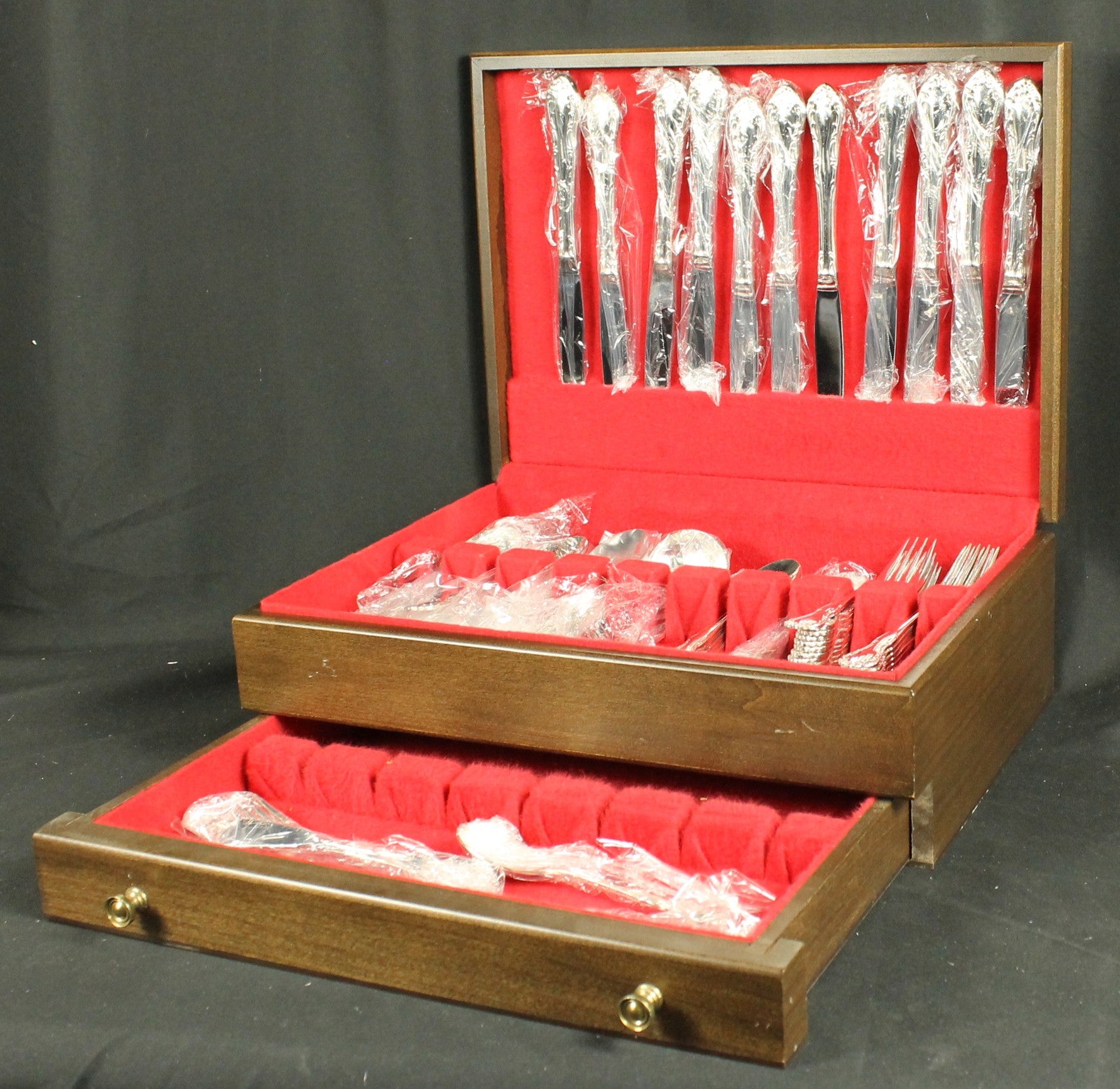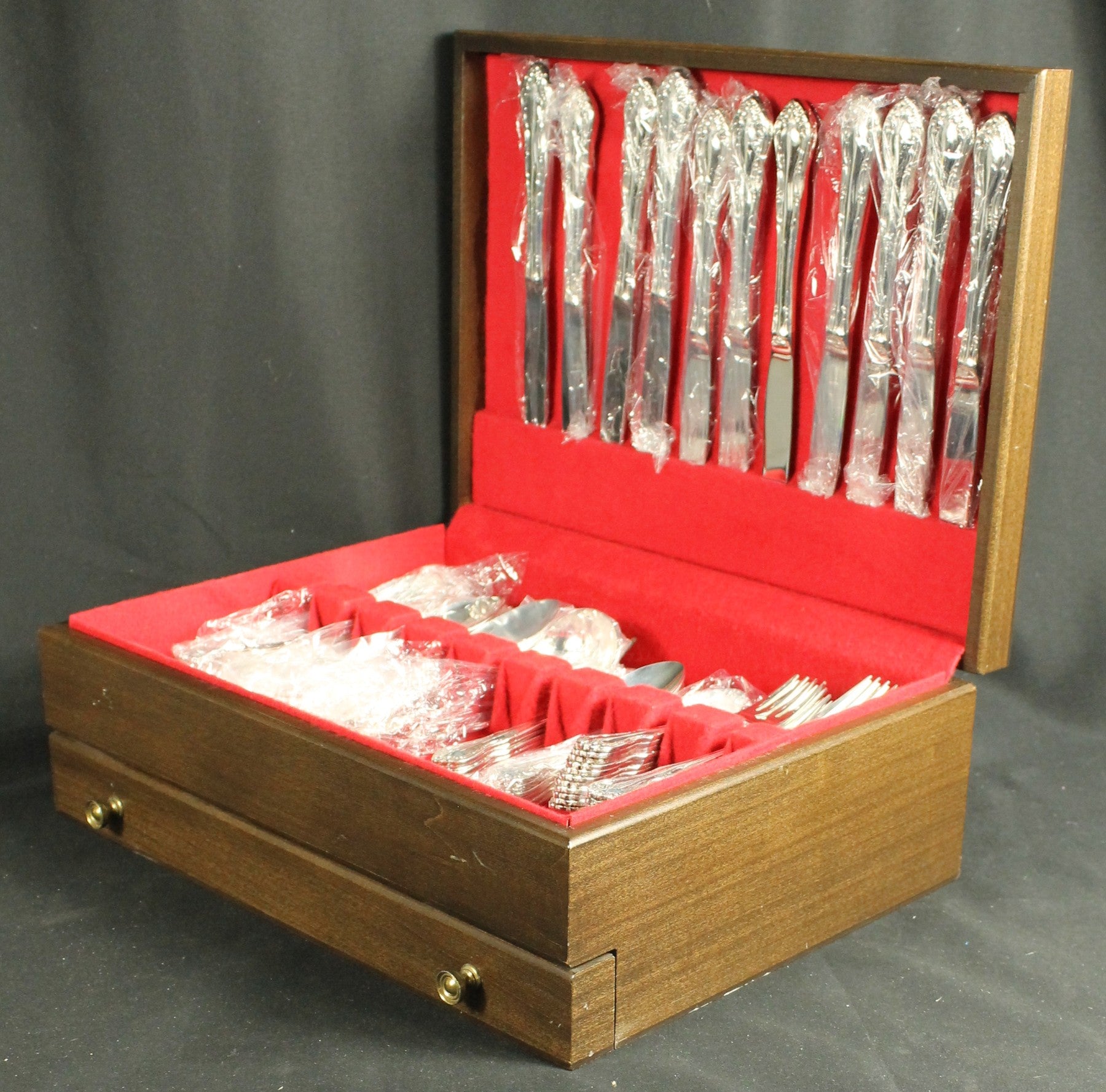This 64-piece flatware set features the elegant Magnolia pattern, complete with its original storage box. The set is in new condition, with some utensils still sealed in plastic.