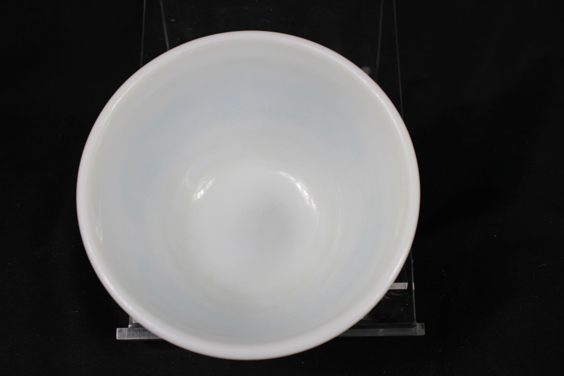This set features the classic Horizon Blue pattern, including the 1.5-pint patterned bowl and the 1.5-quart solid blue bowl. Both pieces show signs of heavy use, including noticeable "flea bites" and exterior finish wear on the solid blue 402 bowl. The white 401 bowl contains interior gray markings and staining consistent with frequent use of a handheld electric mixer. Despite the cosmetic wear, both bowls remain structurally sound with no cracks, making them excellent functional additions to a daily-use vintage kitchen collection.