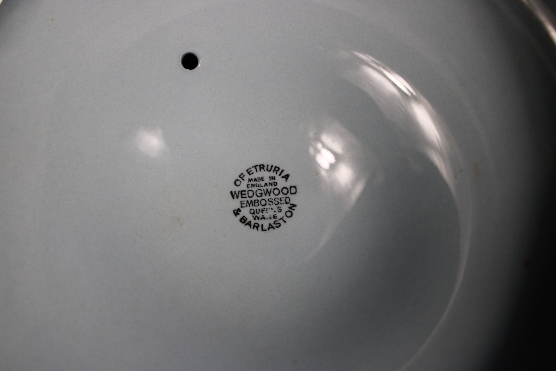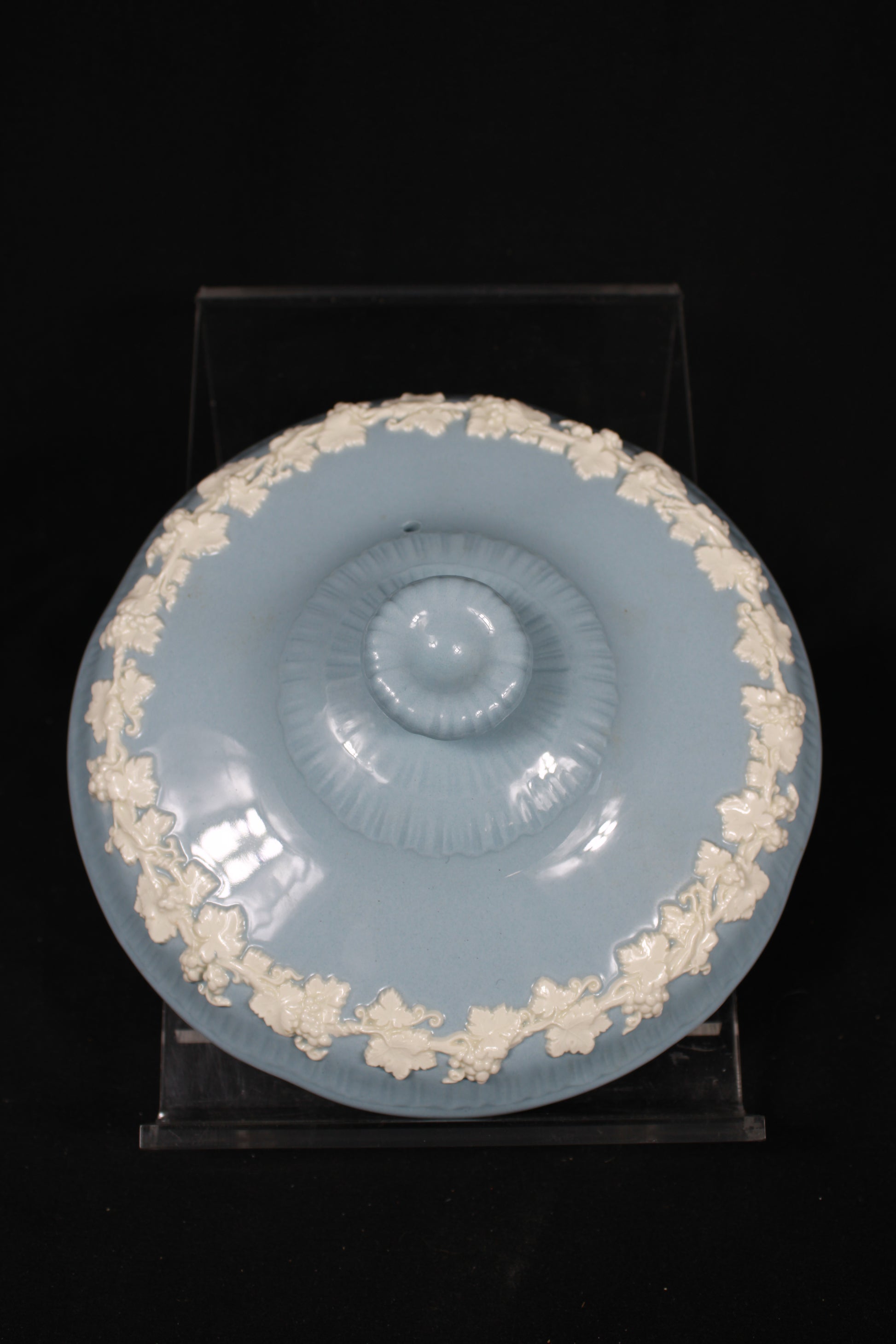 This elegant Wedgwood Queen's Ware vegetable tureen features a classic lavender blue glaze accented by an intricate white embossed grapevine relief. Produced at the historic Barlaston factory in England, this piece showcases the refined "Etruria" style that has made Wedgwood a staple of sophisticated dining for generations. The tureen is in good structural condition with no visible chips or cracks, though it does display some light grime buildup within the deep crevices of the cream-colored floral details. With a gentle cleaning, this authentic mid-century piece will serve as a stunning centerpiece or a functional addition to a traditional tabletop collection.