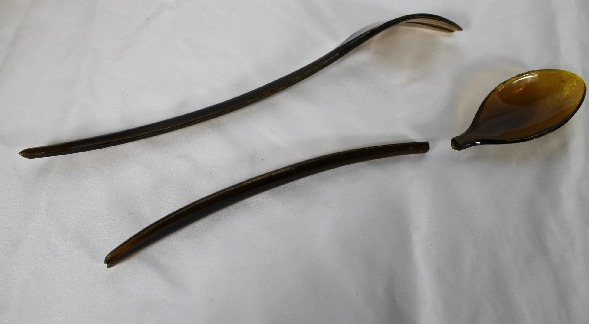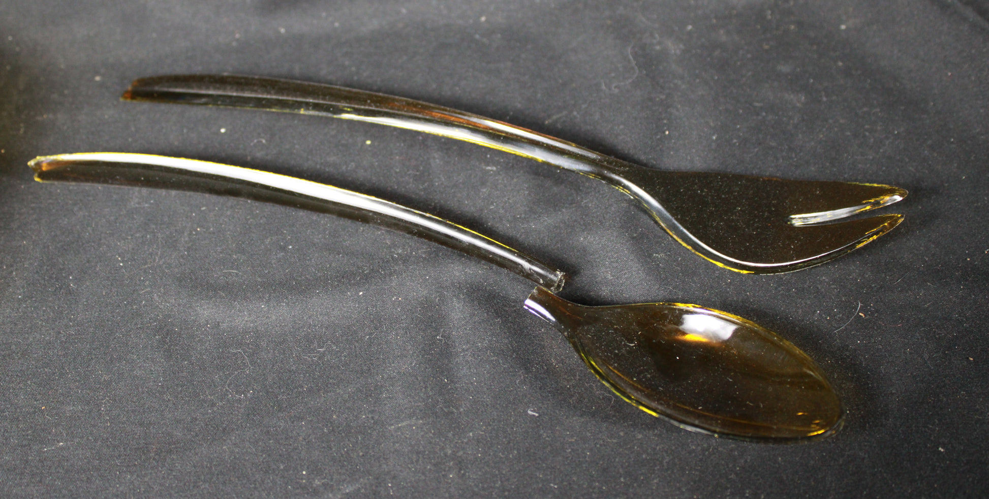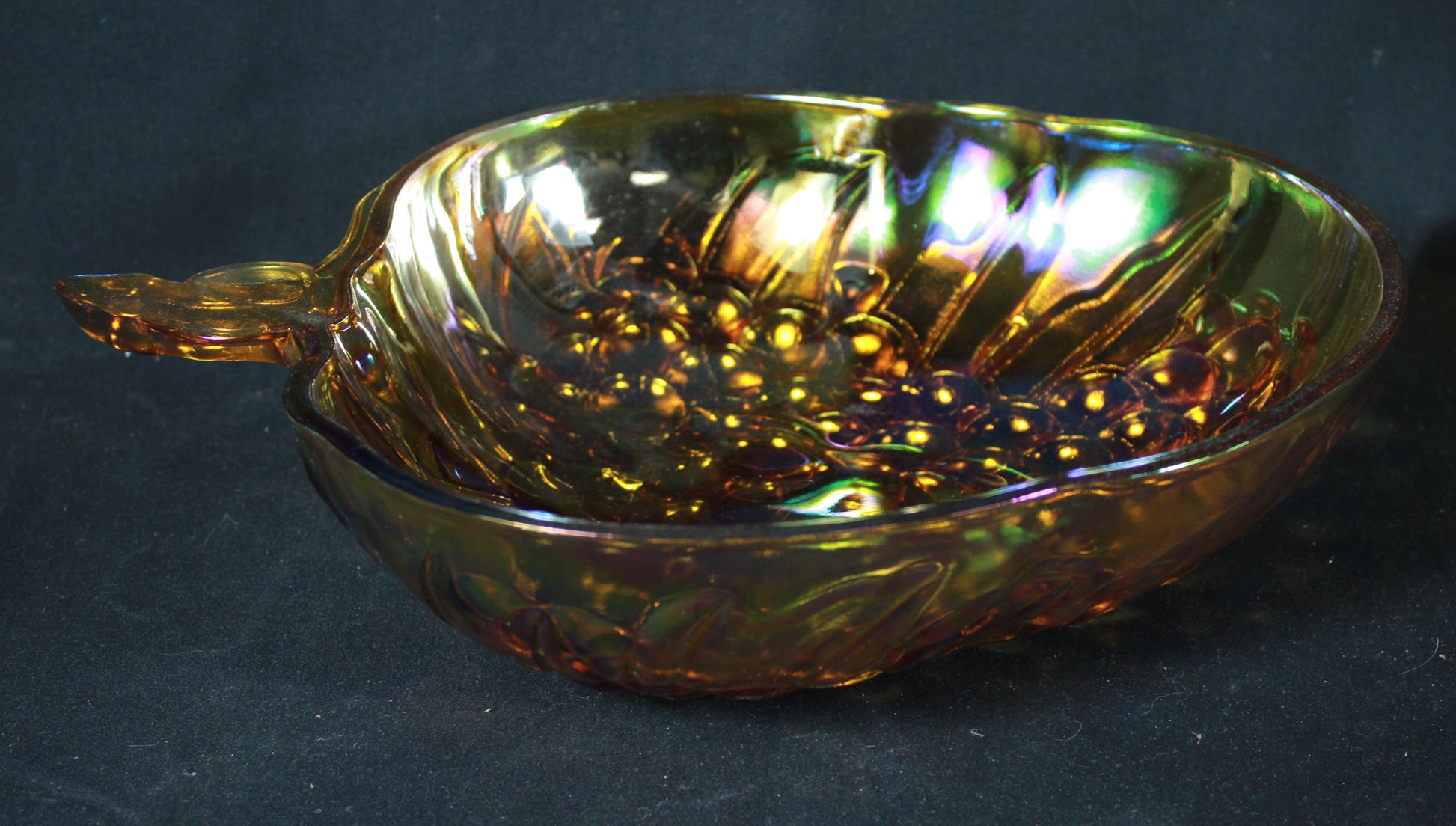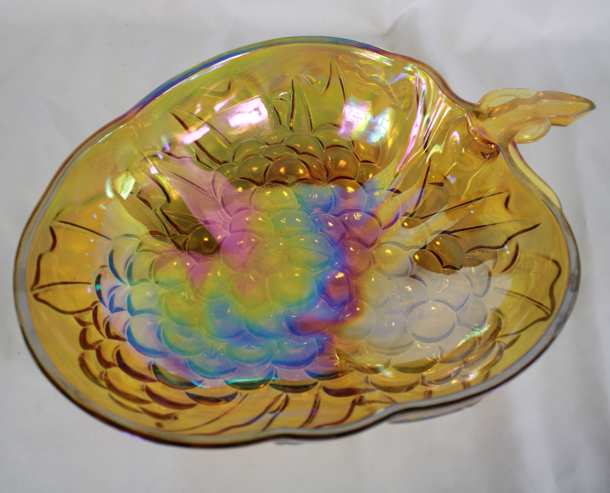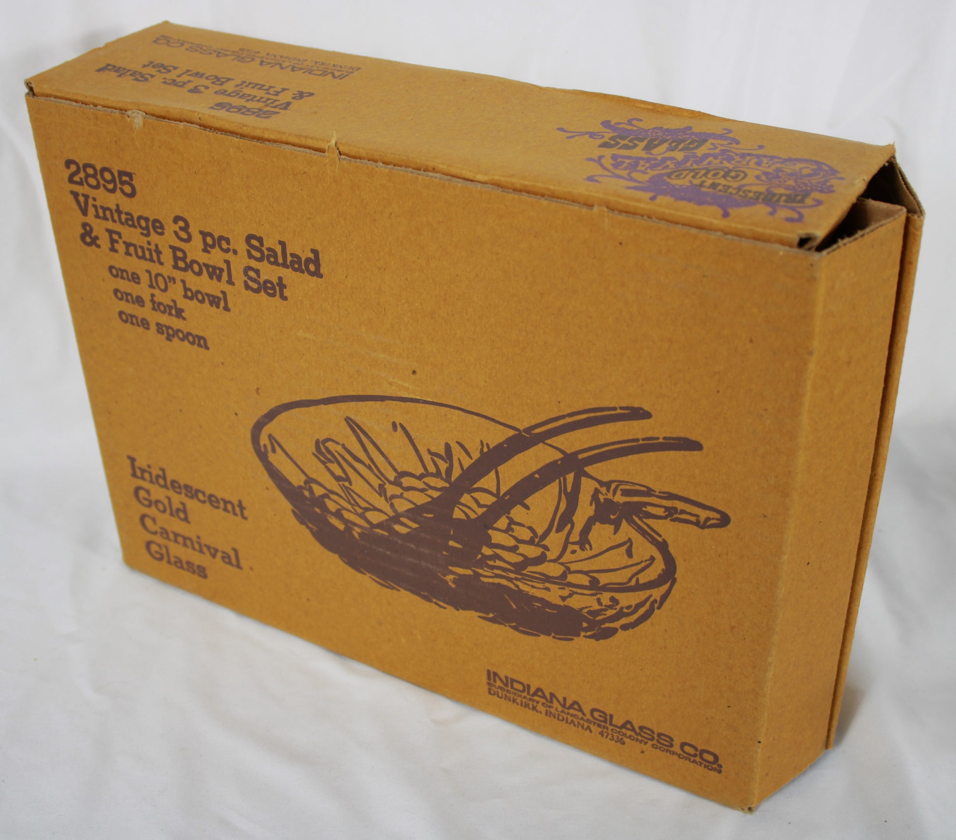 This vintage 3-piece set from Indiana Glass features a 10-inch iridescent gold carnival glass bowl with a detailed embossed fruit pattern. The set includes the original manufacturer’s box and two dark amber-toned serving utensils. Please note that while the glass bowl is in excellent condition, the plastic serving spoon has been broken into two pieces and would require repair. This remains a beautiful collector’s item or a stunning decorative centerpiece for any home.
