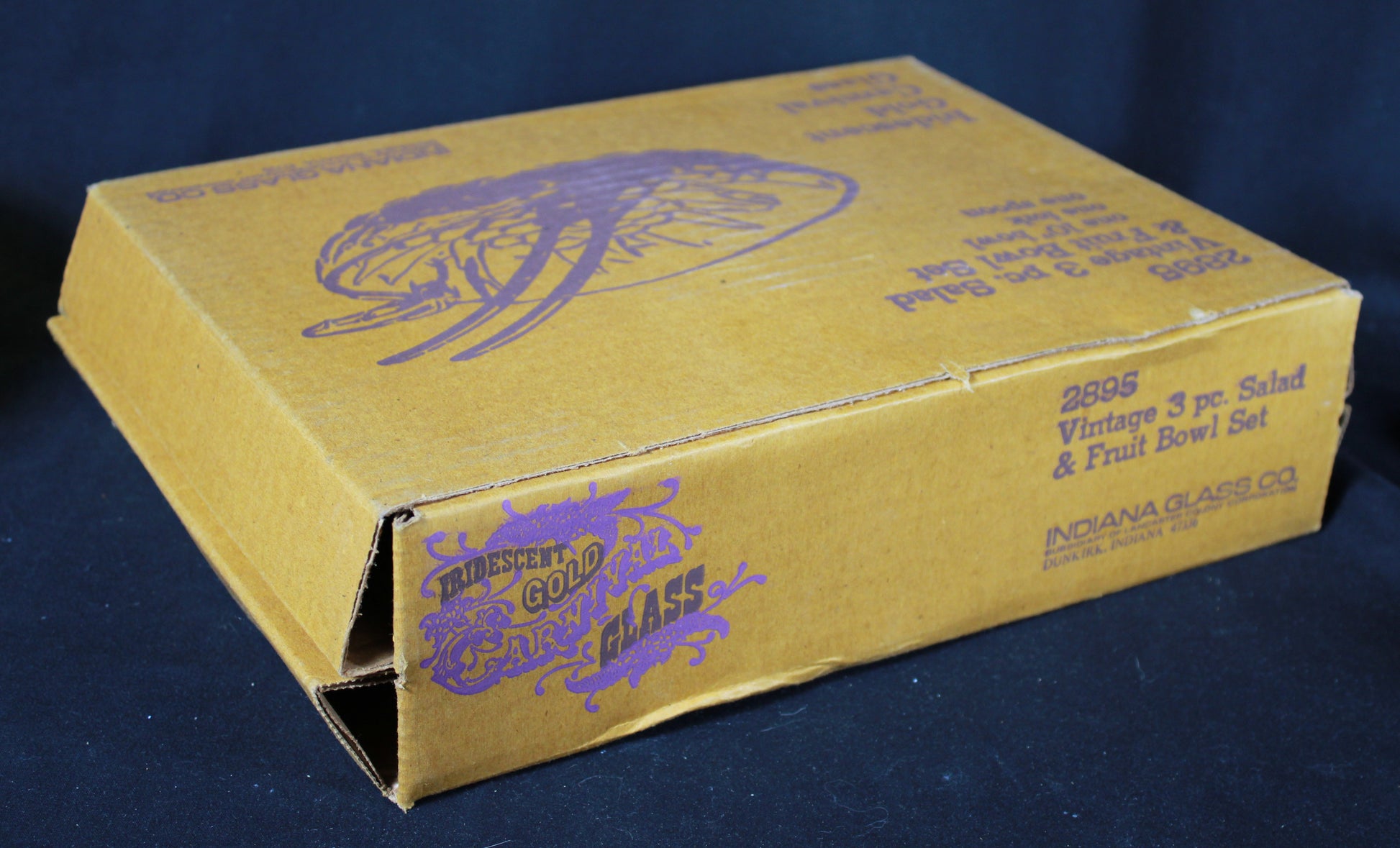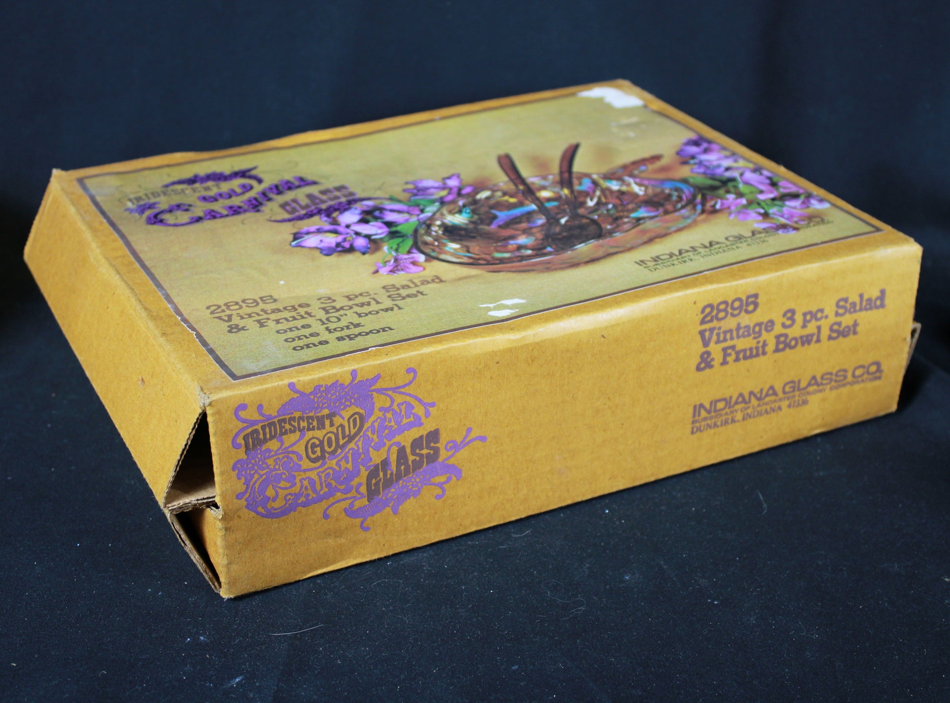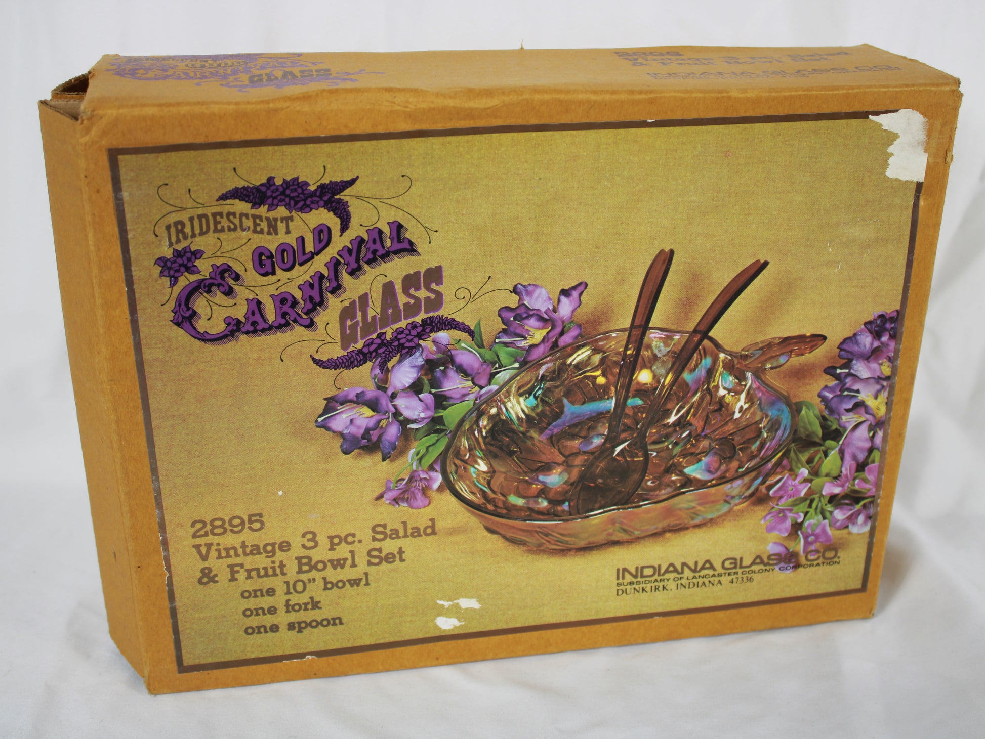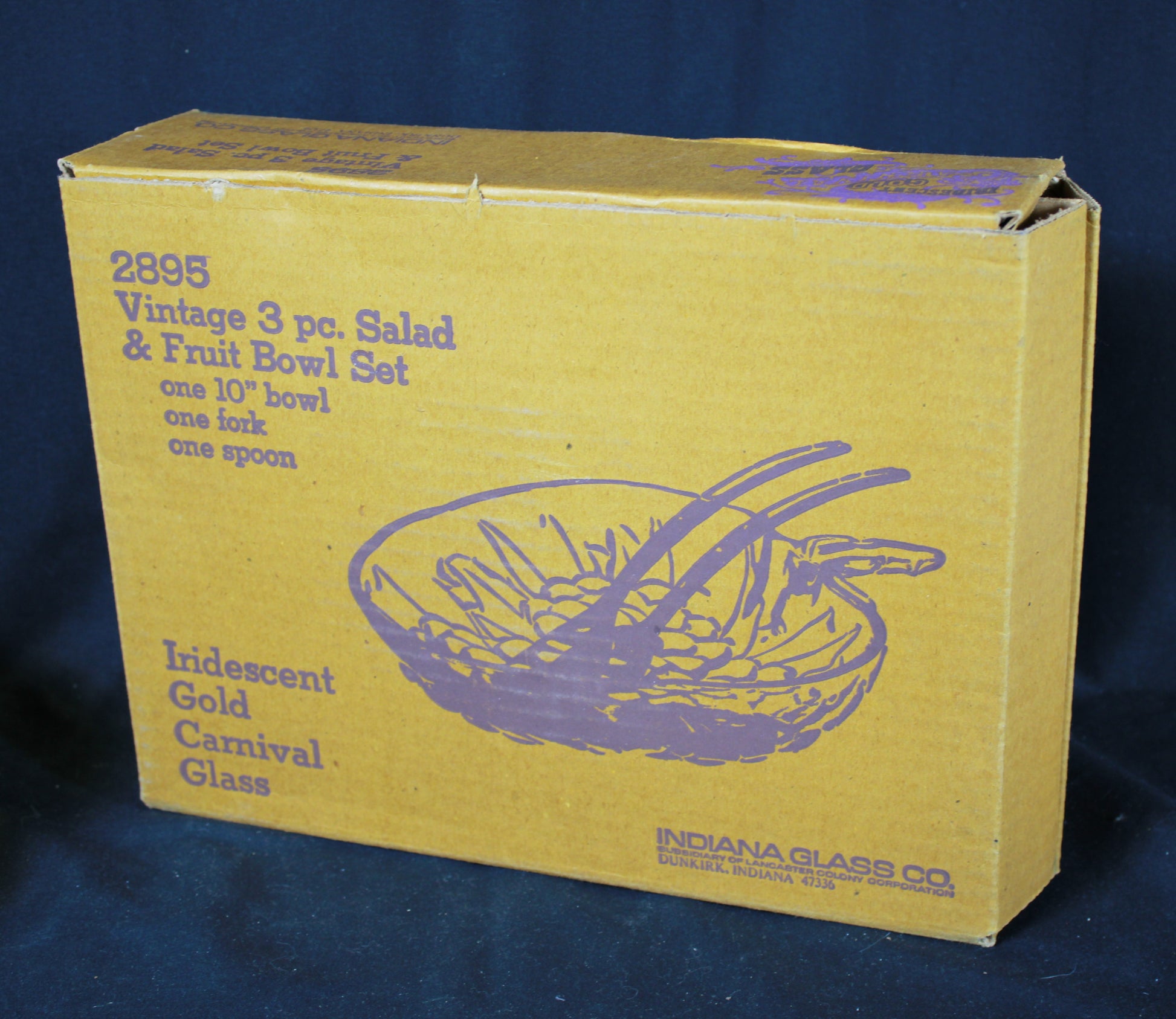 Vintage Indiana Glass Iridescent Gold Carnival Glass 3 Piece Salad and Fruit Bowl Set with Original Box