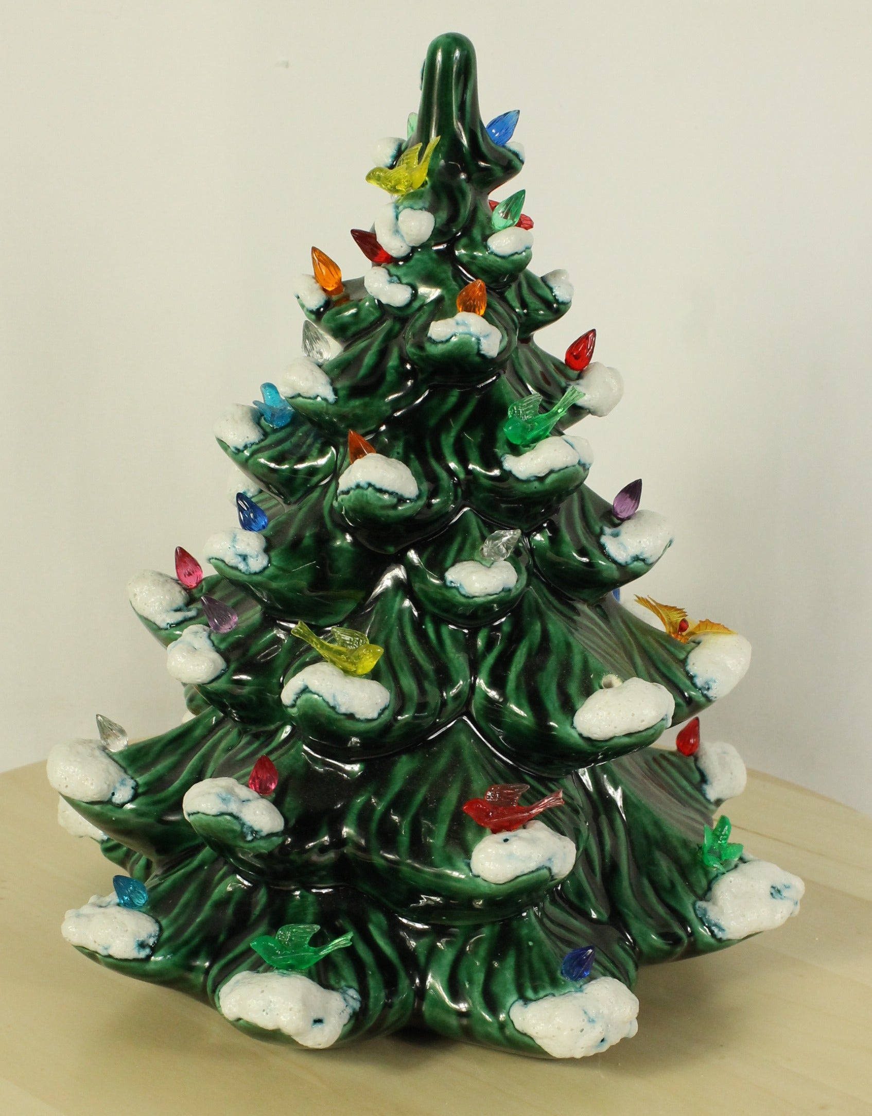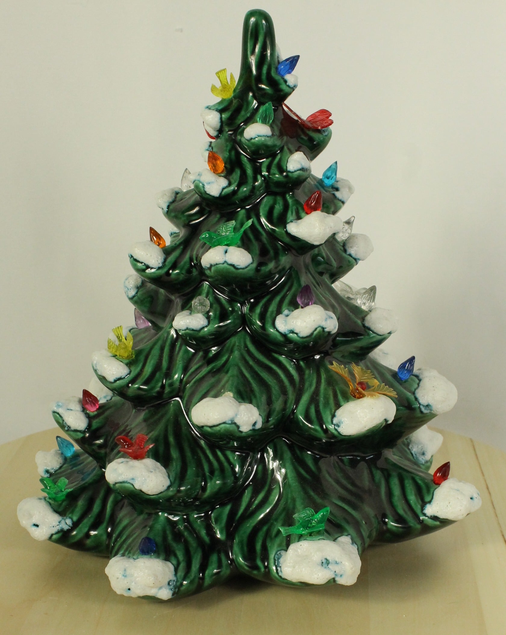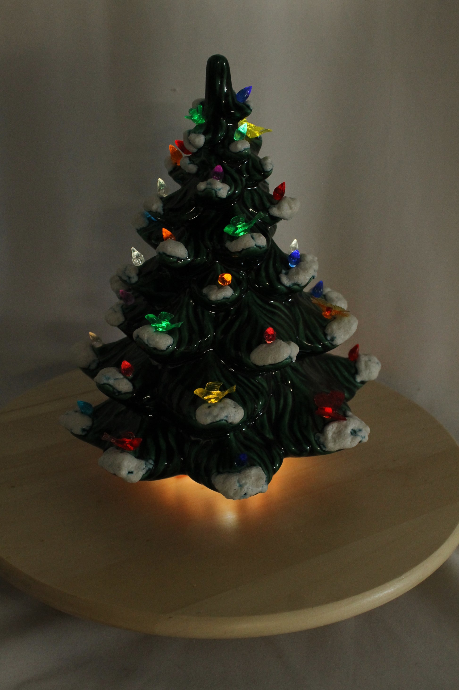 This charming vintage ceramic 11 inches tall (by 9 inches wide) Christmas tree top is a wonderful piece of nostalgic holiday decor, featuring green branches accented with white flocking that is in great vintage condition. The piece is being sold as the top section only, as it is missing its original base and lighting fixture. Please note one of the plastic 'bulbs' is missing and was unable to be replaced, but the piece is ready to be paired with a new light kit or used as an unlit accent. This is a great opportunity for crafters or collectors looking to complete or repair a traditional holiday favorite.